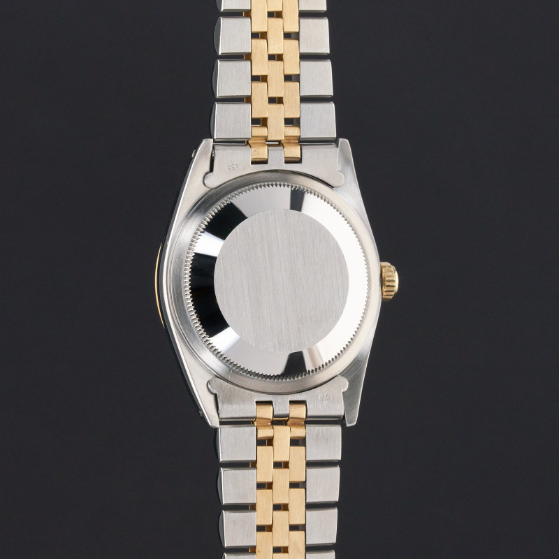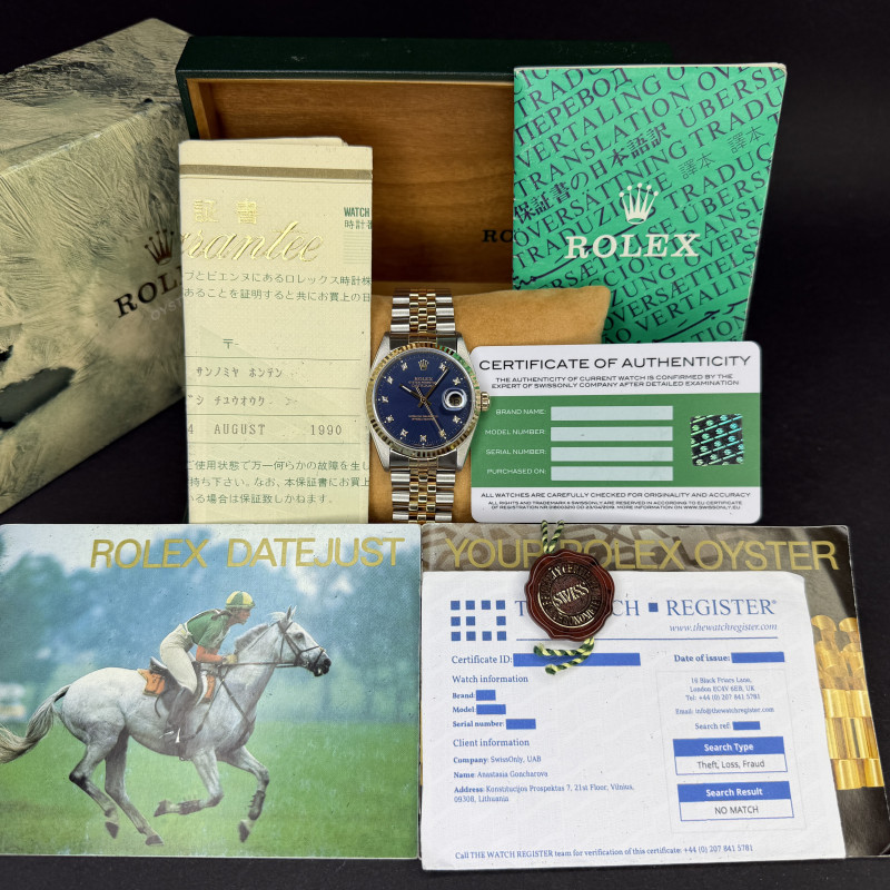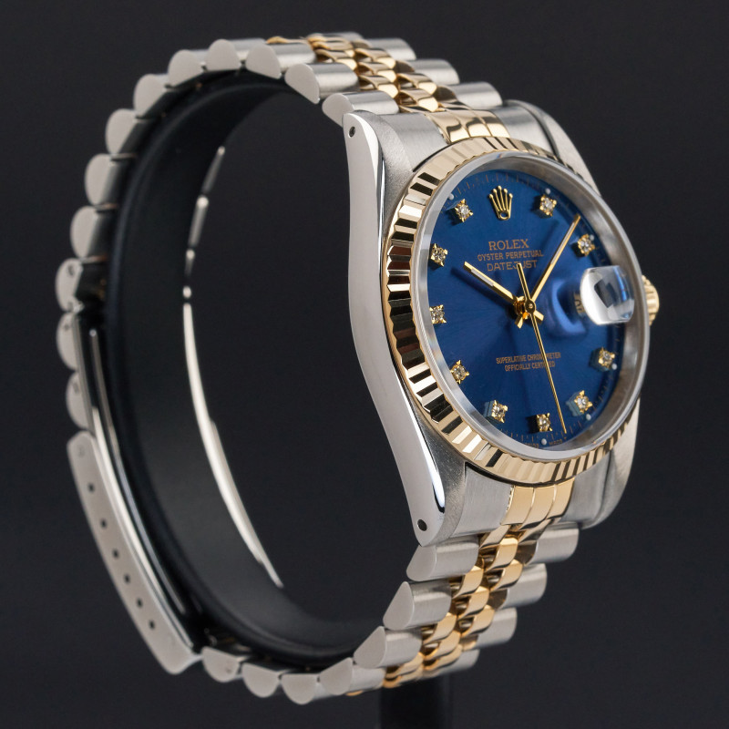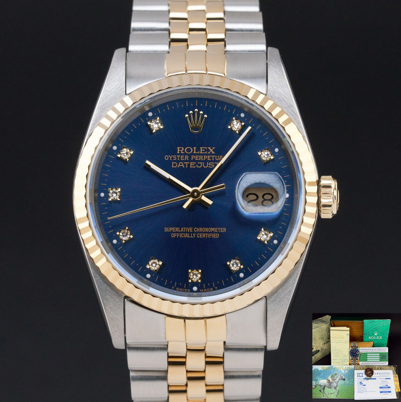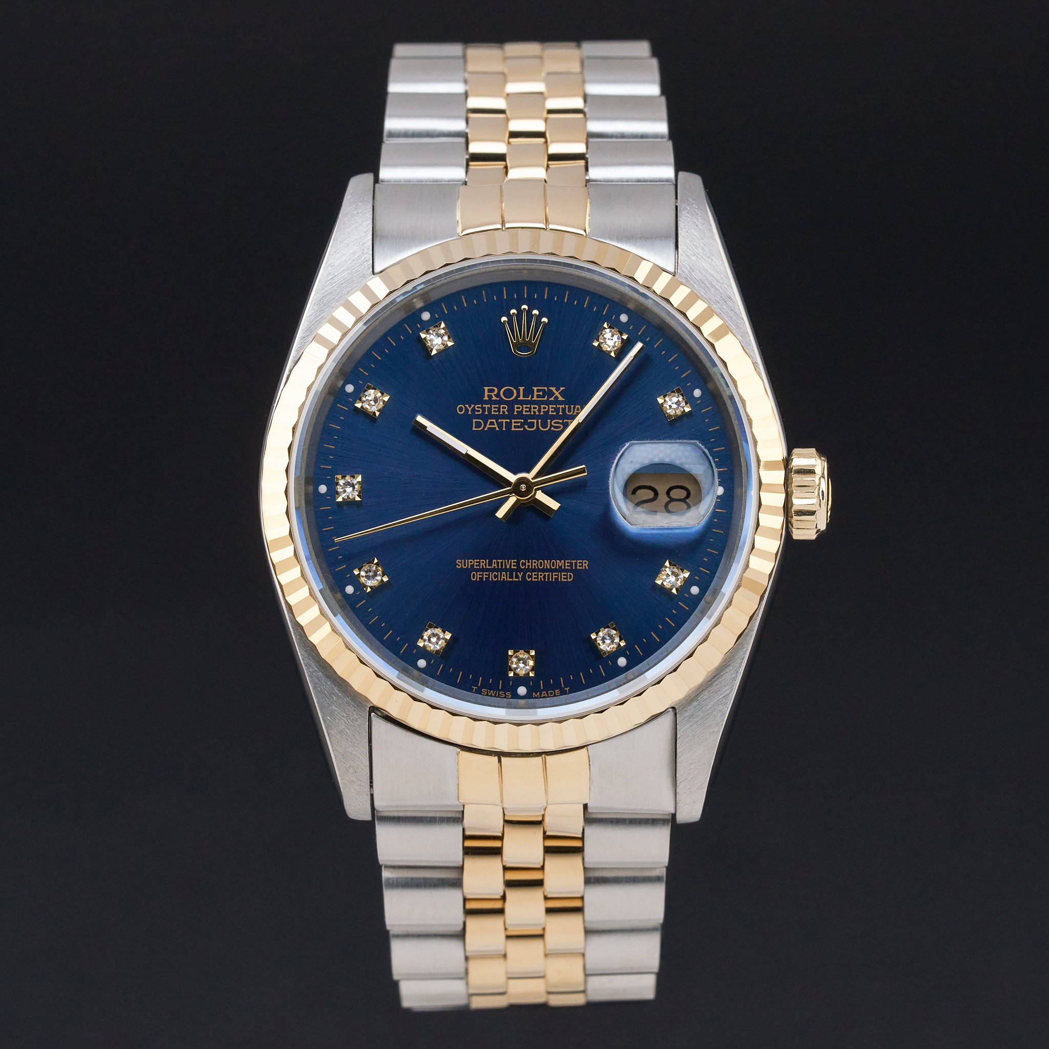 This Rolex Datejust 16233 features a Blue small diamond dial and is crafted from 18K yellow gold and stainless steel, with a production year of 1989.