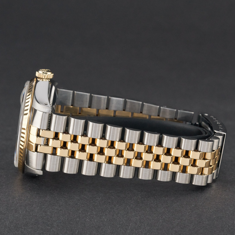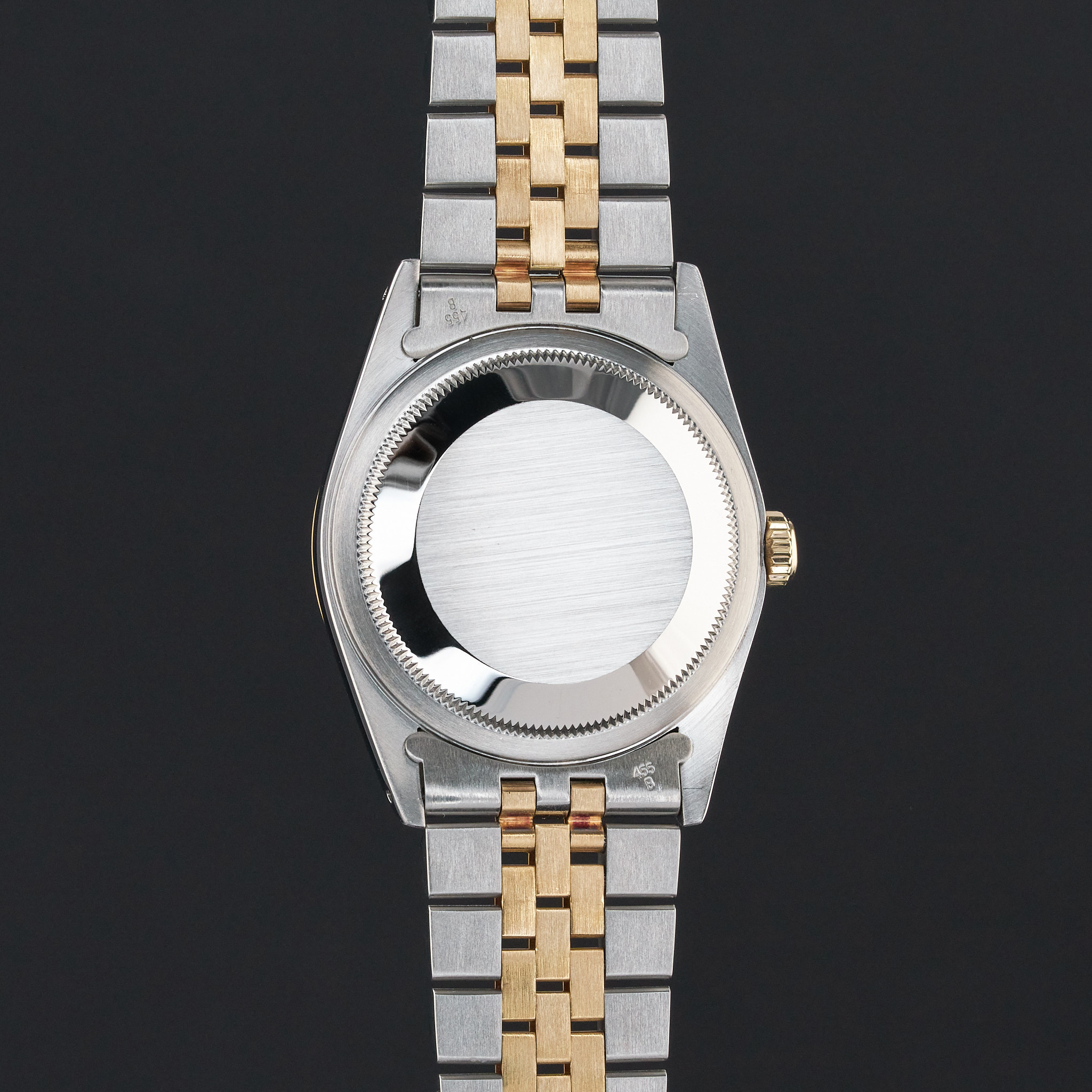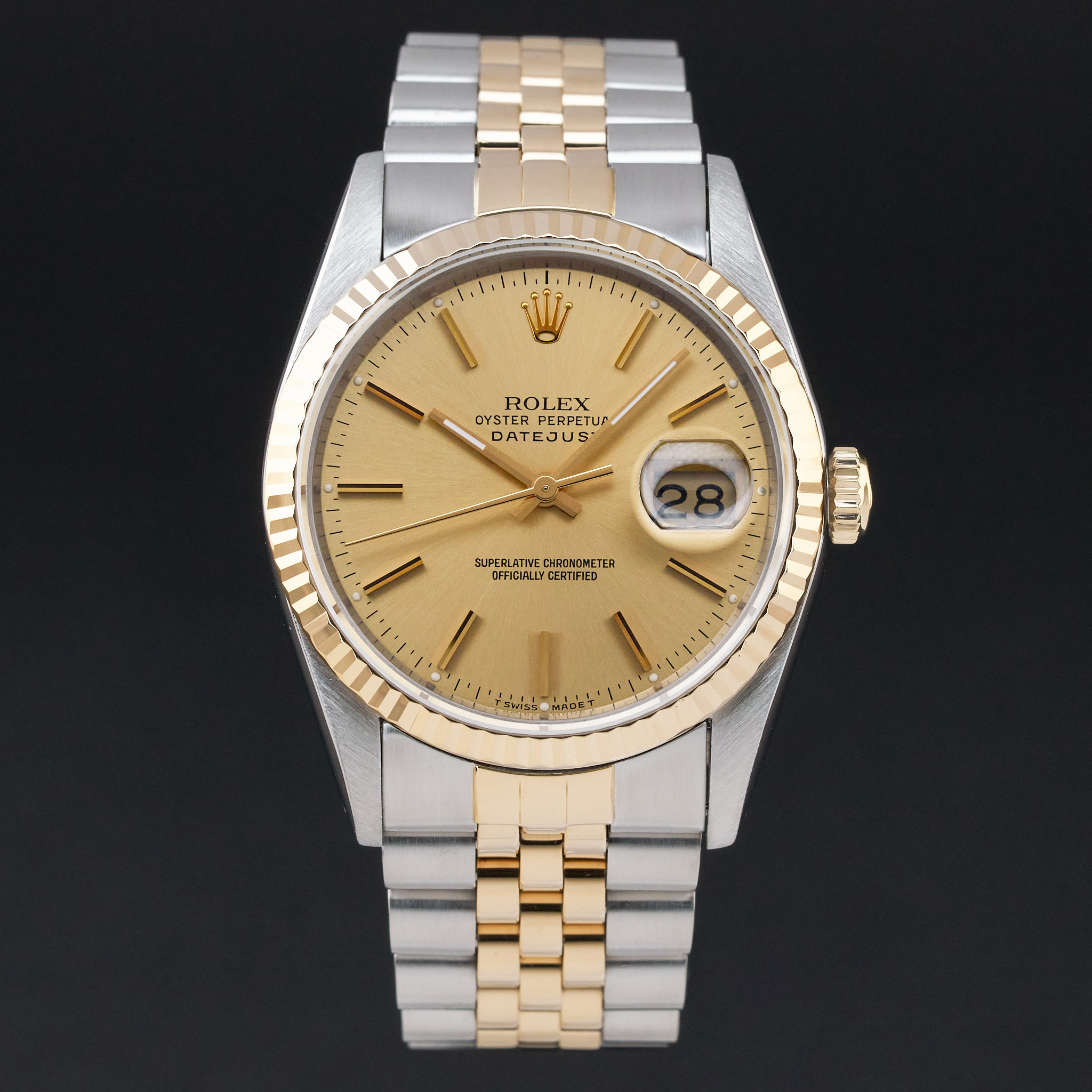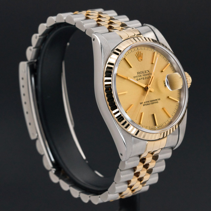 This Rolex Datejust 16233 features a Champagne dial and is crafted from 18K yellow gold and stainless steel, with a production year of 1989.