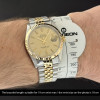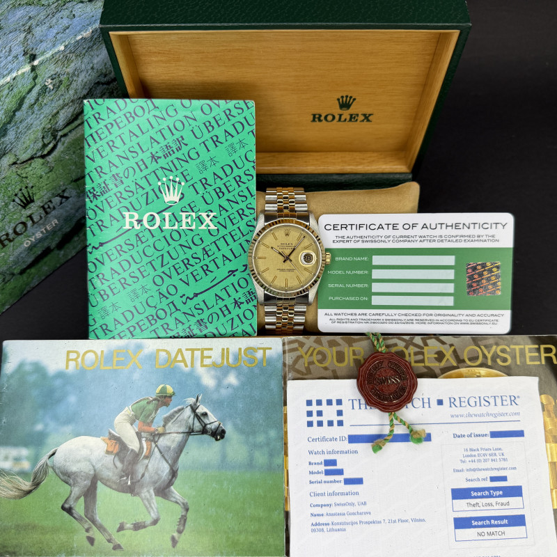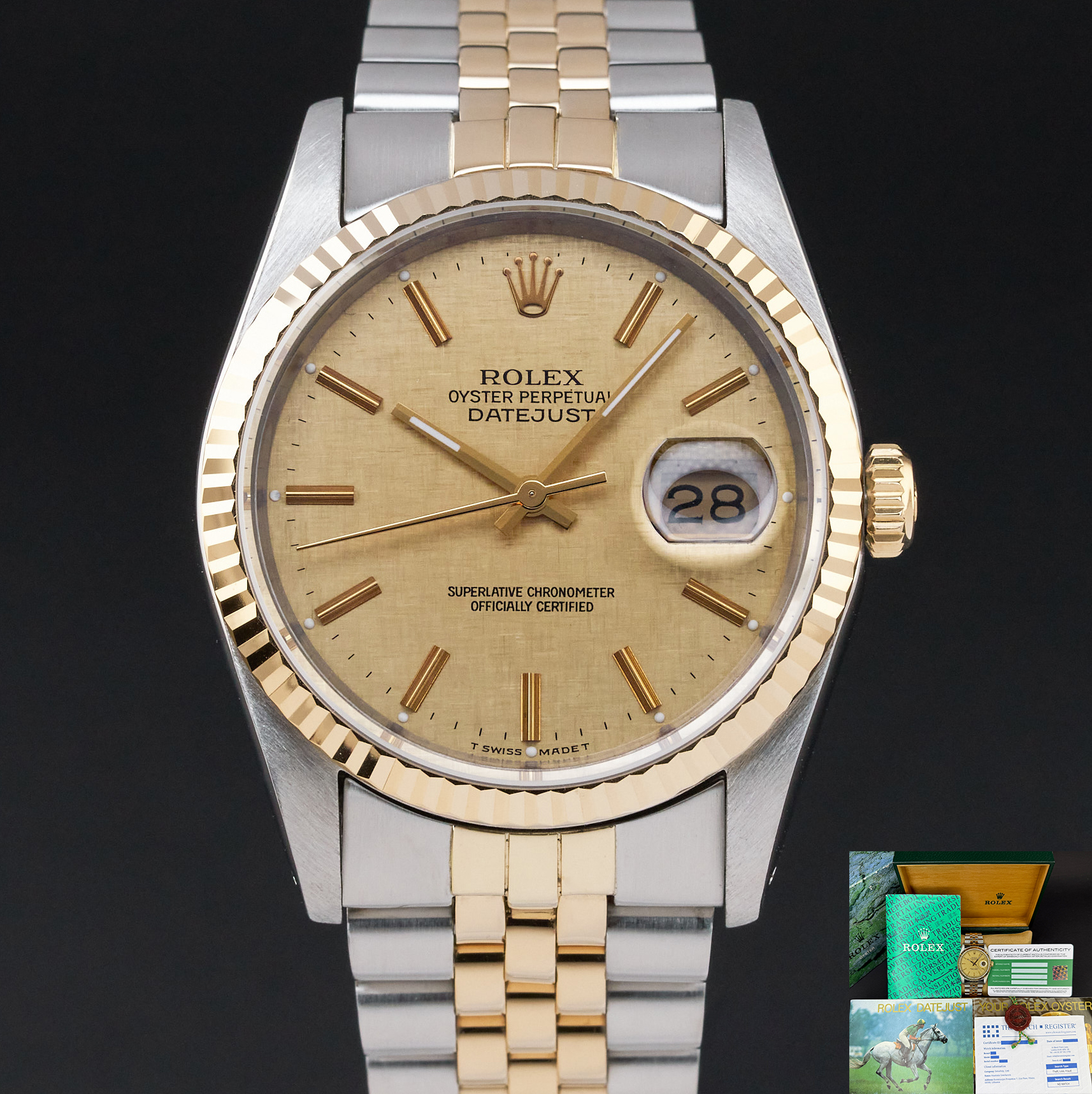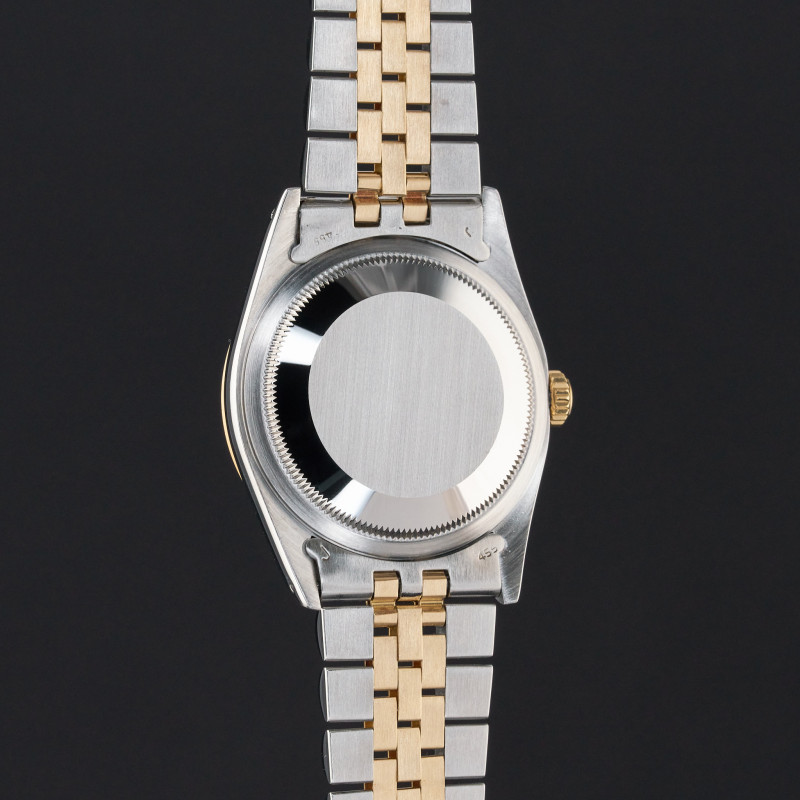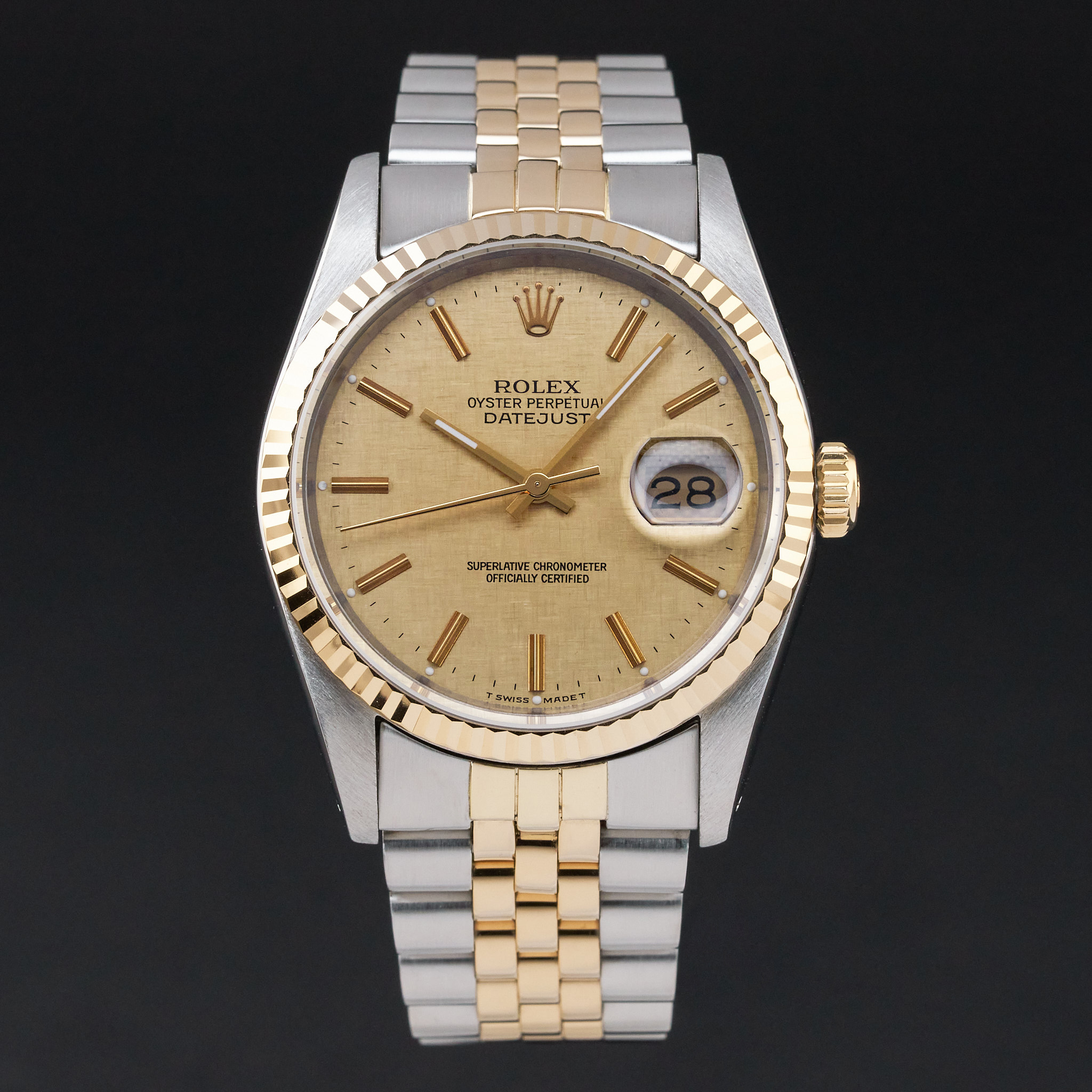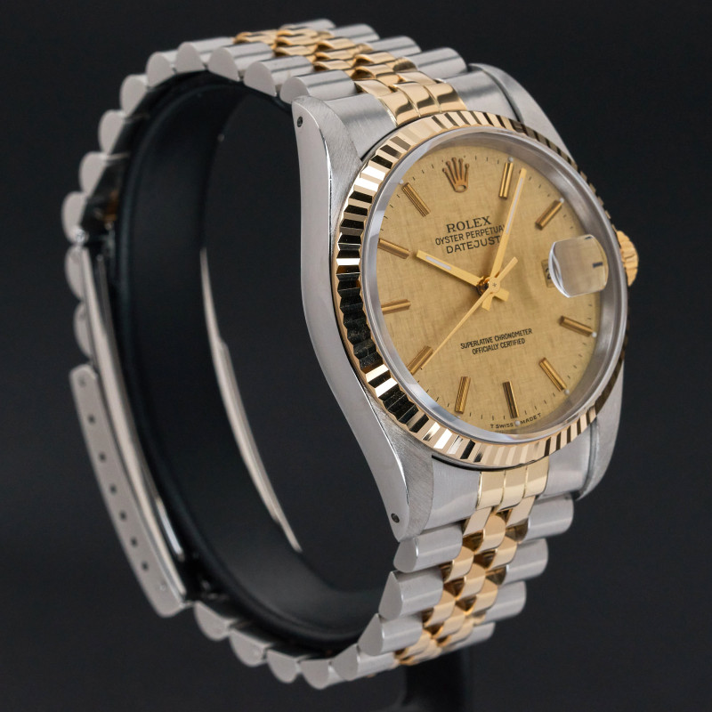 This Rolex Datejust 16233 features a Champagne linen dial and is crafted from 18K yellow gold and stainless steel, with a production year of 1989.