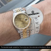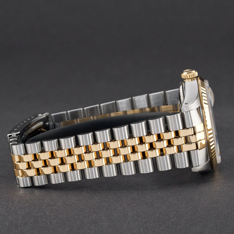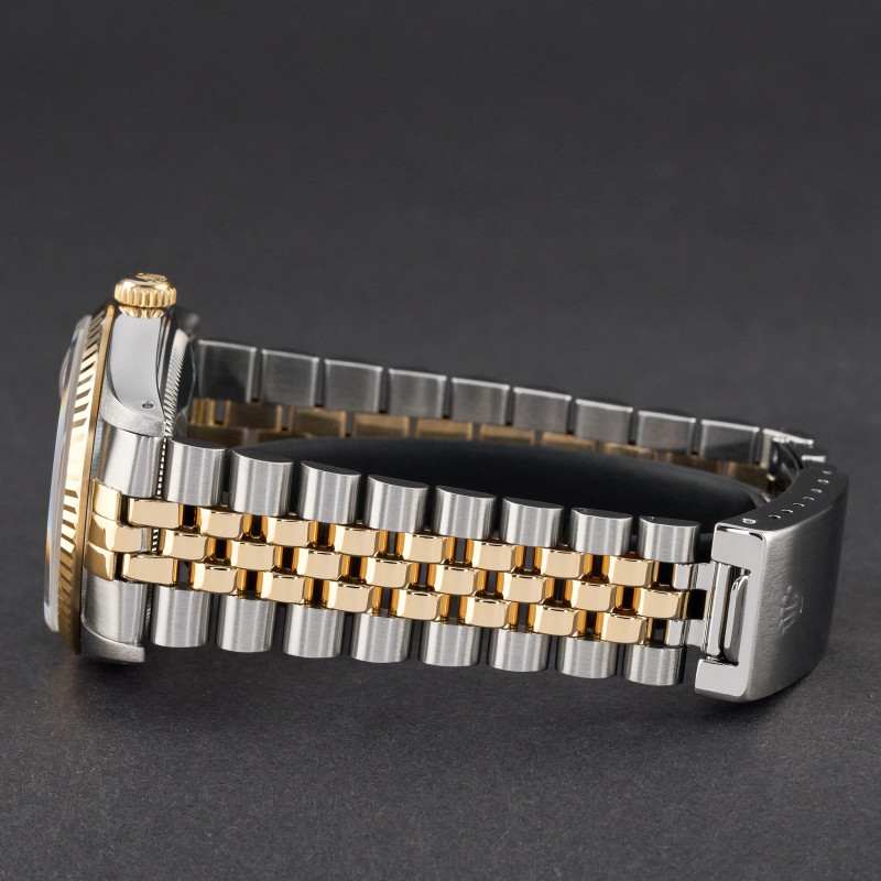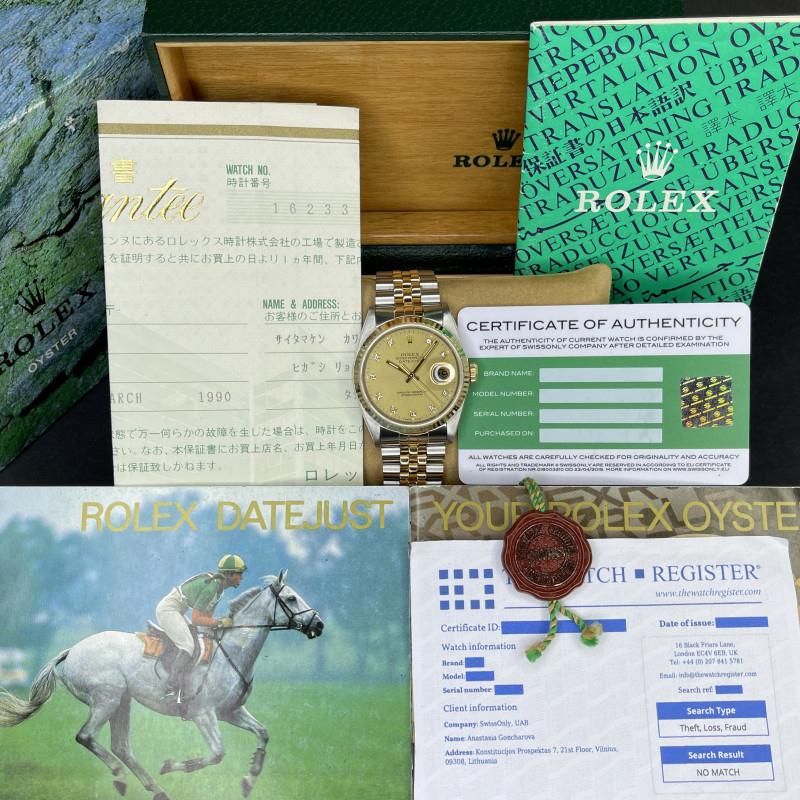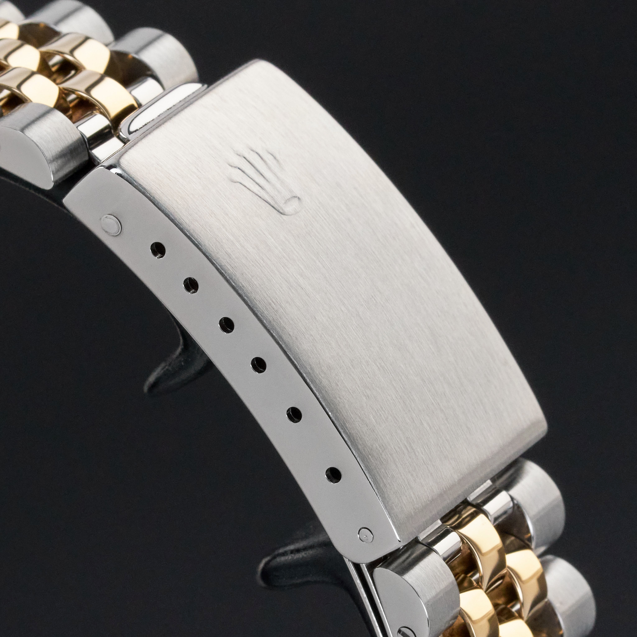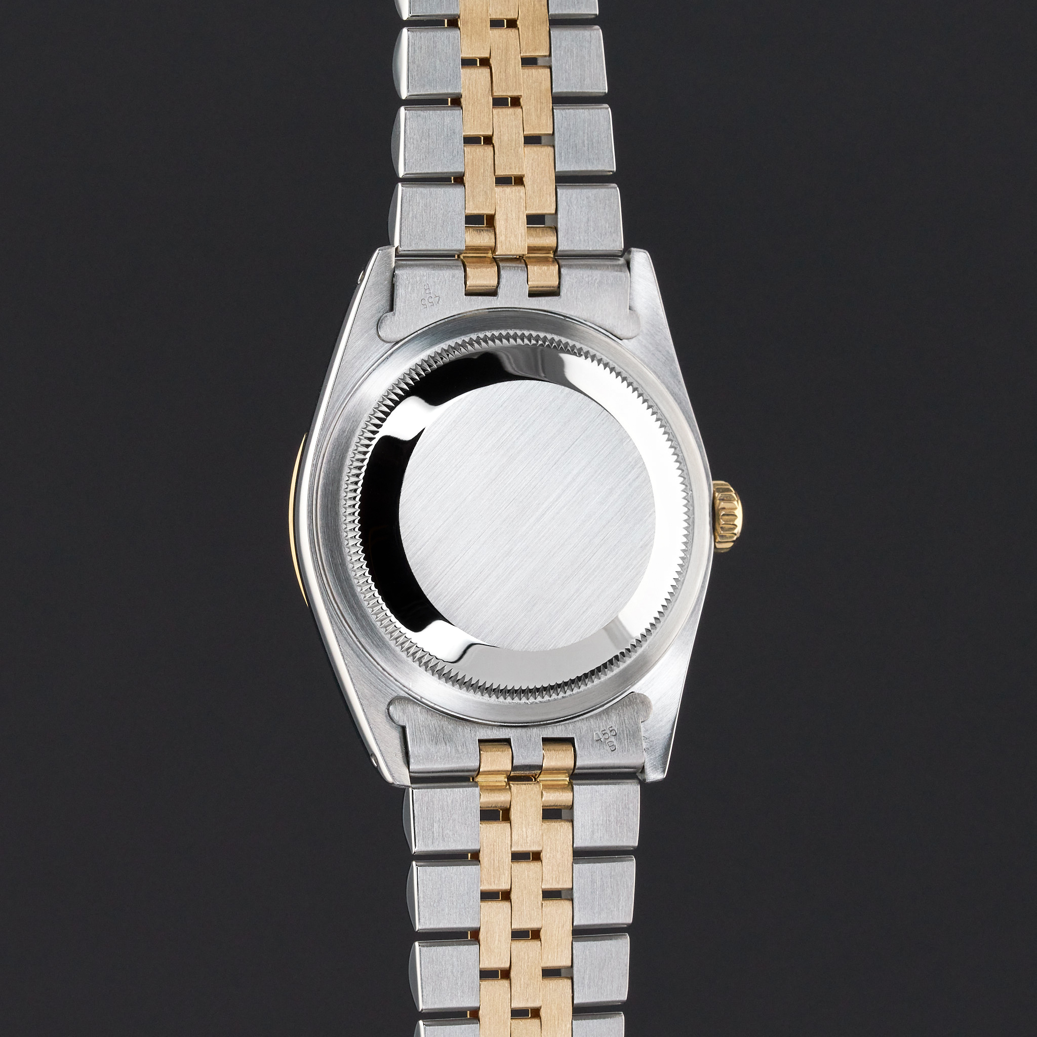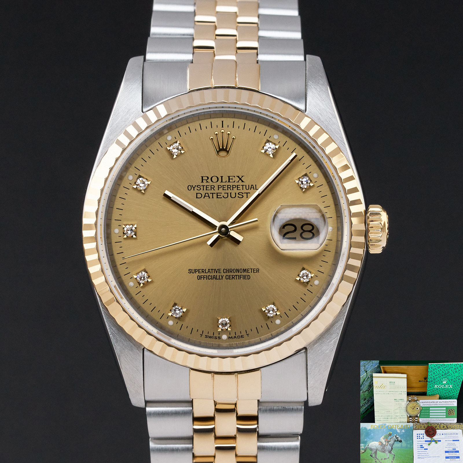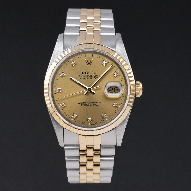This Rolex Datejust 16233 features a Champagne small diamond dial and is crafted from 18K yellow gold and stainless steel, with a production year of 1989.