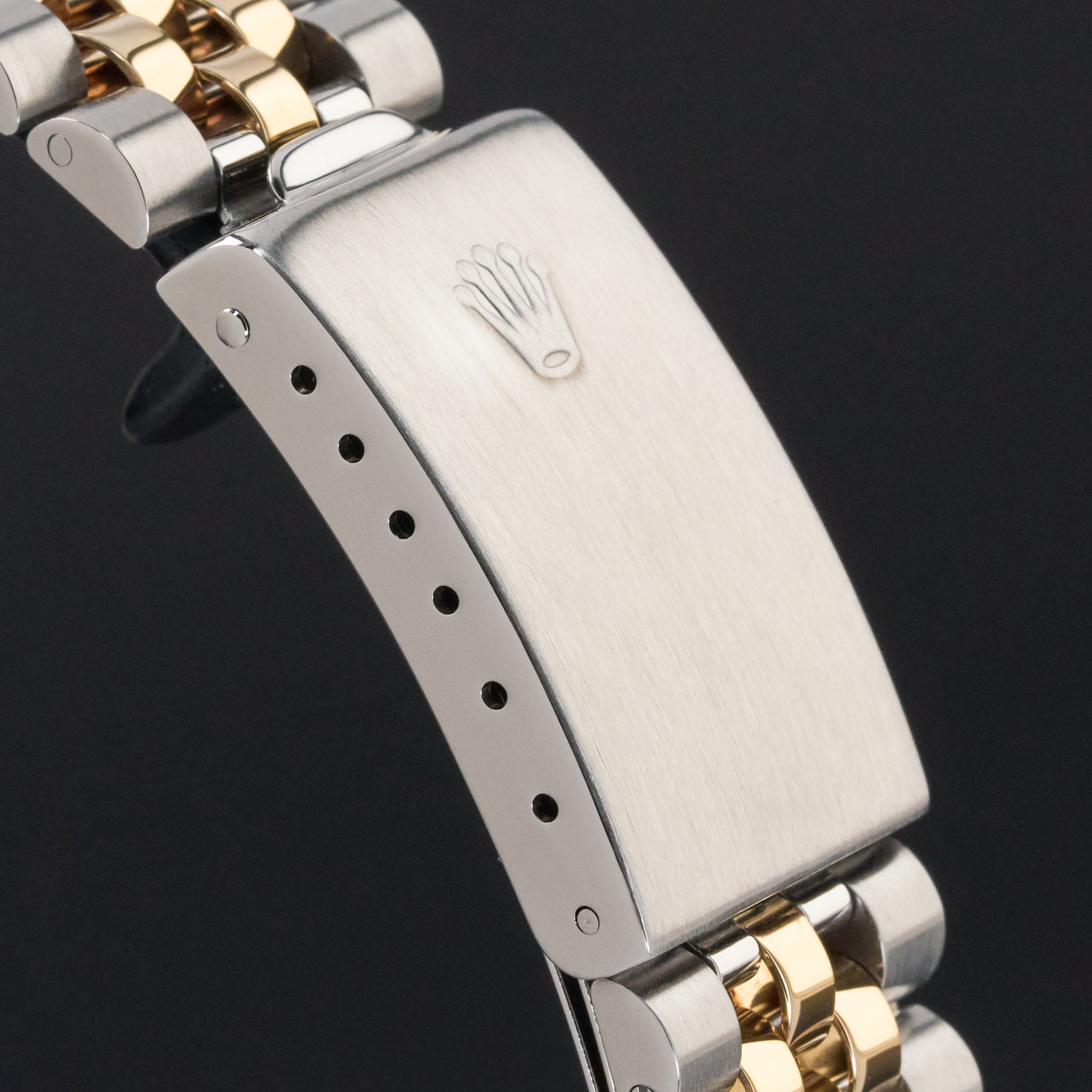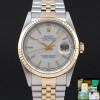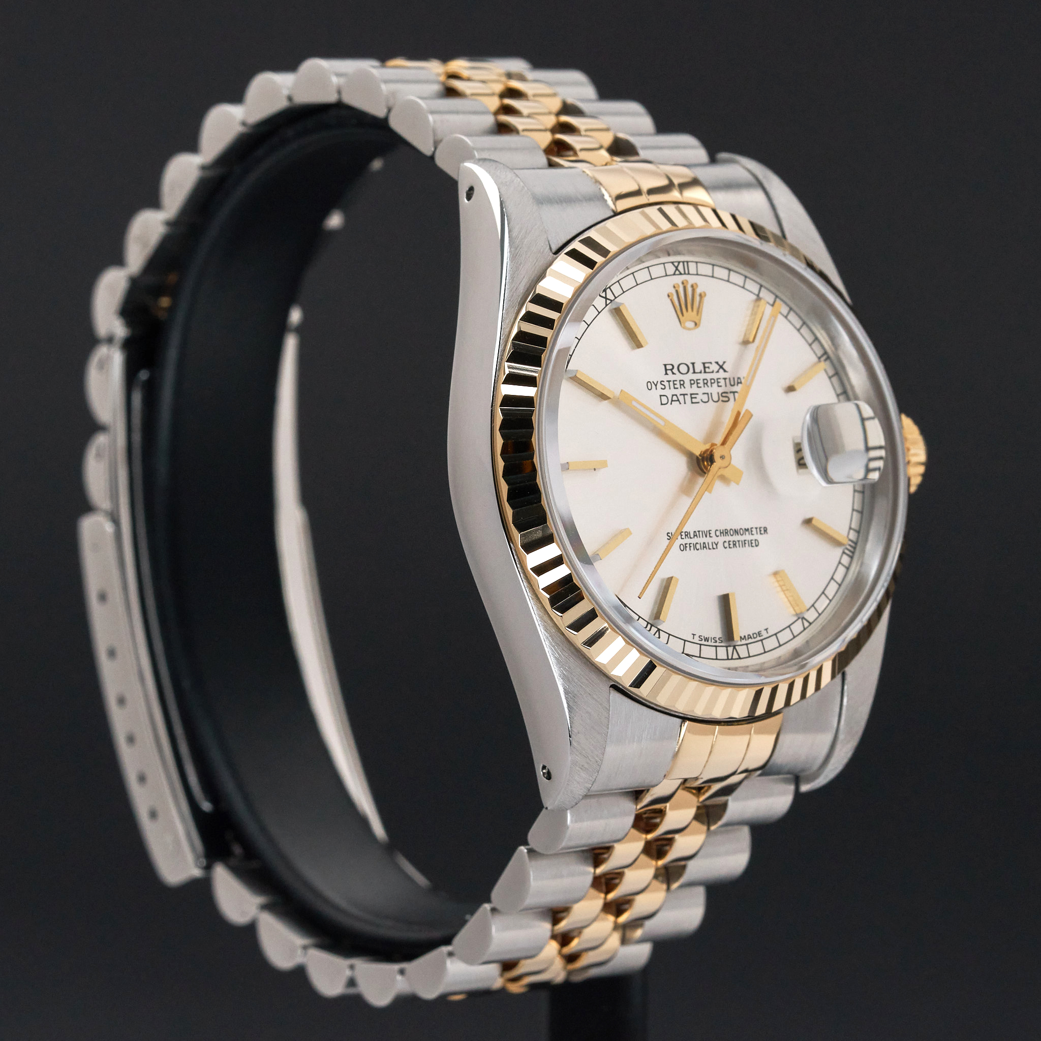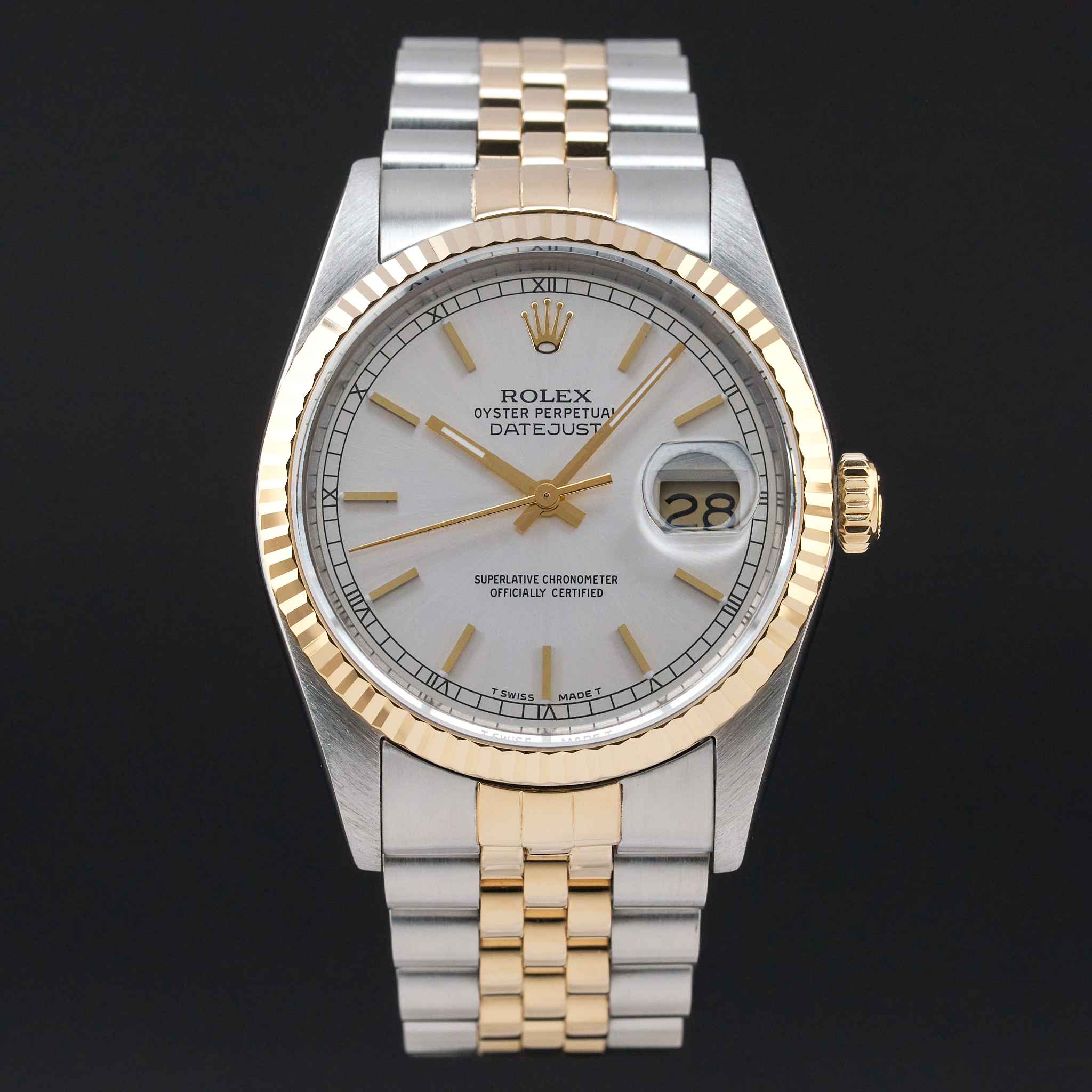 This Rolex Datejust 16233 features a Silver dial and is crafted from 18K yellow gold and stainless steel, with a production year of 1990.
