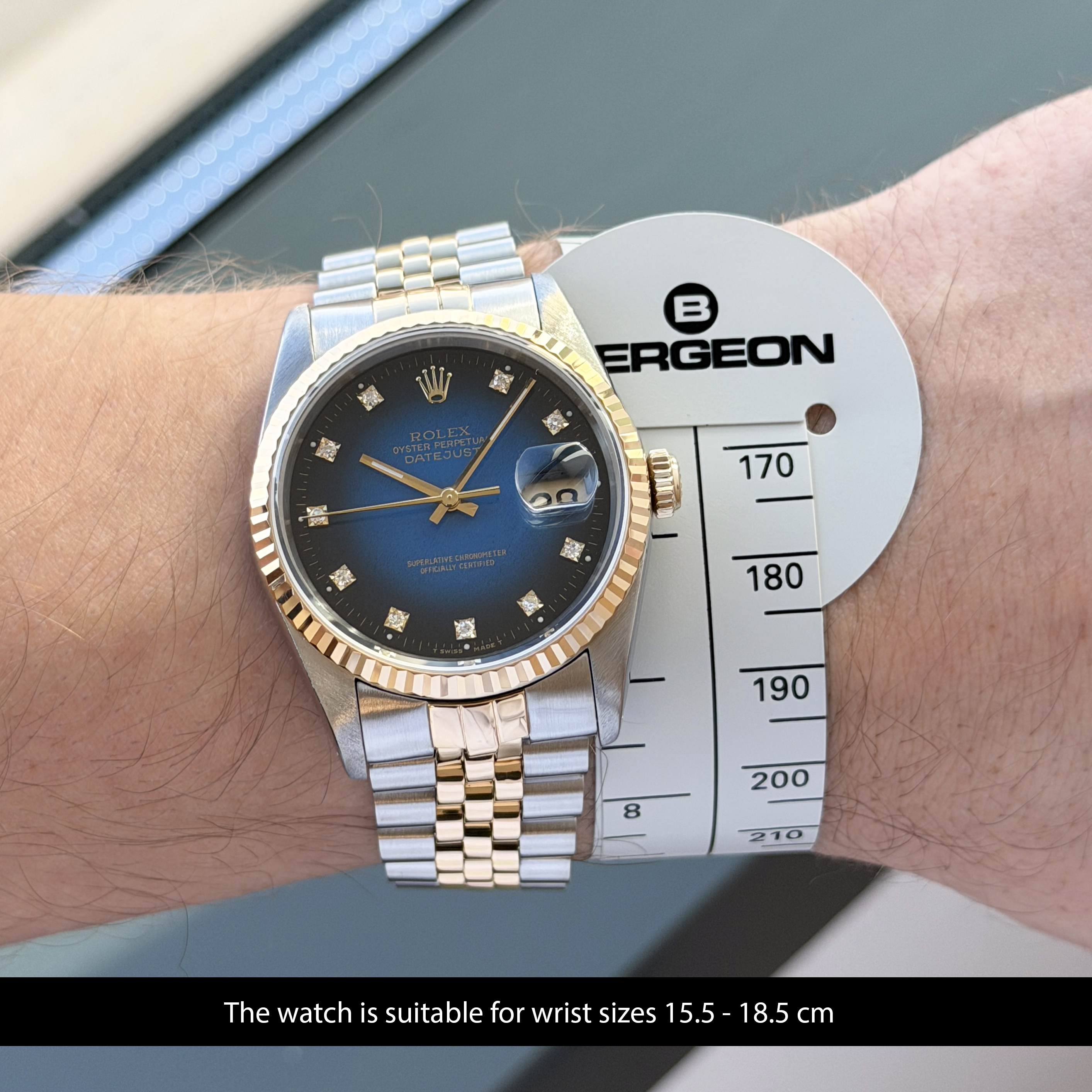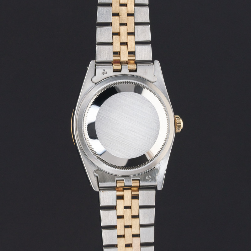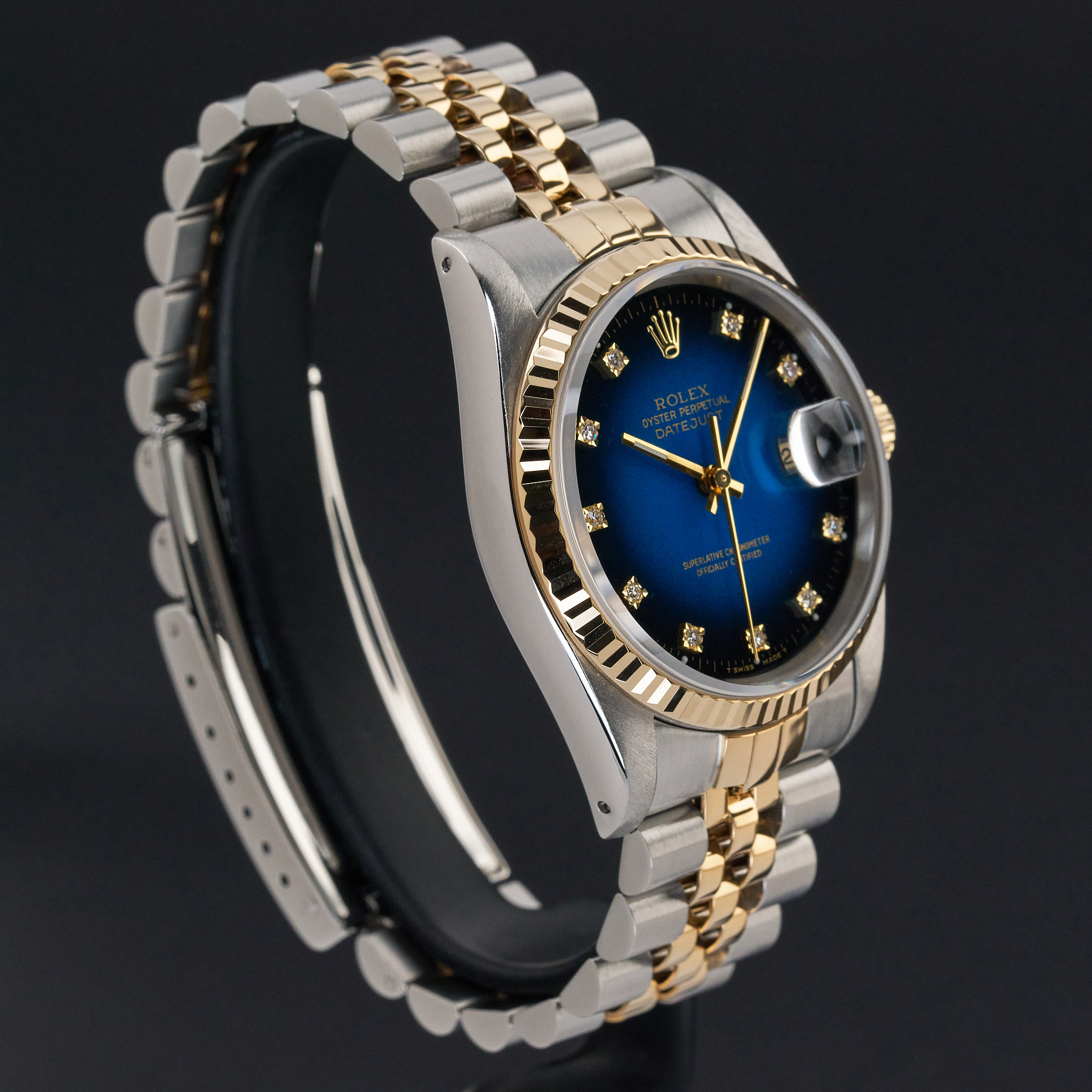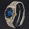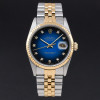This Rolex Datejust 16233 features a Blue vignette small diamond dial and is crafted from 18K yellow gold and stainless steel, with a production year of 1990.