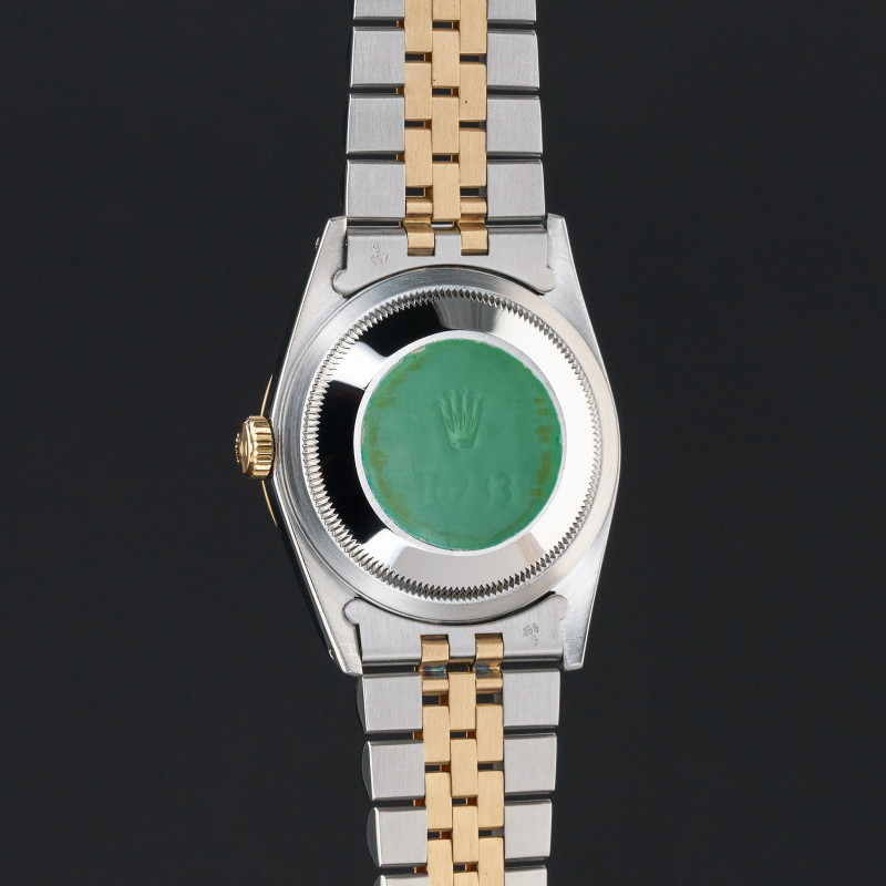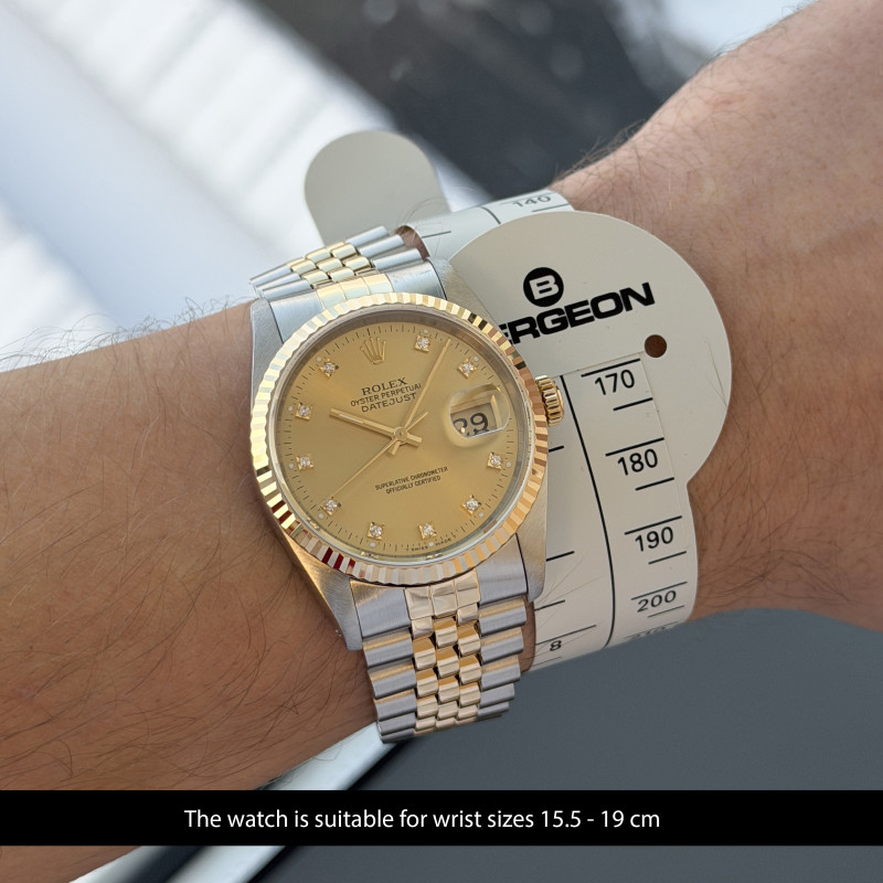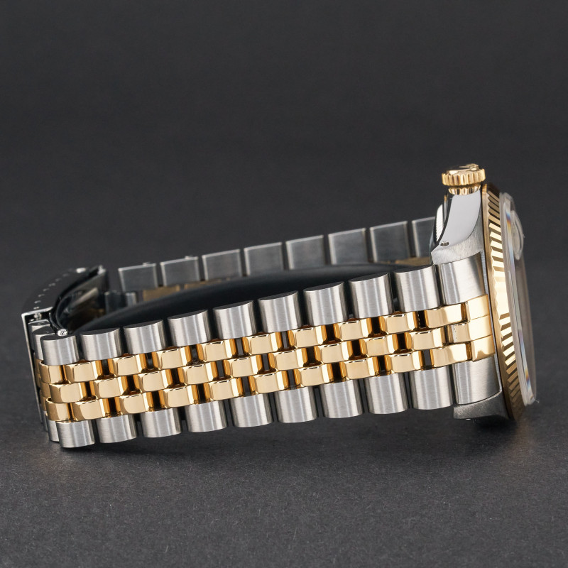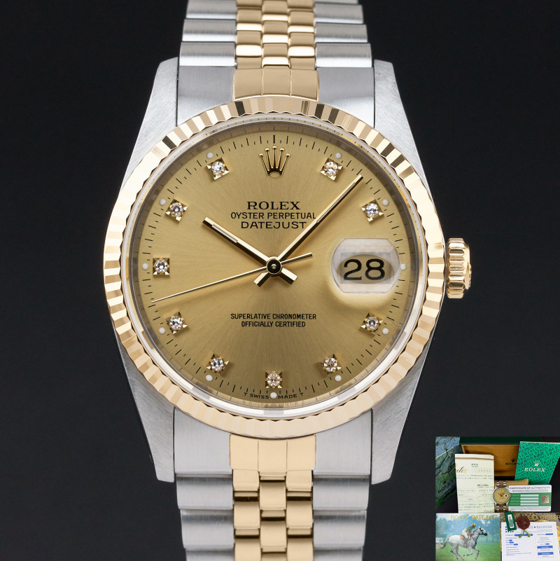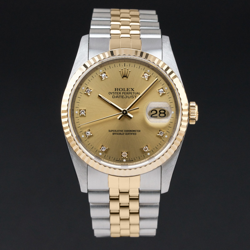 This Rolex Datejust 16233 features a Champagne small diamond dial and is crafted from 18K yellow gold and stainless steel, with a production year of 1990.