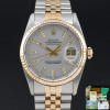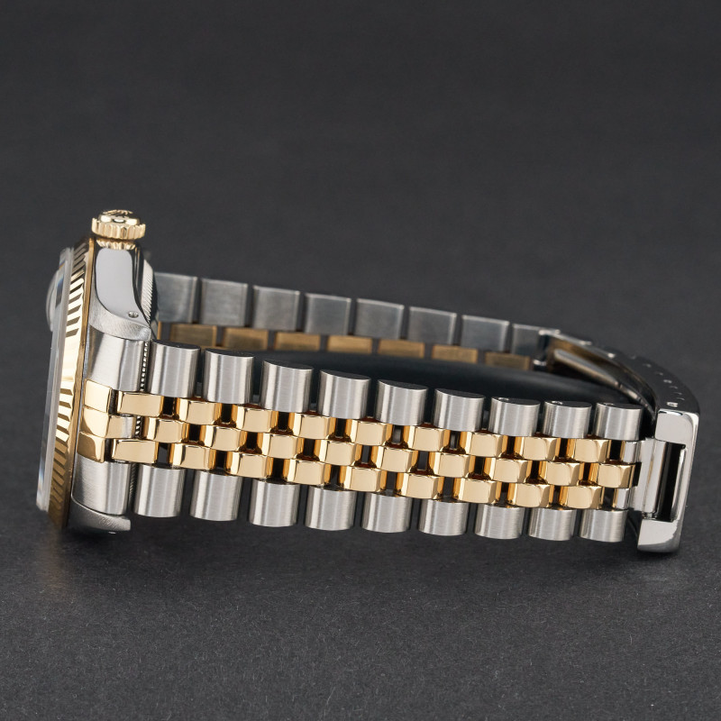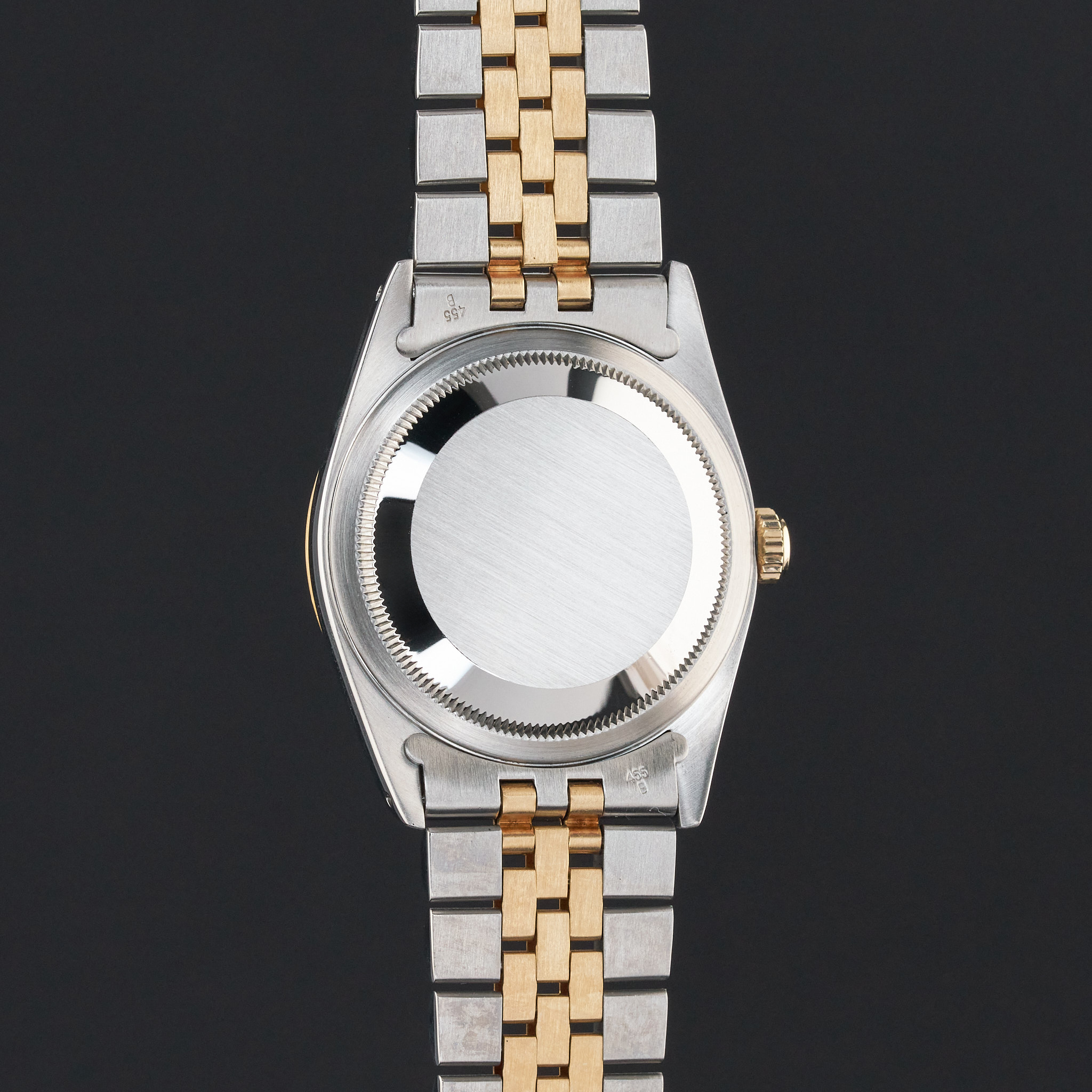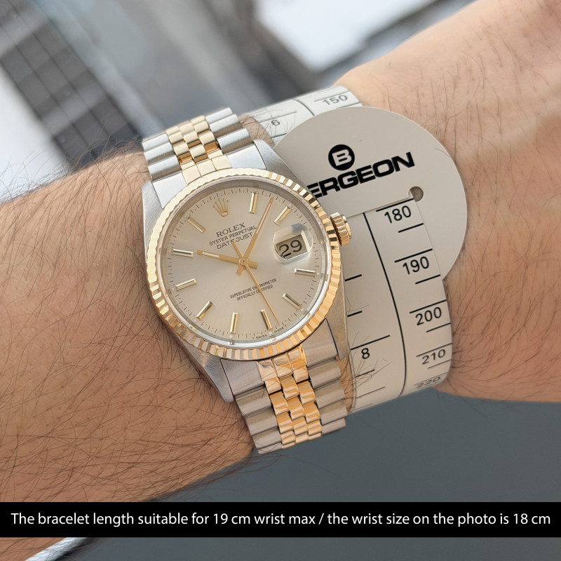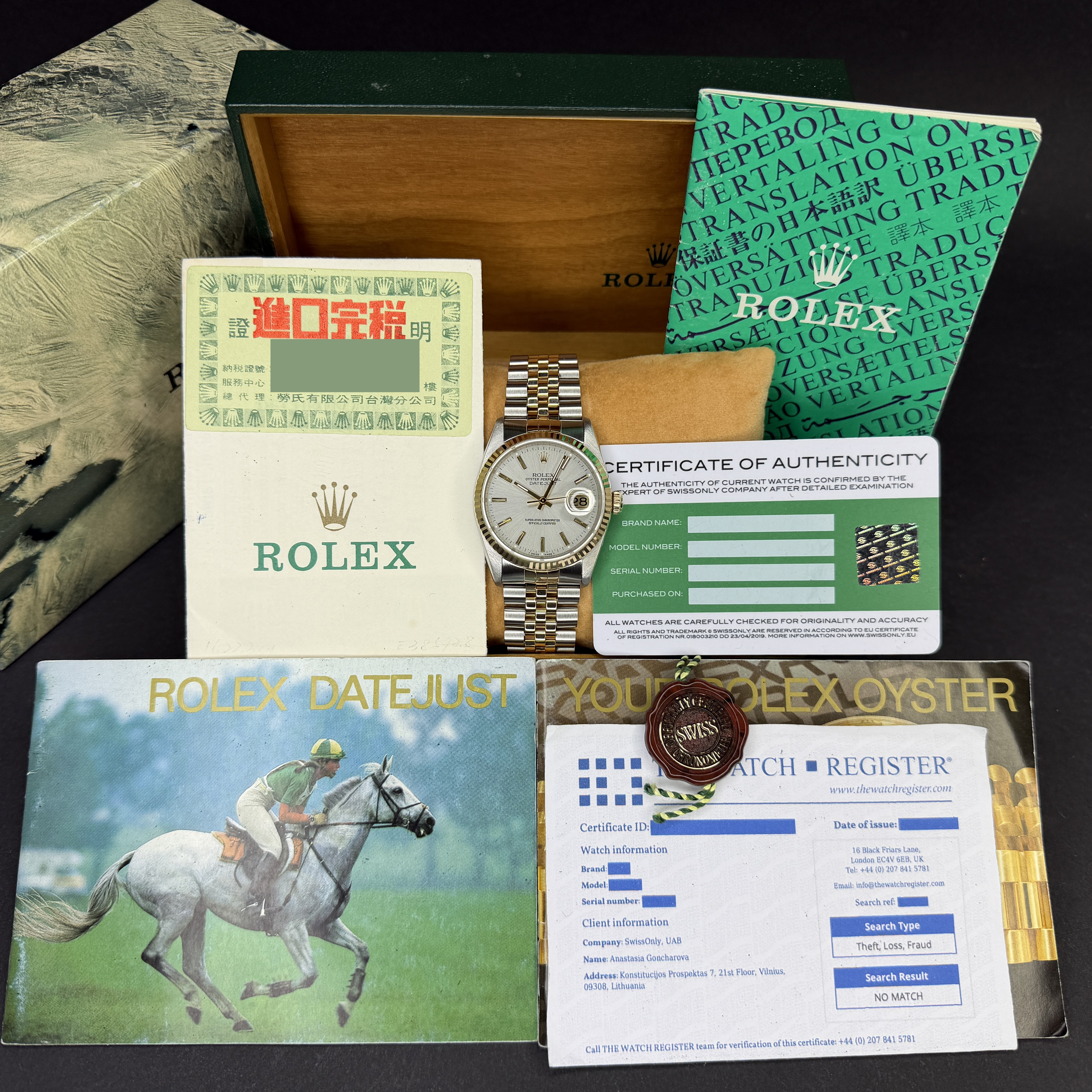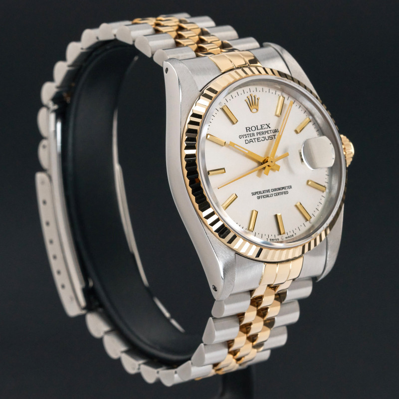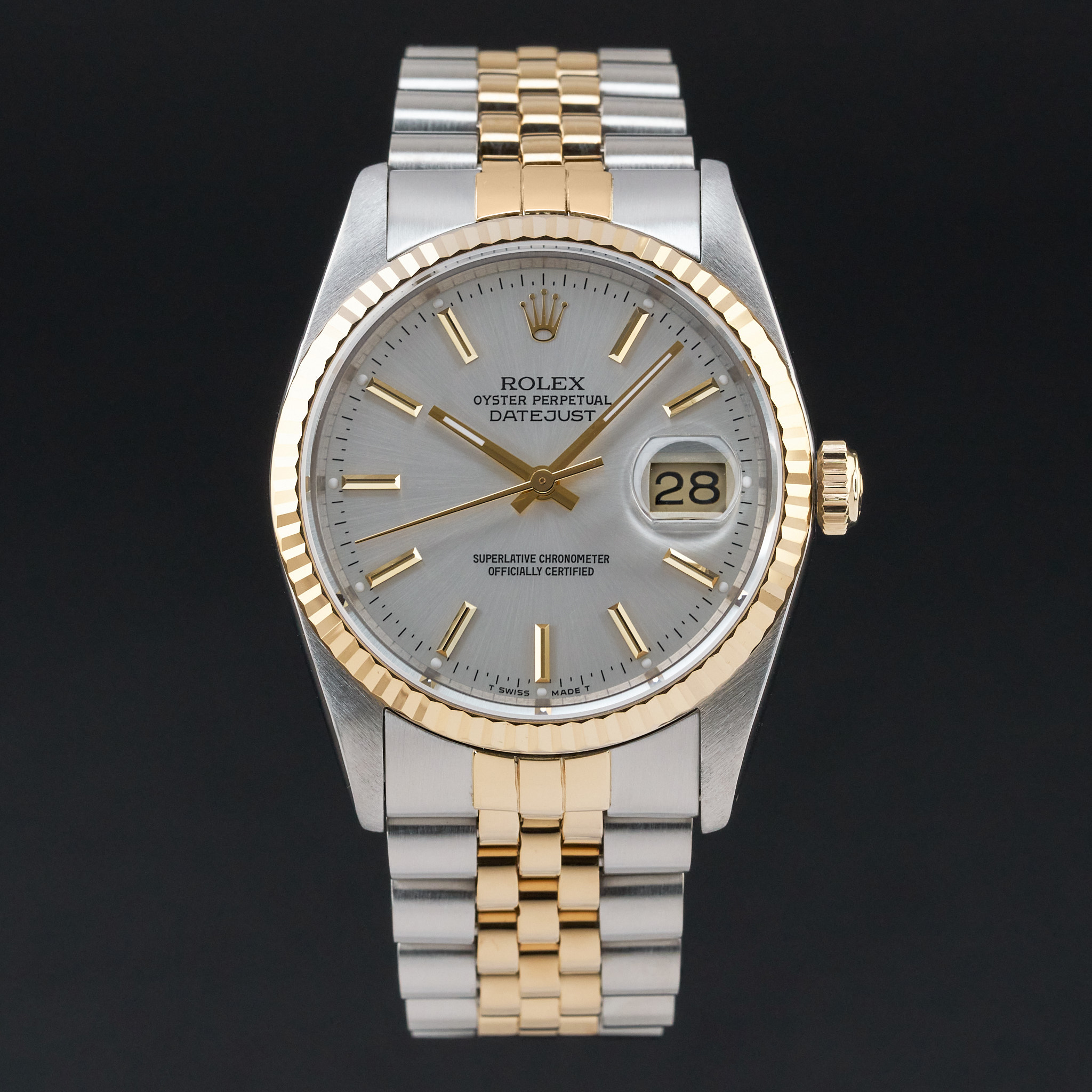 This Rolex Datejust 16233 features a Silver dial and is crafted from 18K yellow gold and stainless steel, with a production year of 1990.