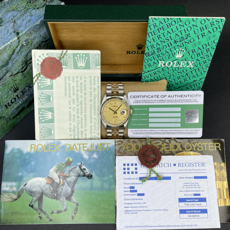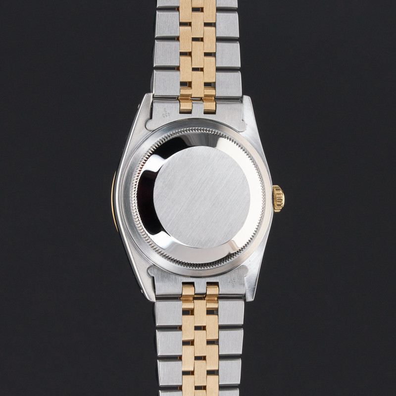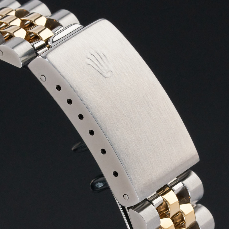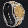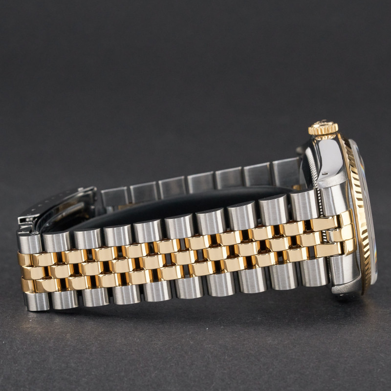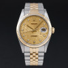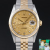 This Rolex Datejust 16233 features a Champagne jubilee small diamond dial and is crafted from 18K yellow gold and stainless steel, with a production year of 1991.