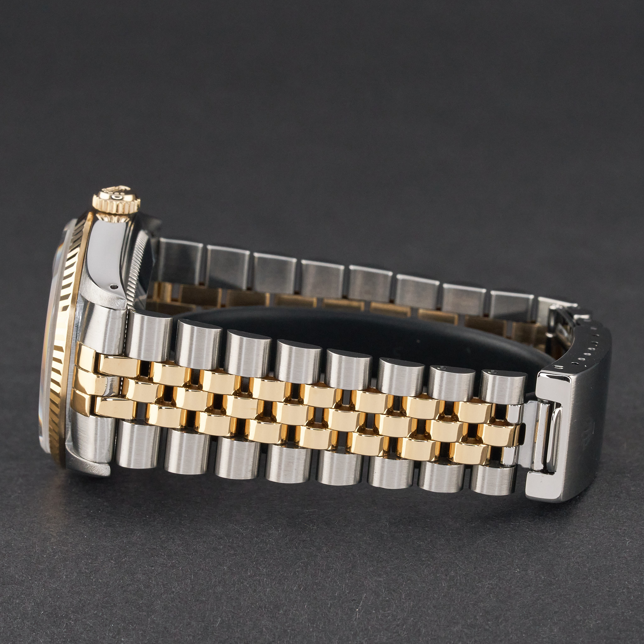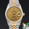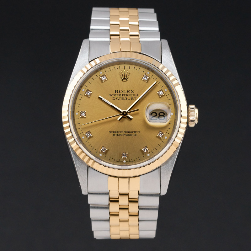 This Rolex Datejust 16233 features a Champagne small diamond dial and is crafted from 18K yellow gold and stainless steel, with a production year of 1991.