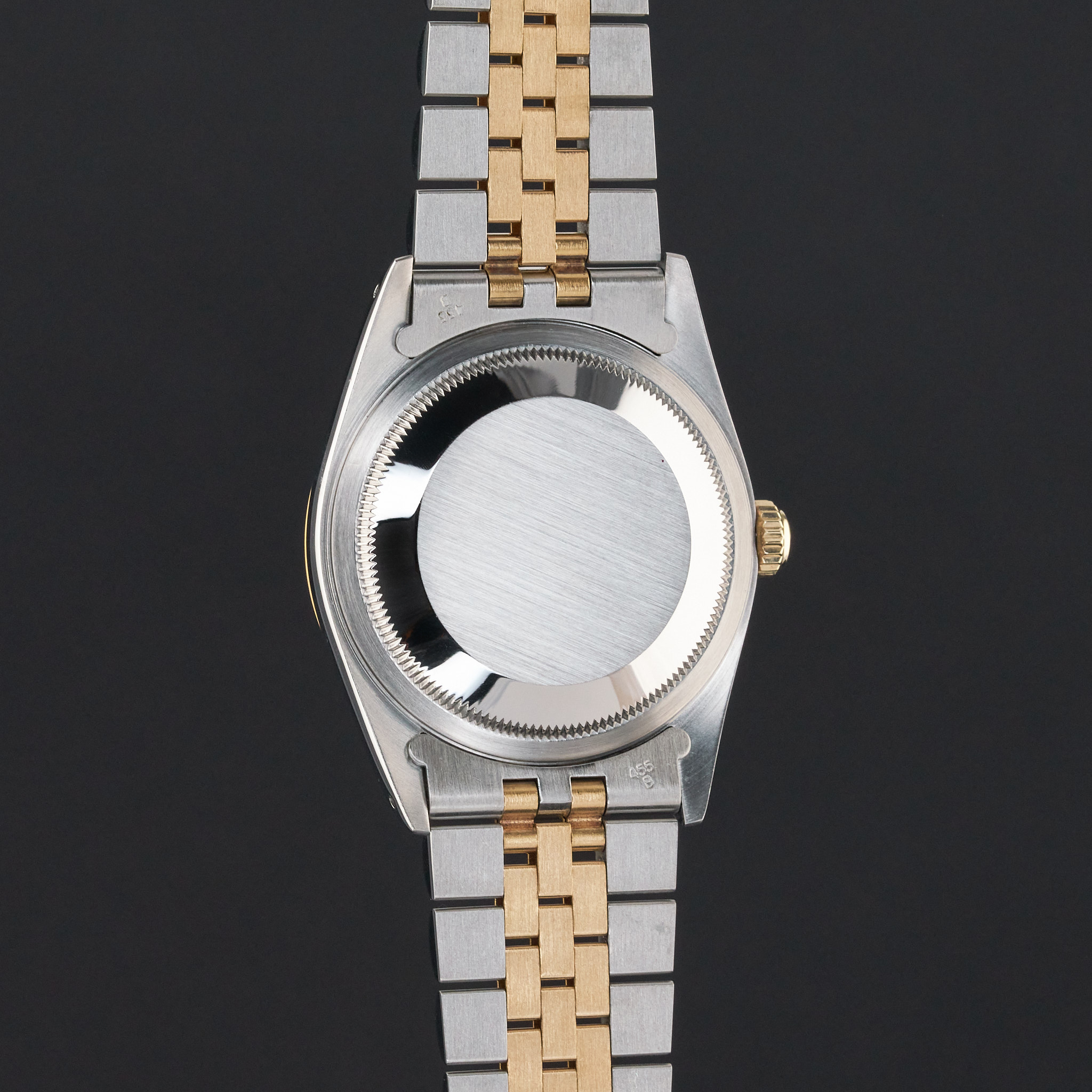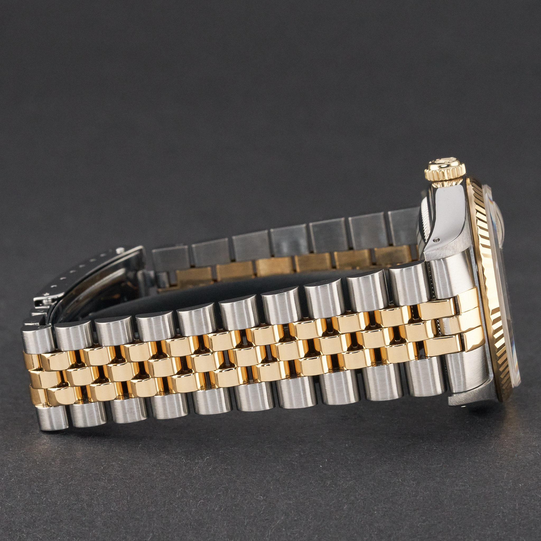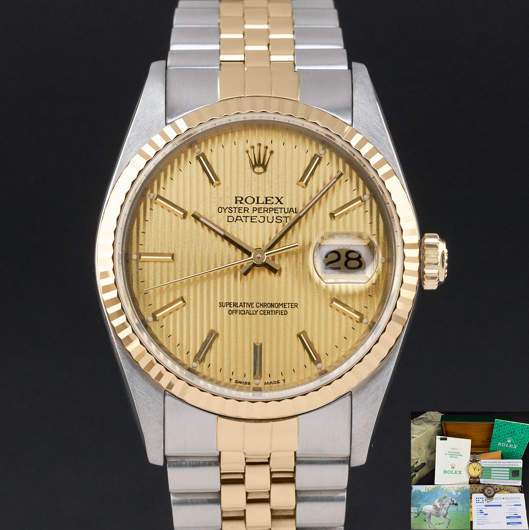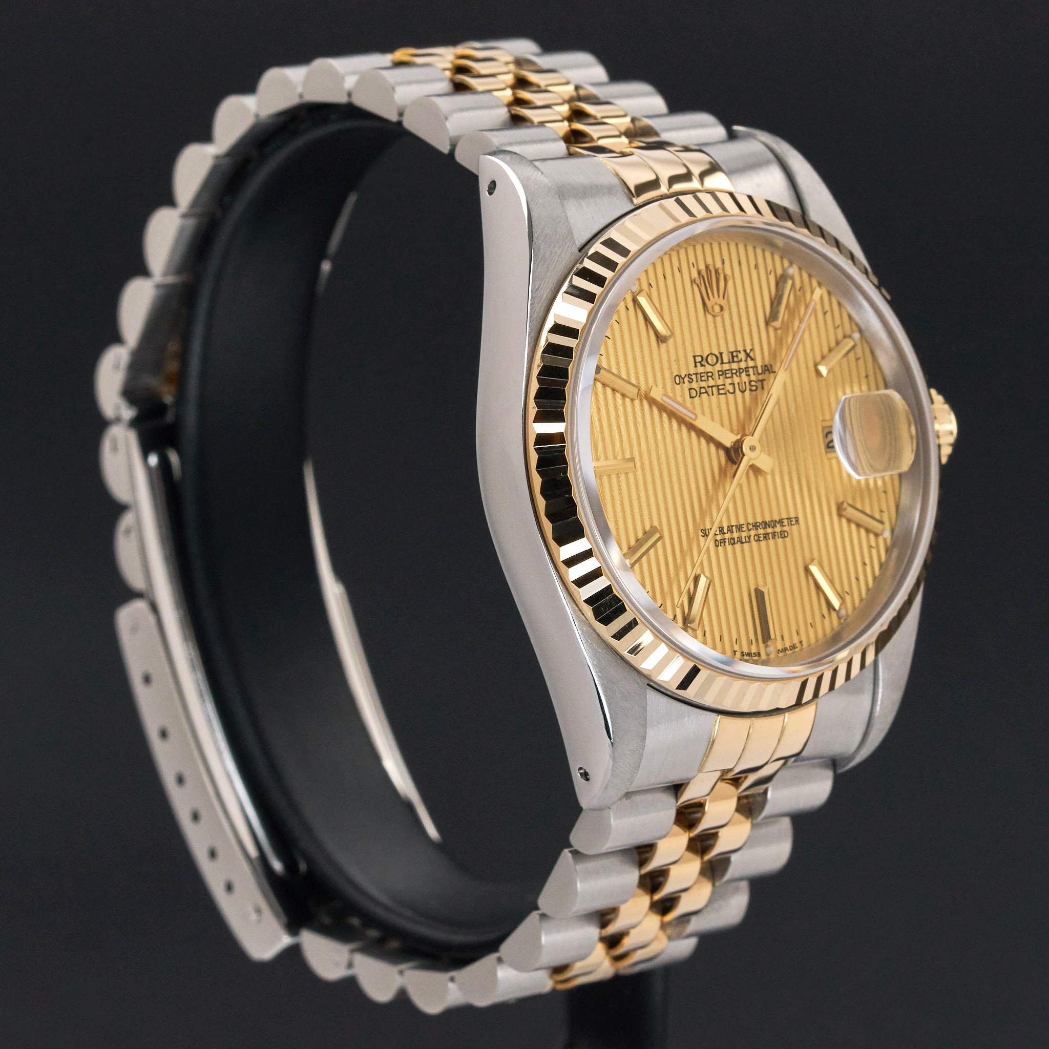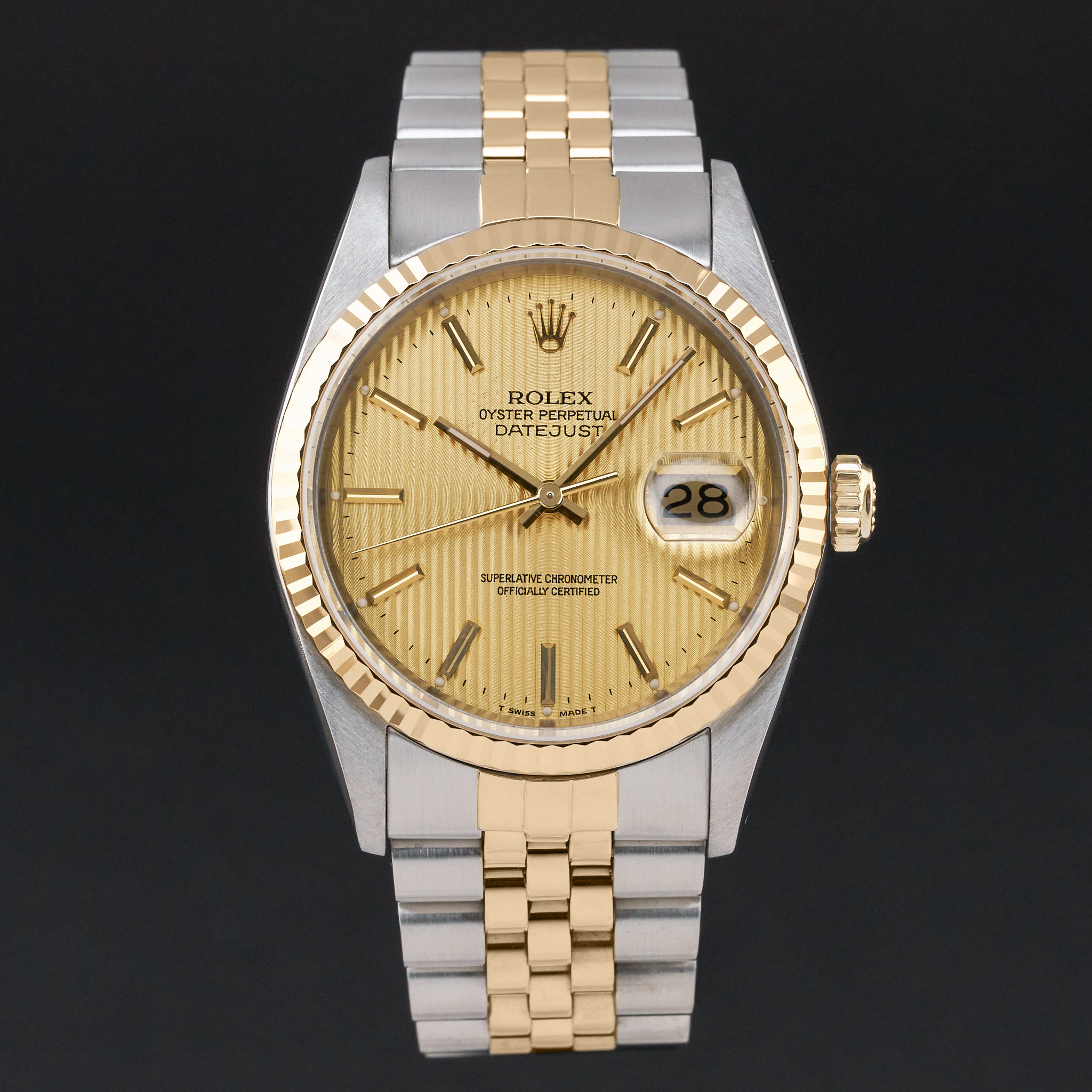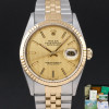This Rolex Datejust 16233 features a Champagne tapestry dial and is crafted from 18K yellow gold and stainless steel, with a production year of 1991.