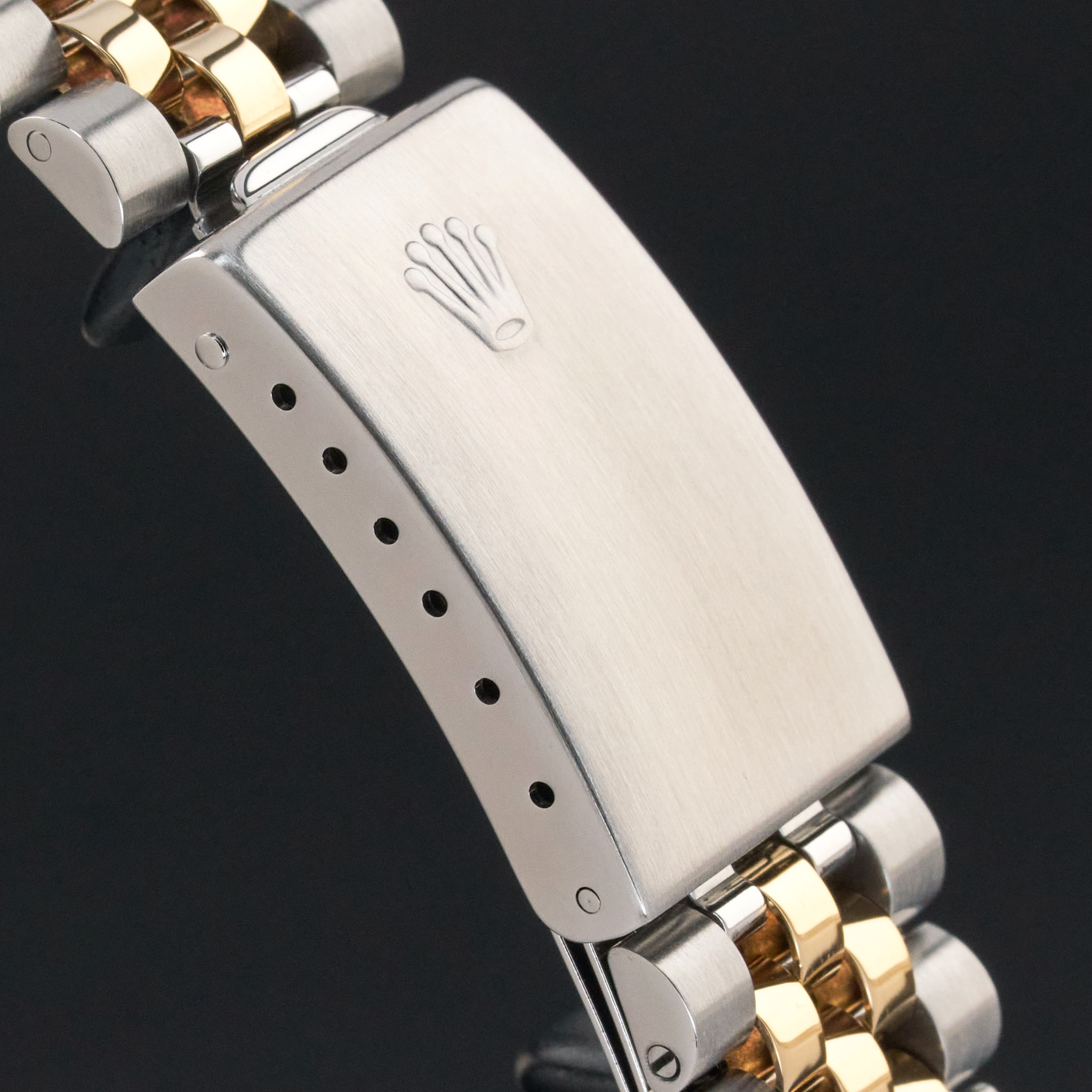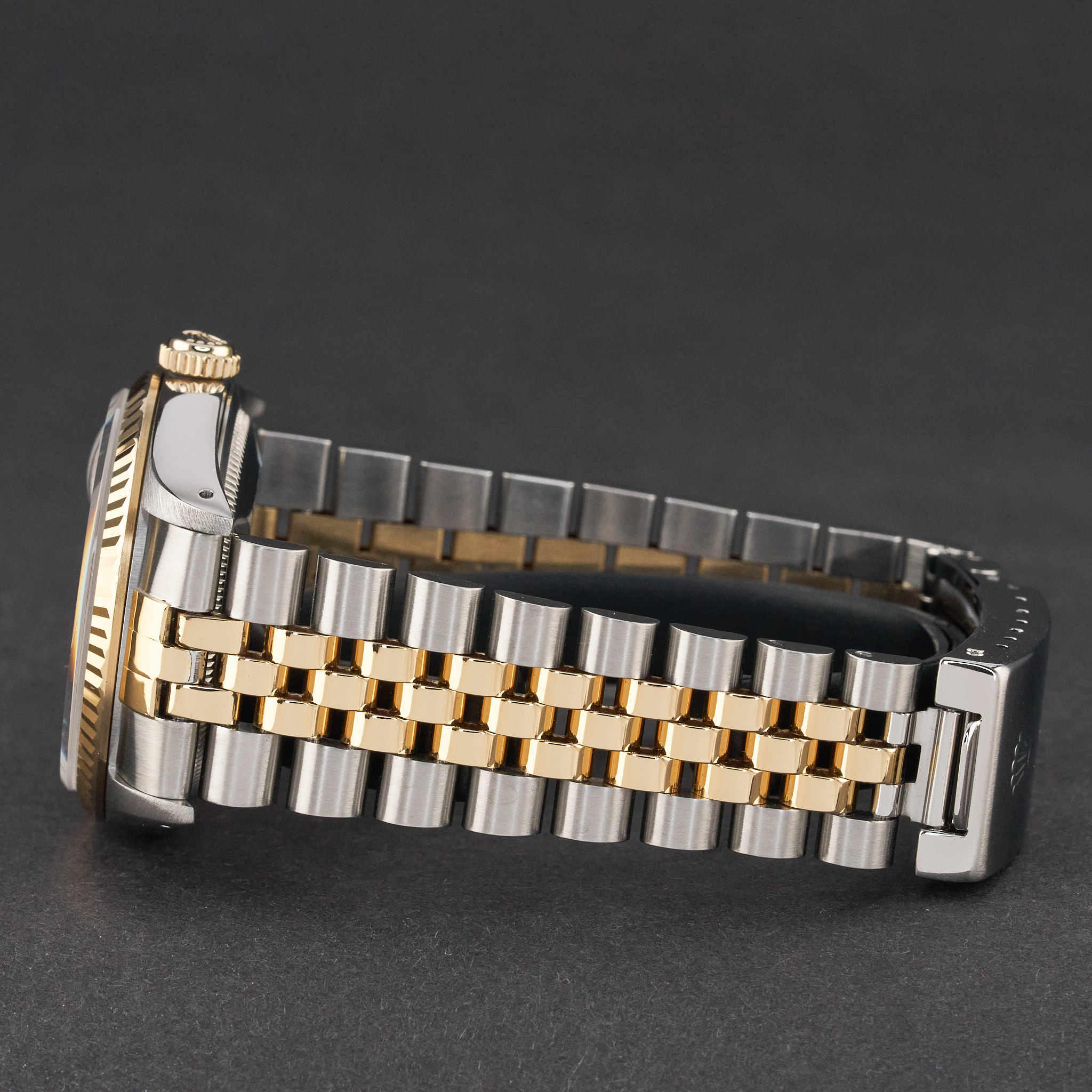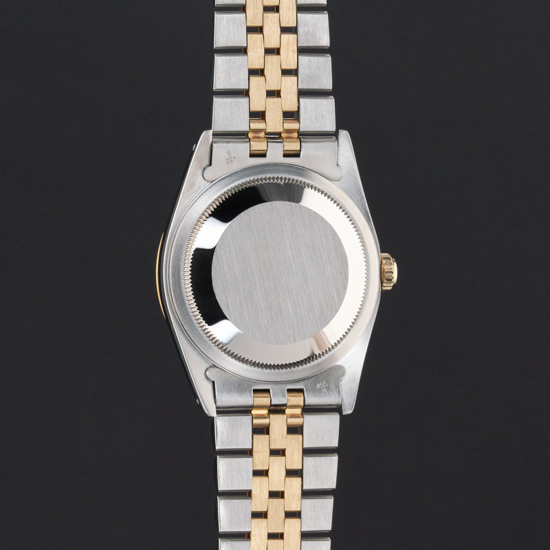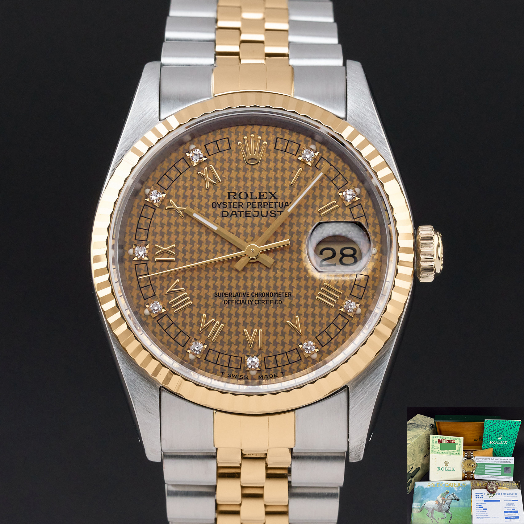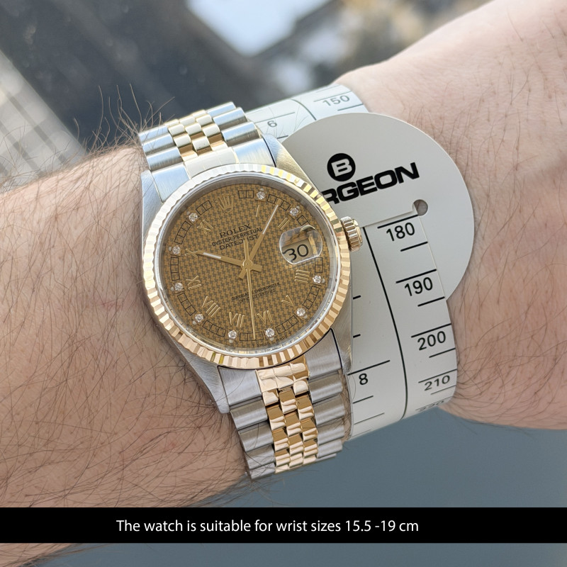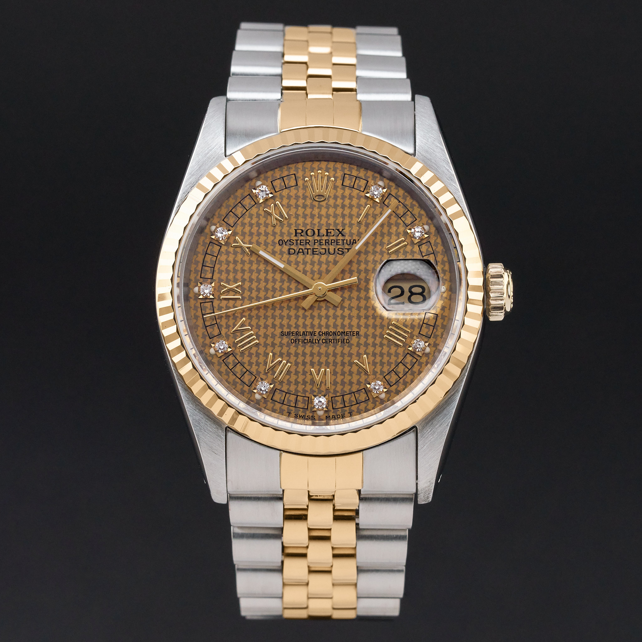 This Rolex Datejust 16233 features a Houndstooth Roman small diamond dial and is crafted from 18K yellow gold and stainless steel, with a production year of 1991.