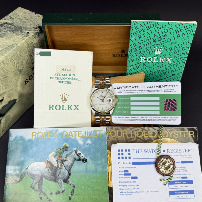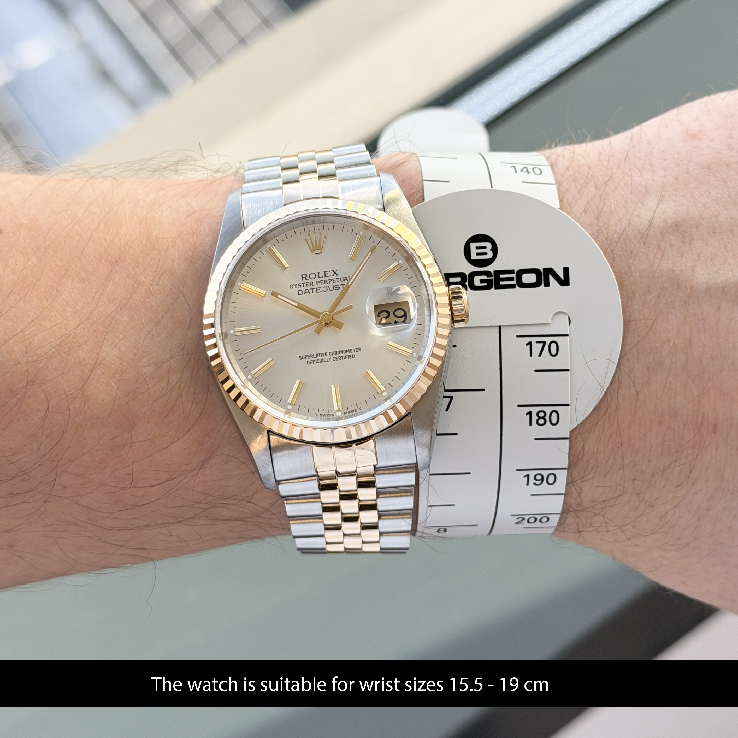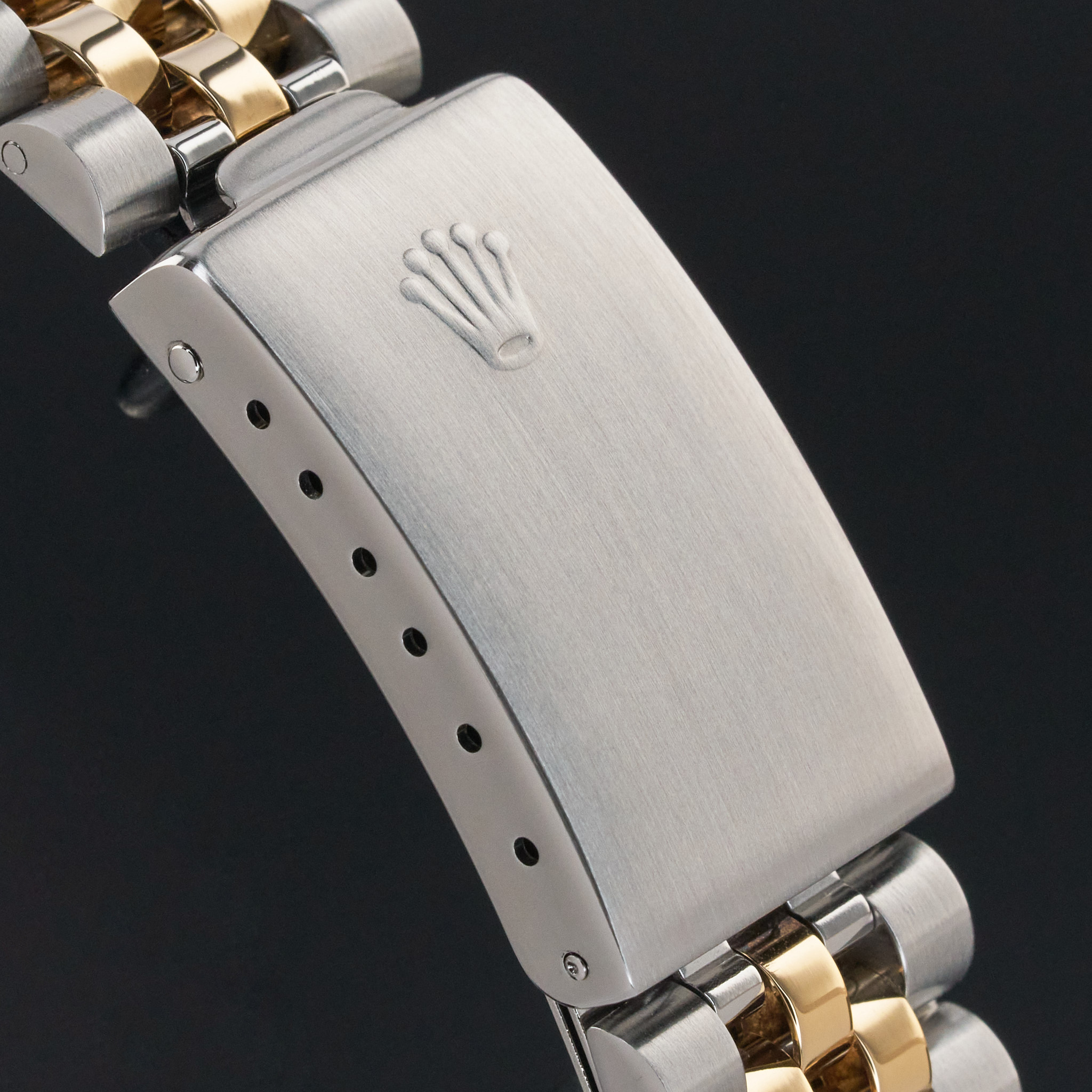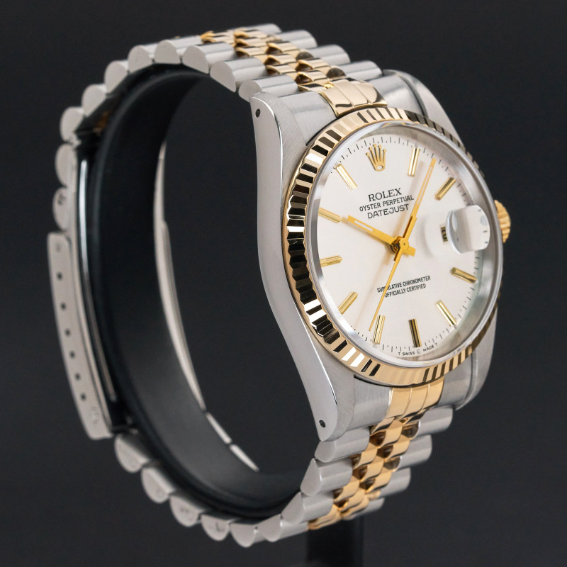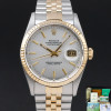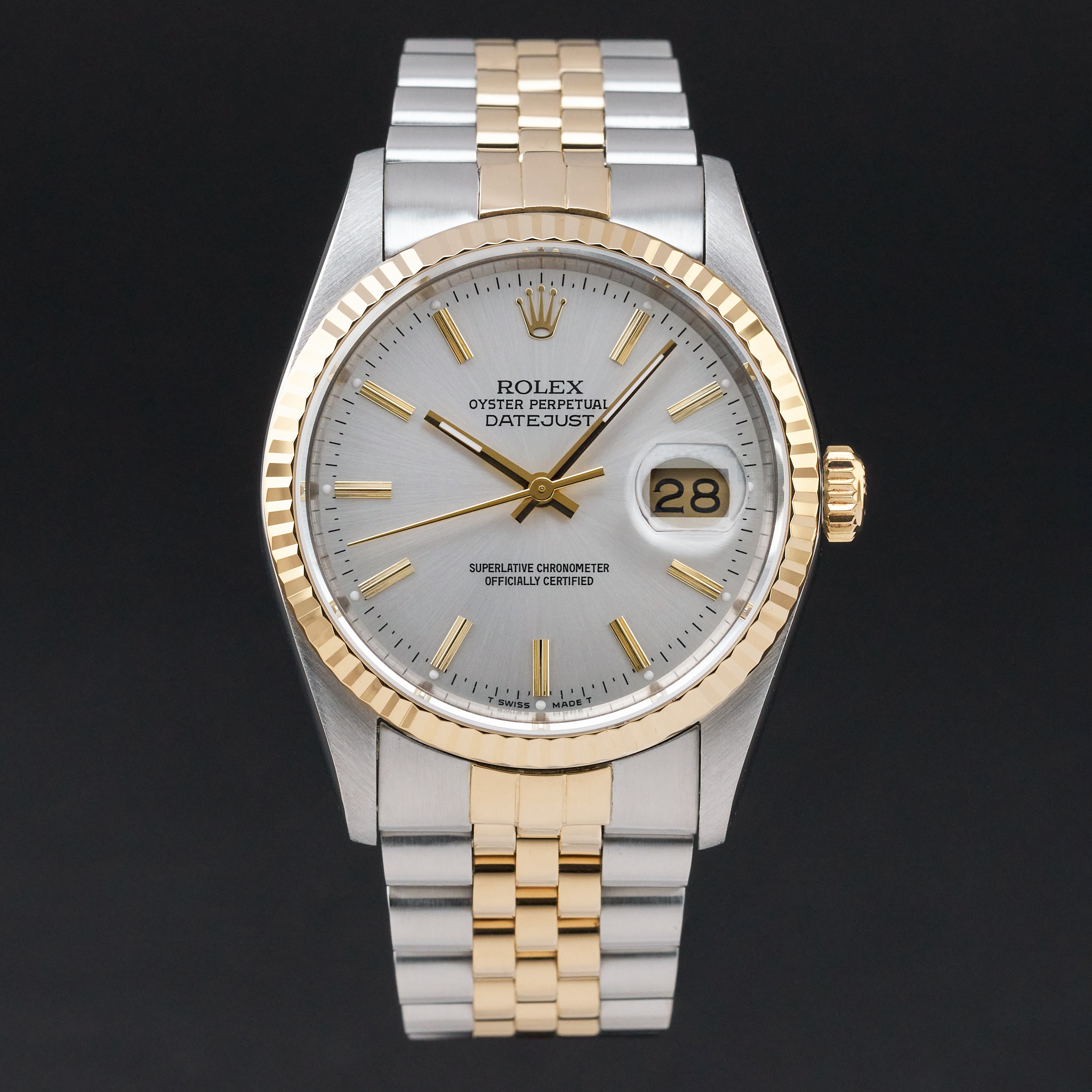 This Rolex Datejust 16233 features a Silver dial and is crafted from 18K yellow gold and stainless steel, with a production year of 1991.