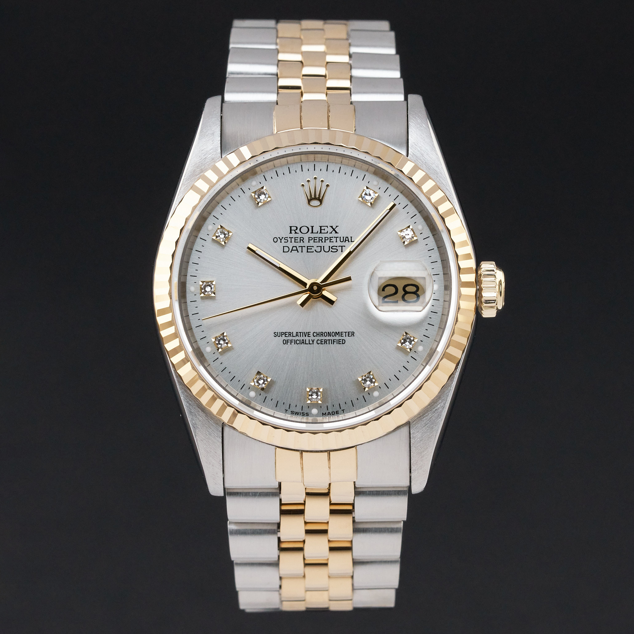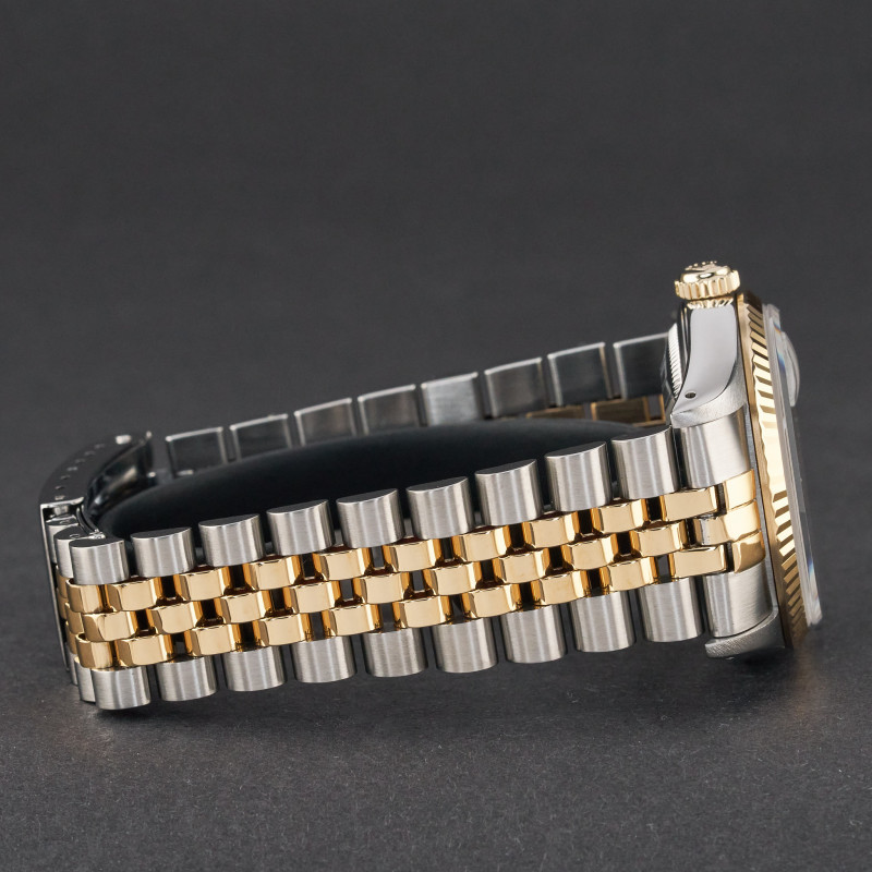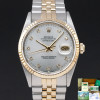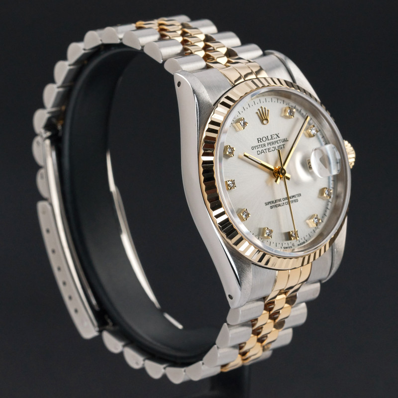 This Rolex Datejust 16233 features a Silver diamond dial and is crafted from 18K yellow gold and stainless steel, with a production year of 1991.