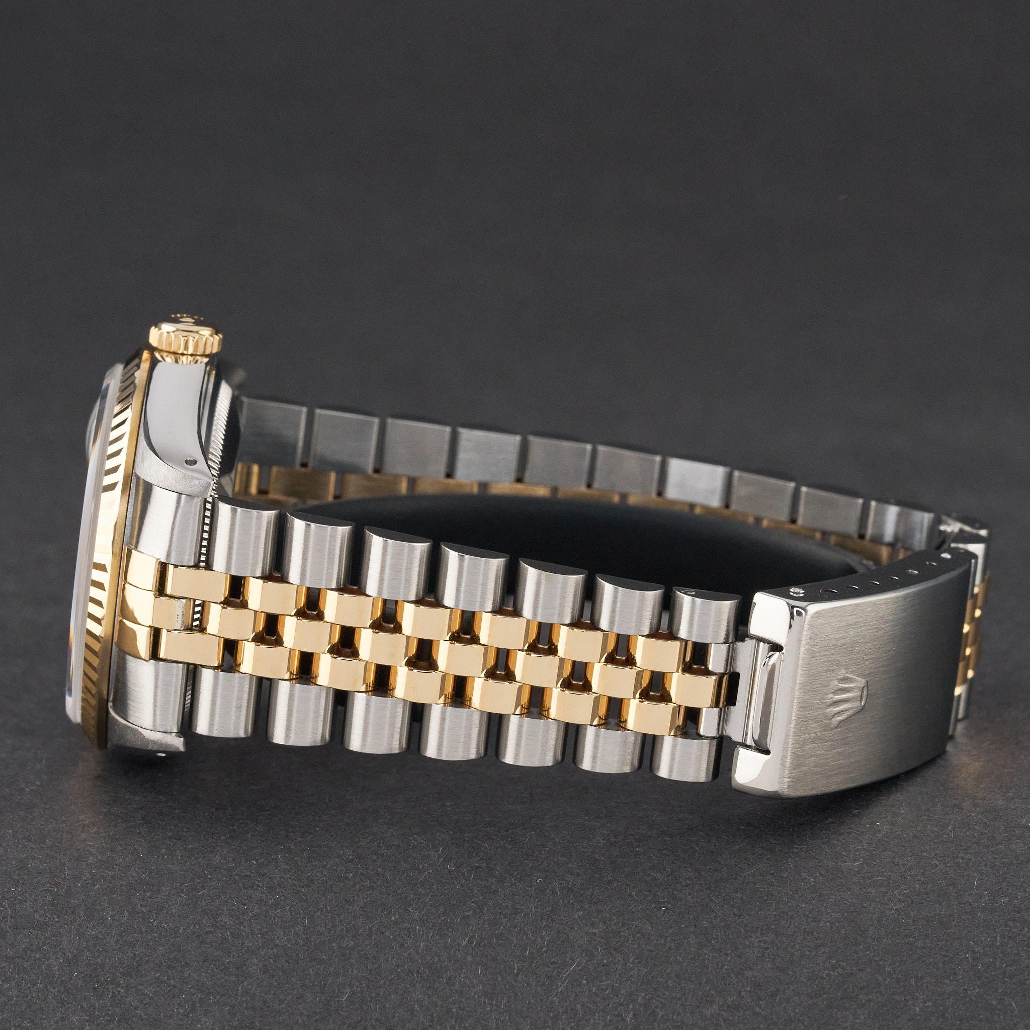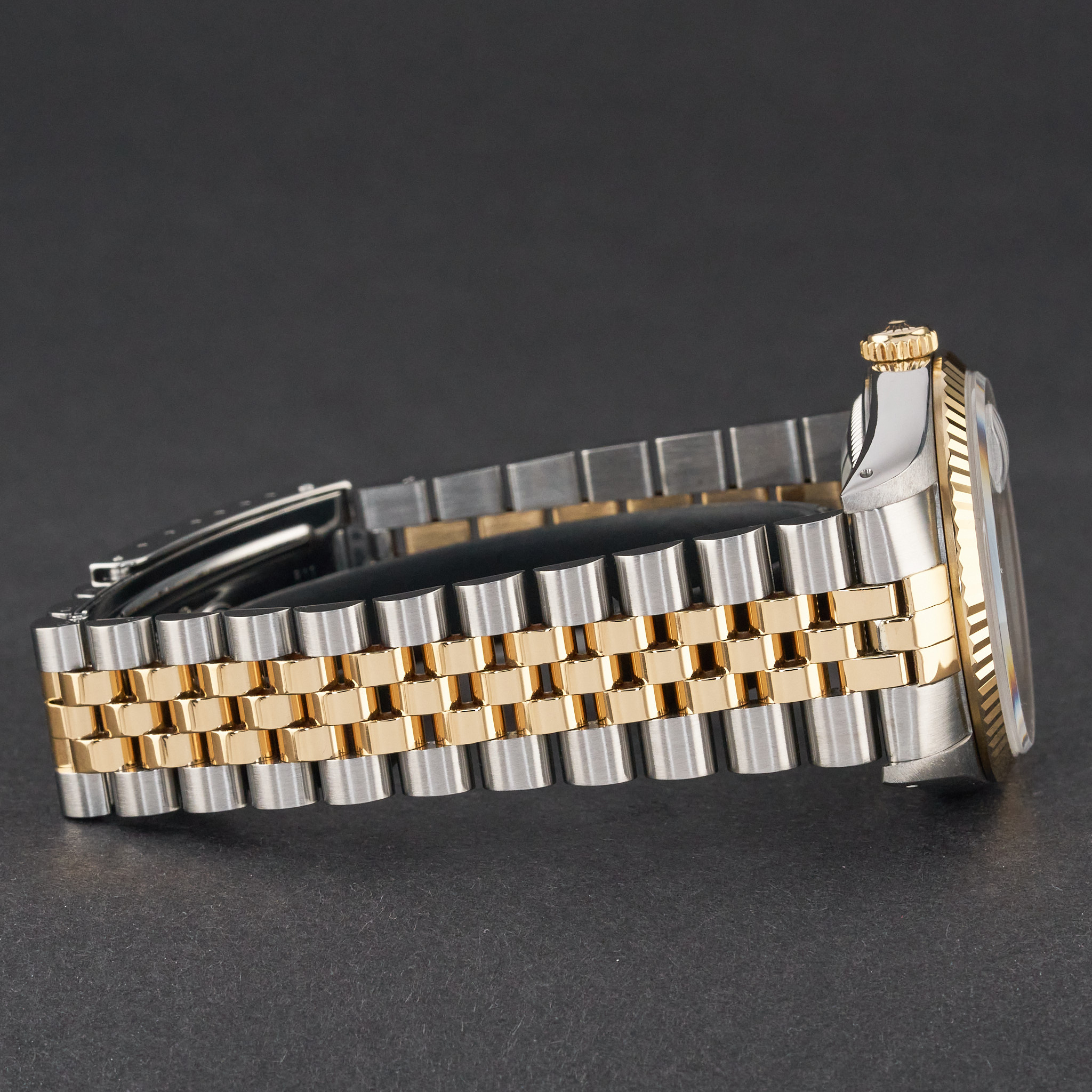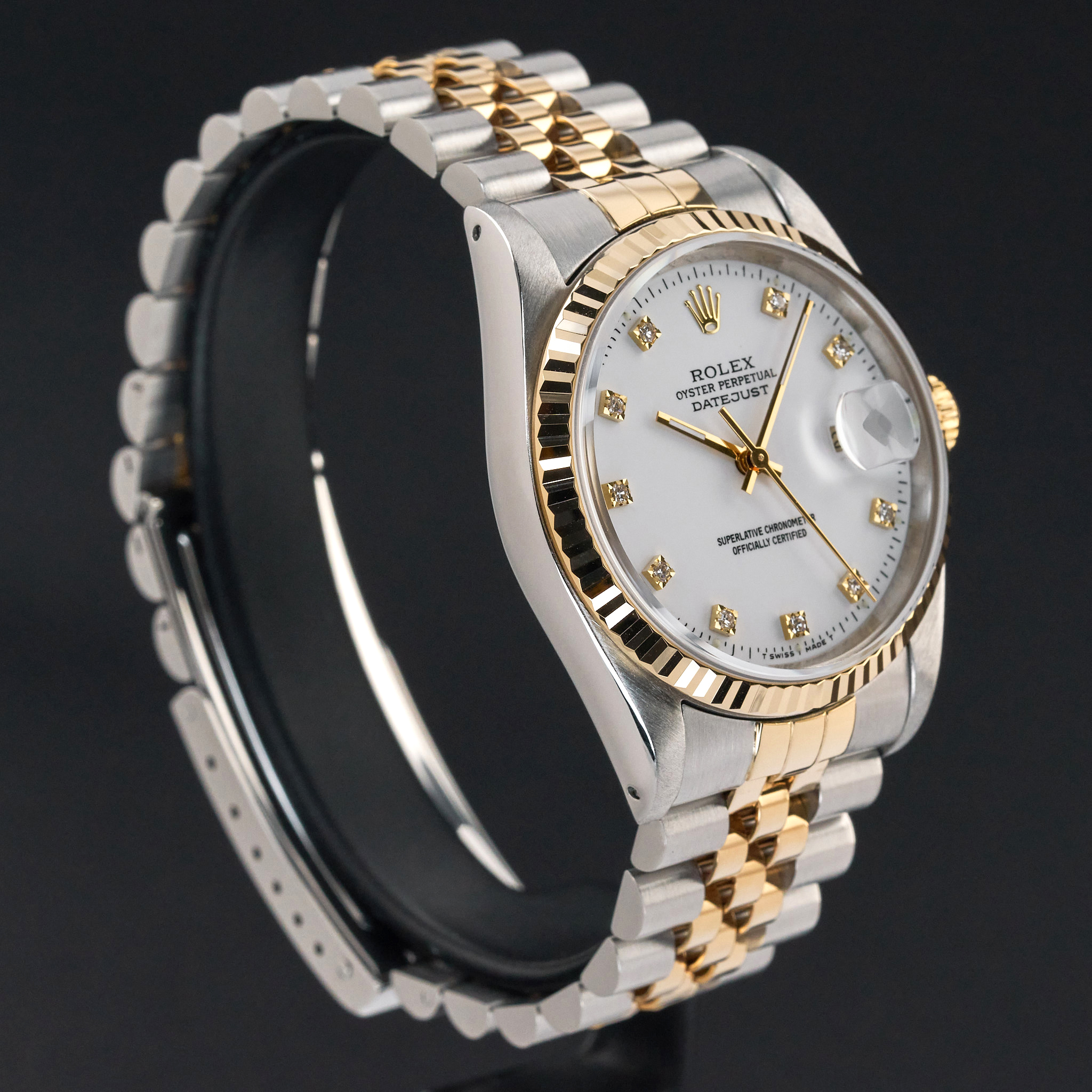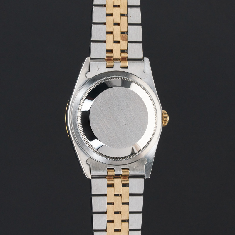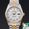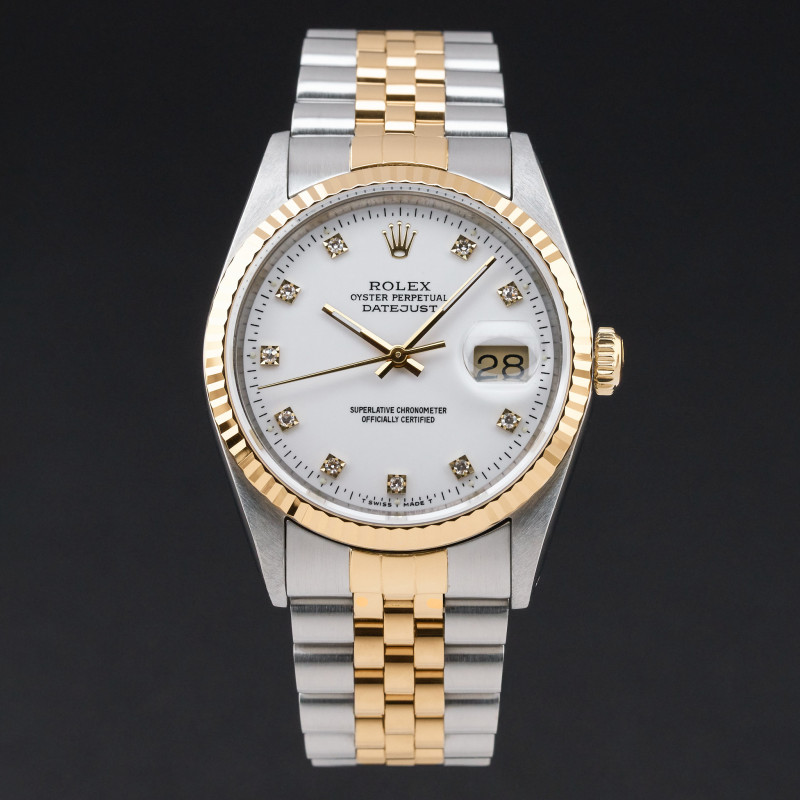 This Rolex Datejust 16233 features a White small diamond dial and is crafted from 18K yellow gold and stainless steel, with a production year of 1991.