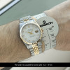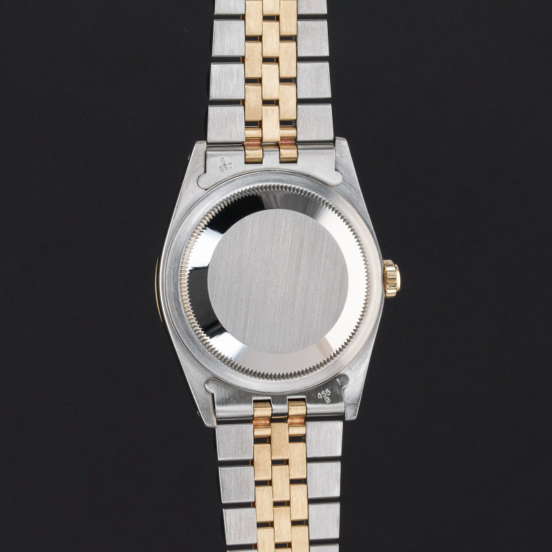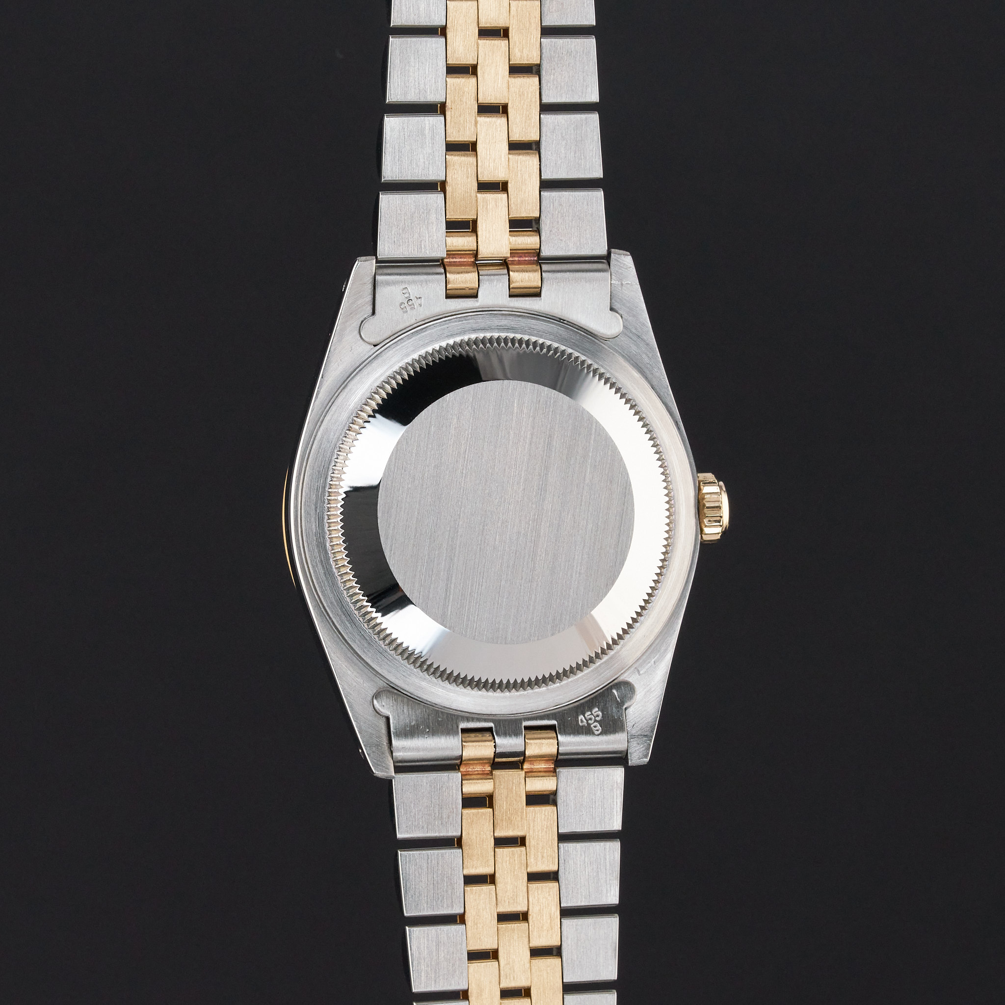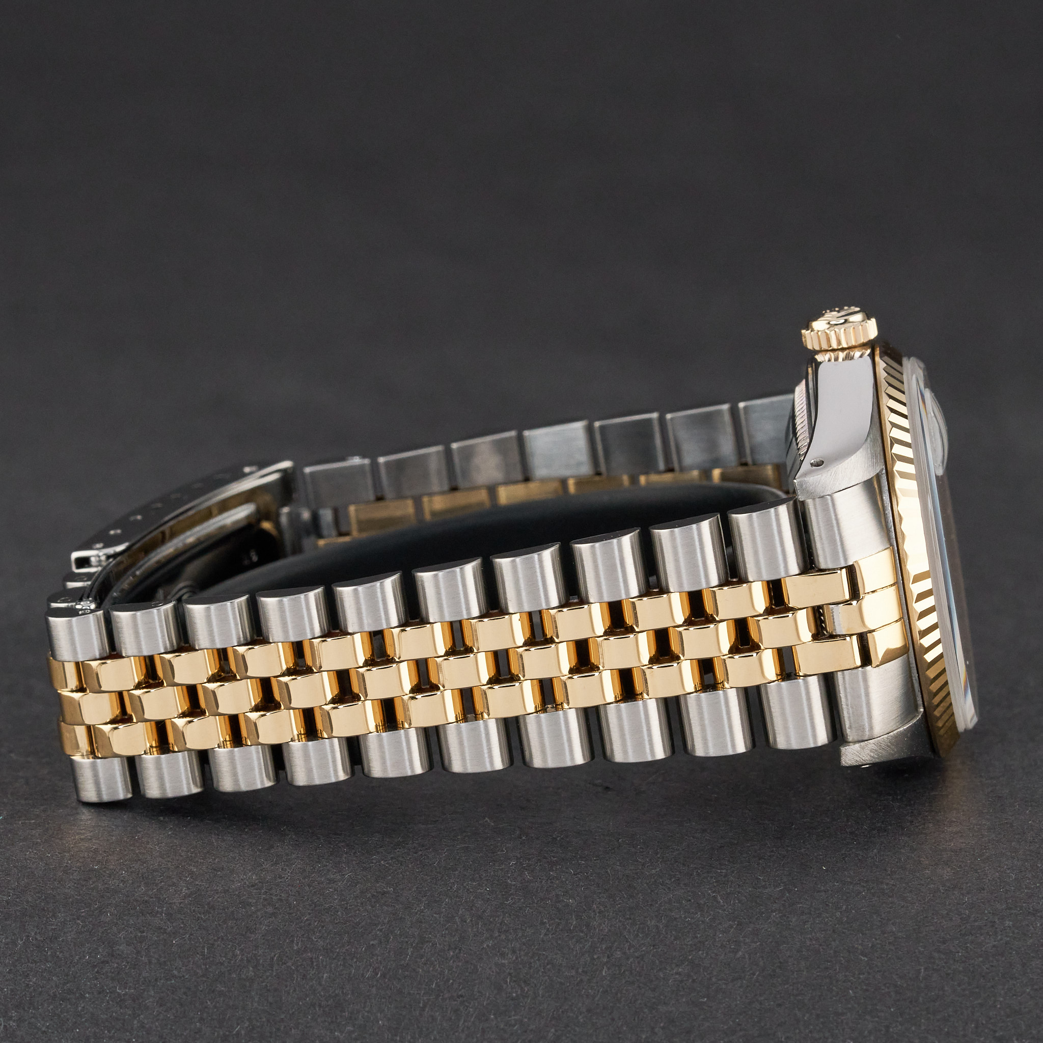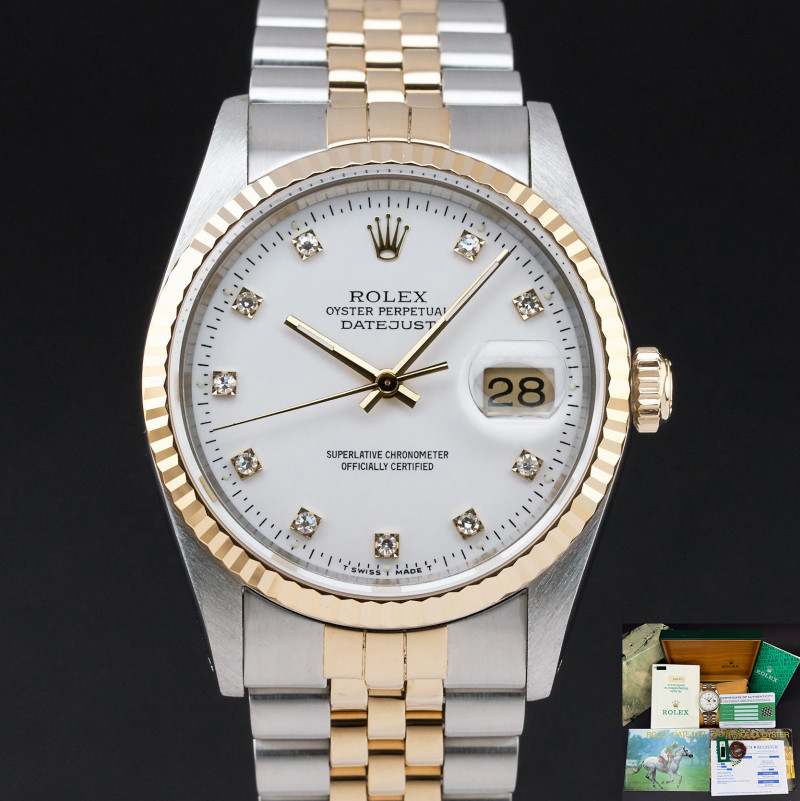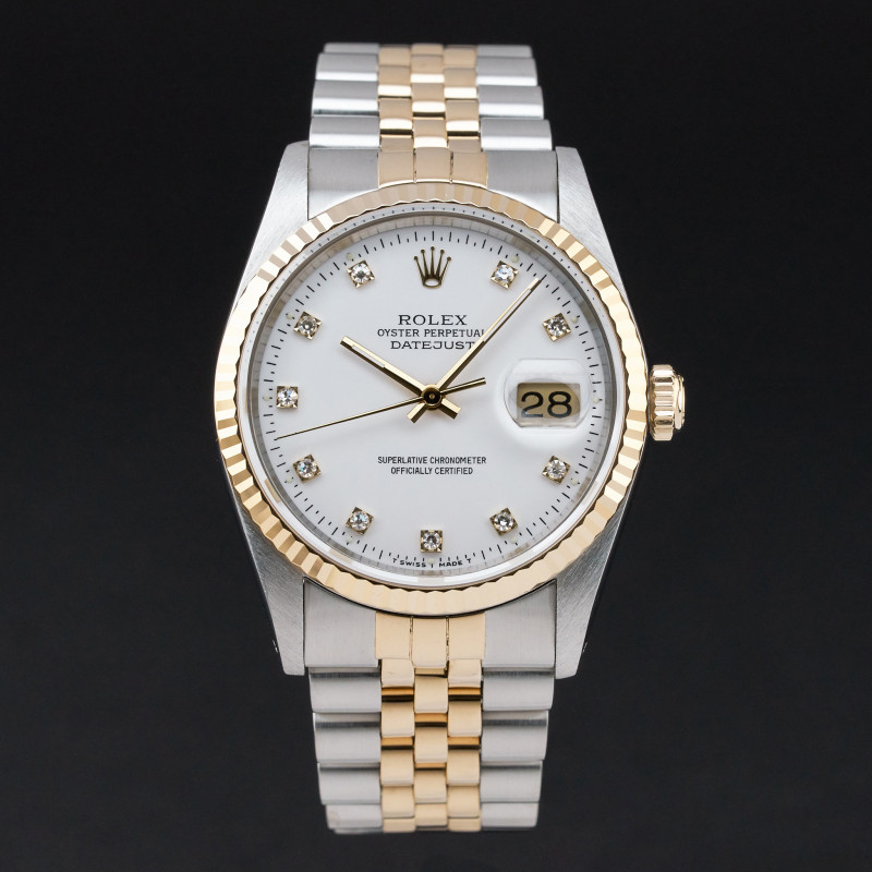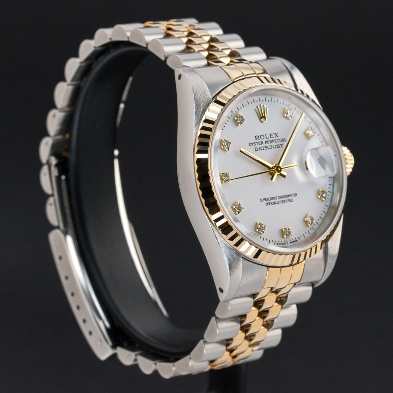 This Rolex Datejust 16233 features a White small diamond dial and is crafted from 18K yellow gold and stainless steel, with a production year of 1991.