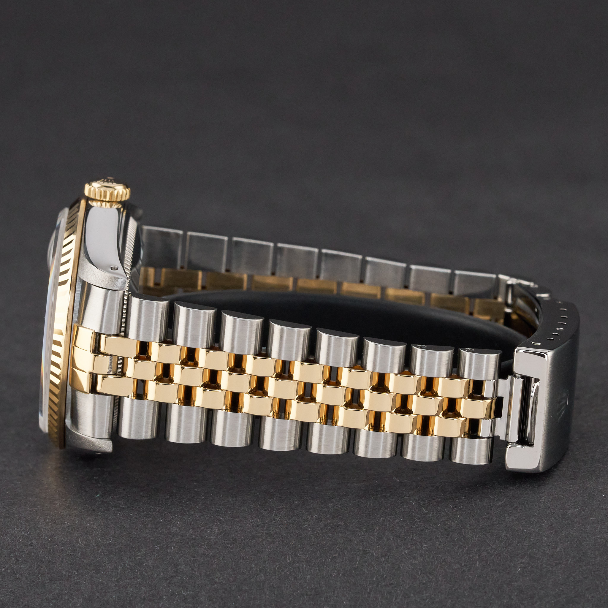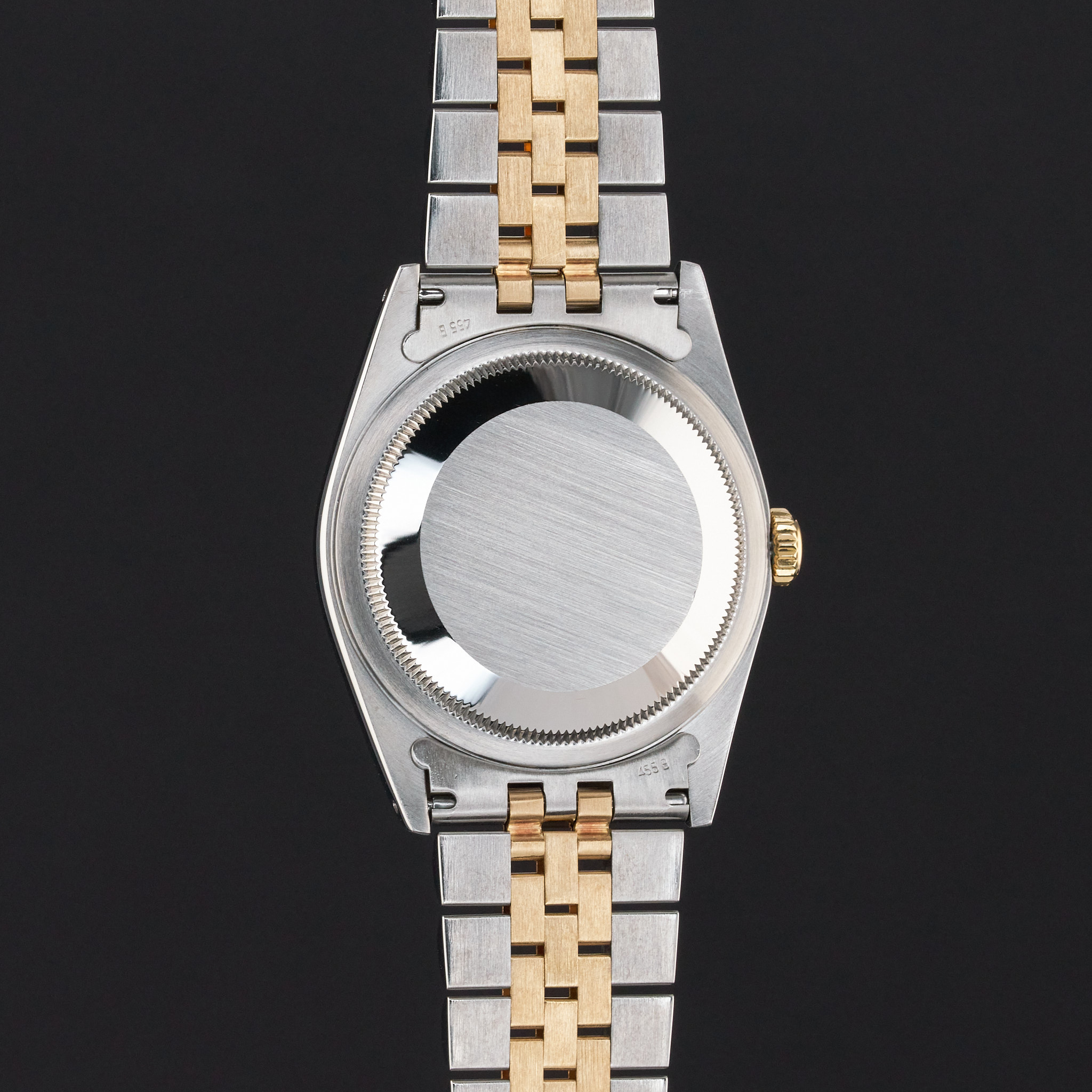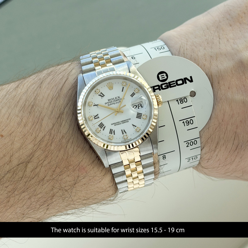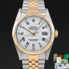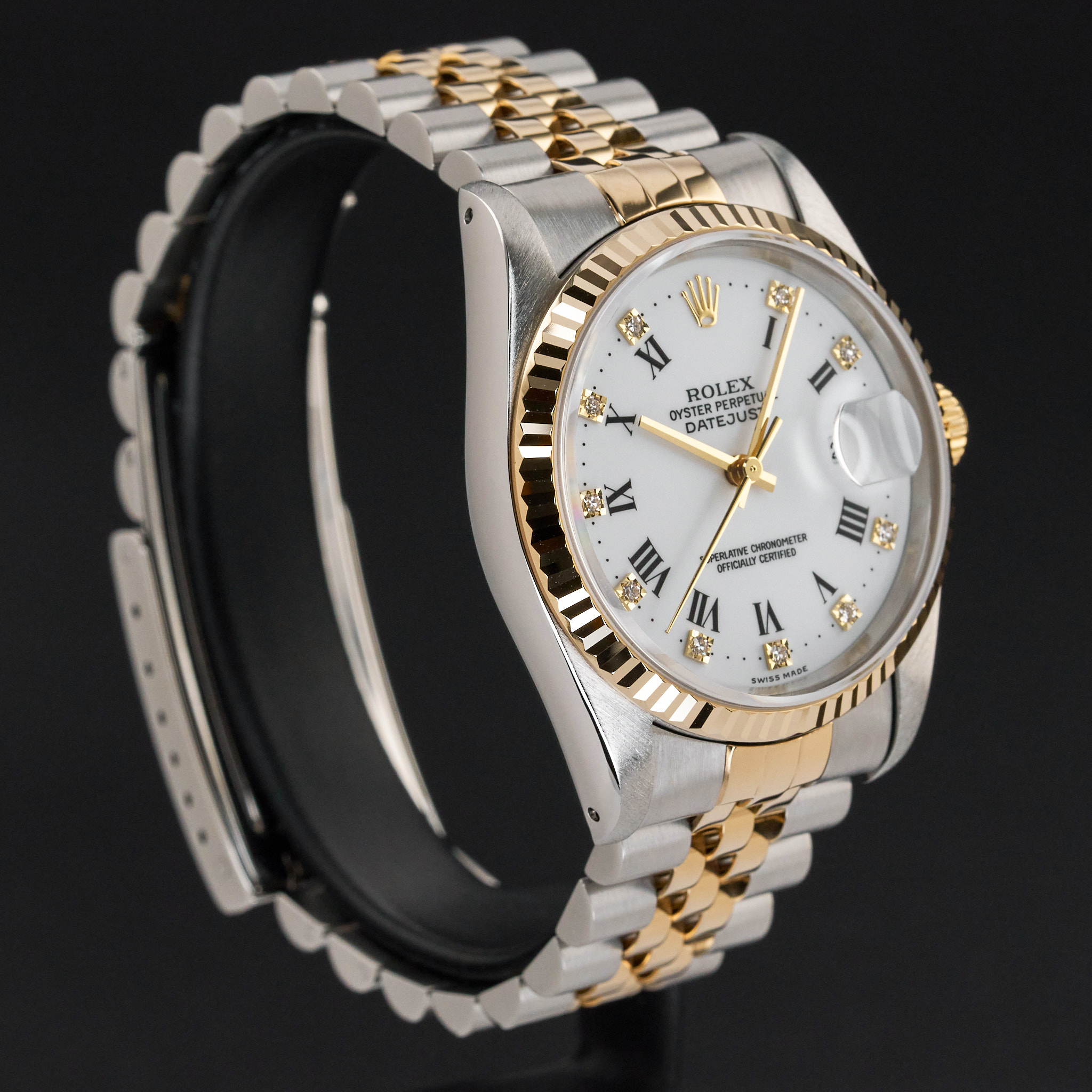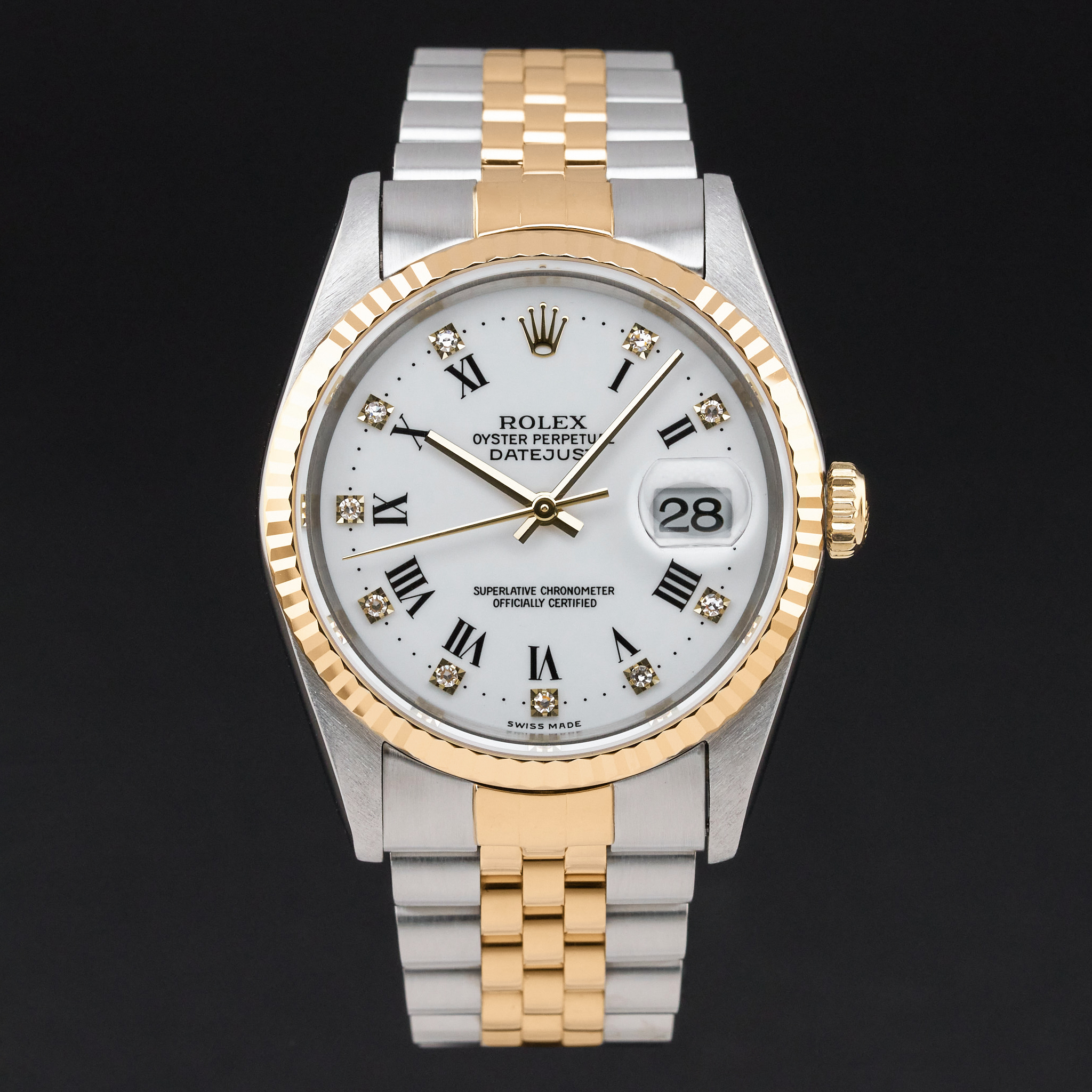 This Rolex Datejust 16233 features a White Roman small diamond dial and is crafted from 18K yellow gold and stainless steel, with a production year of 1992.