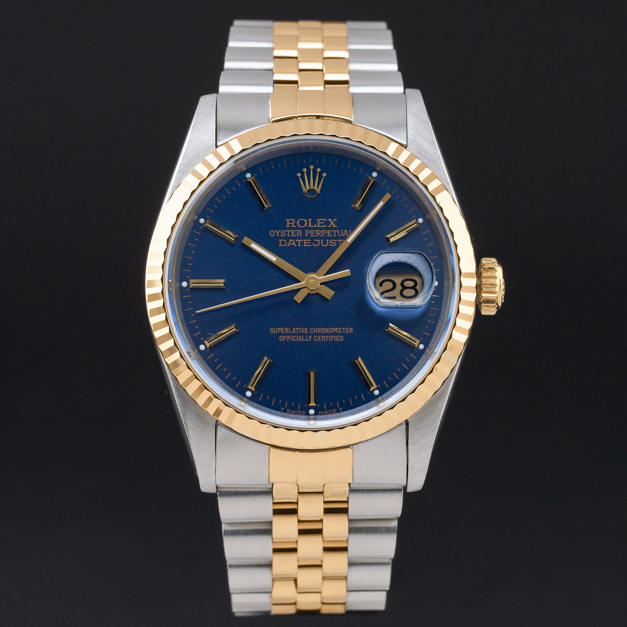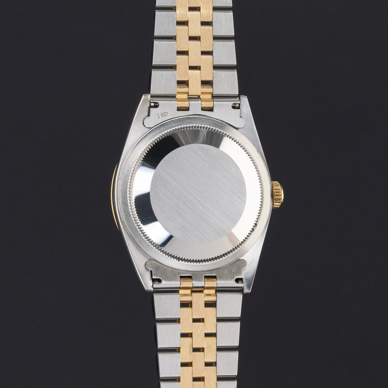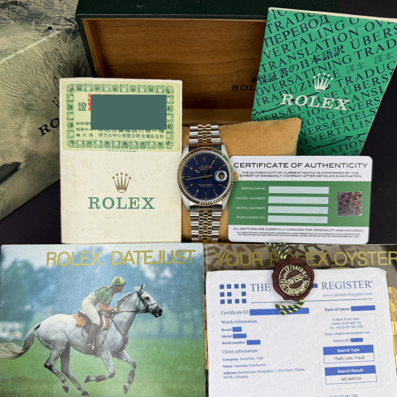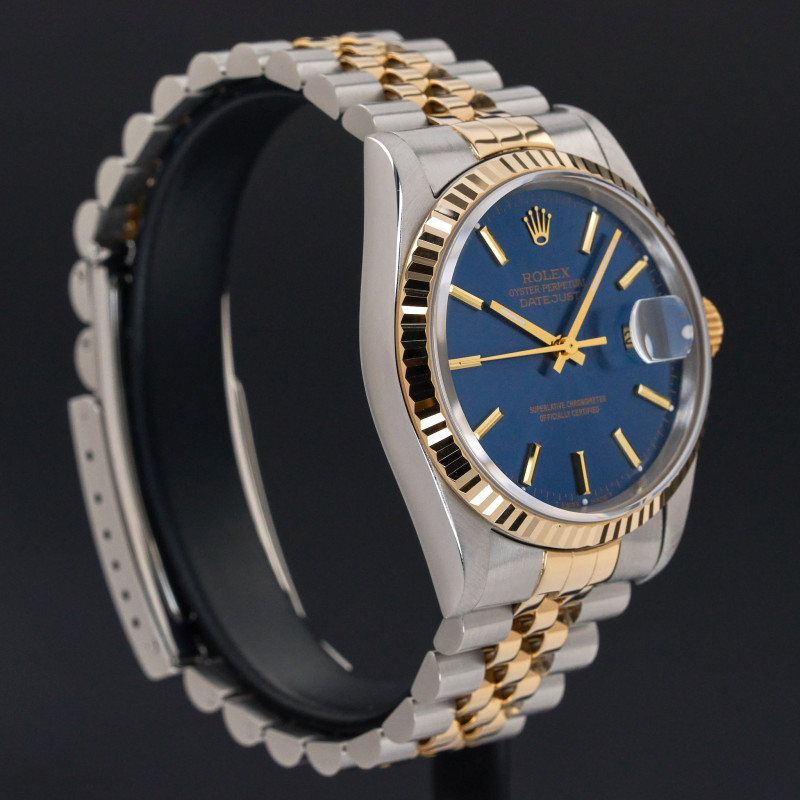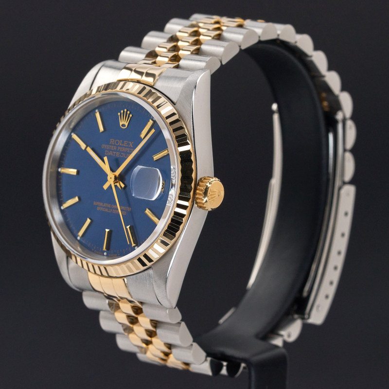 This Rolex Datejust 16233 features a Blue dial and is crafted from 18K yellow gold and stainless steel, with a production year of 1993.