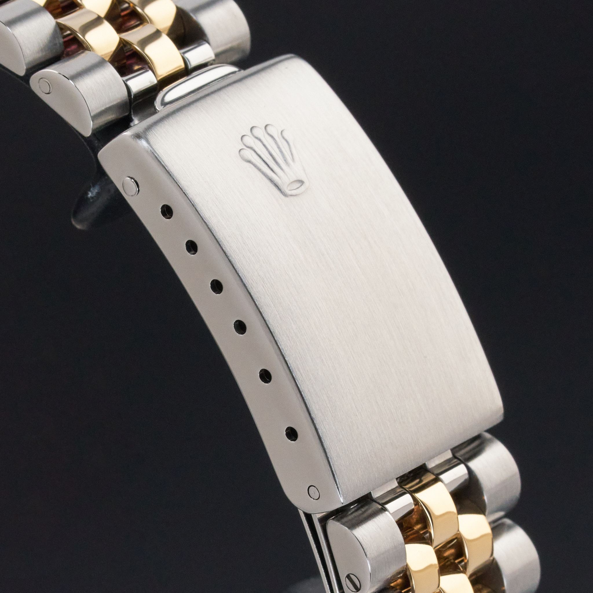 This Rolex Datejust 16233 features a Blue jubilee big diamond dial and is crafted from 18K yellow gold and stainless steel, with a production year of 1993.