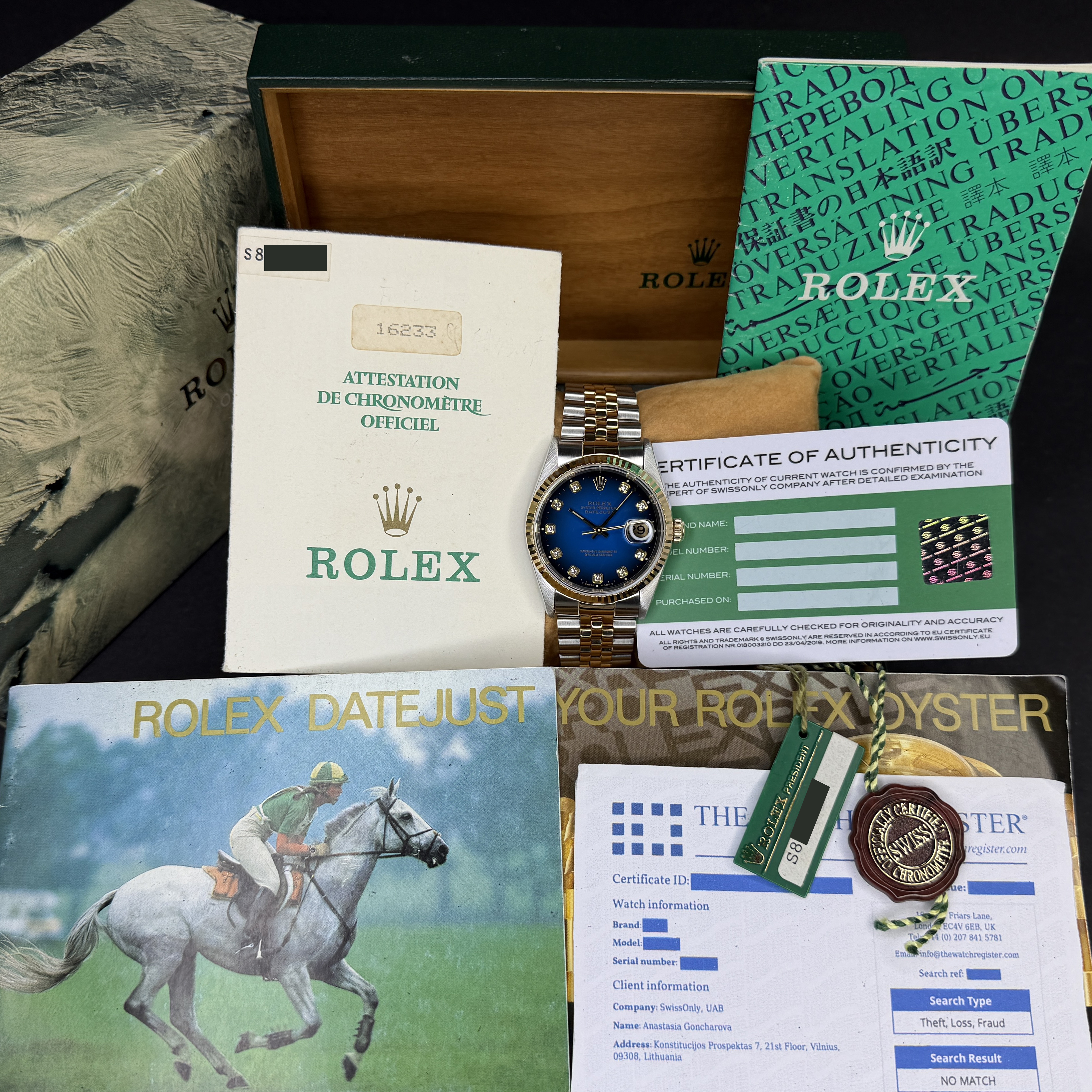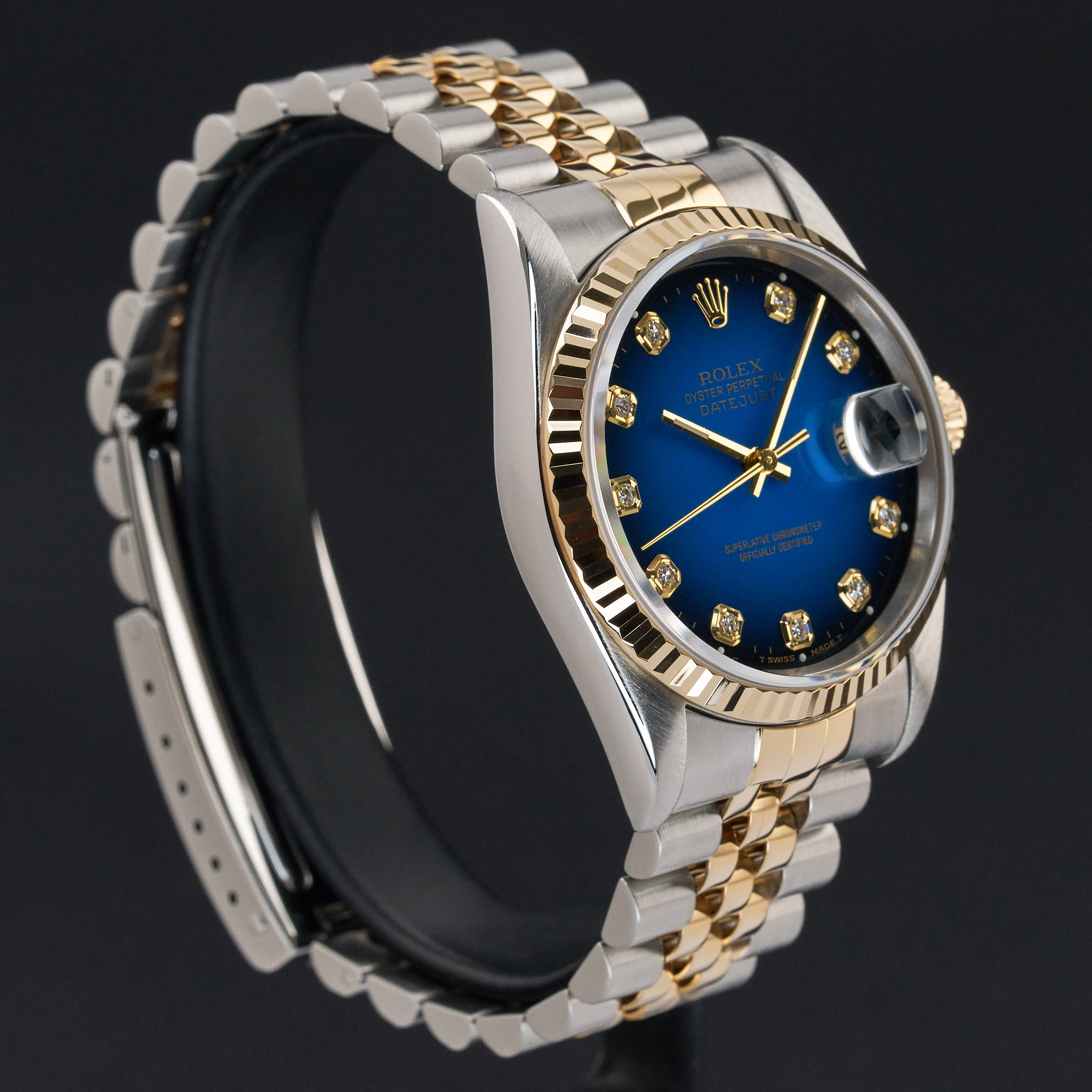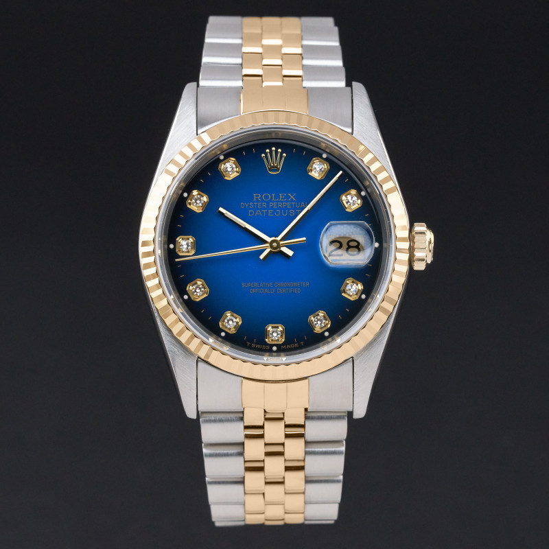 This Rolex Datejust 16233 features a Blue vignette big diamond dial and is crafted from 18K yellow gold and stainless steel, with a production year of 1993.