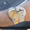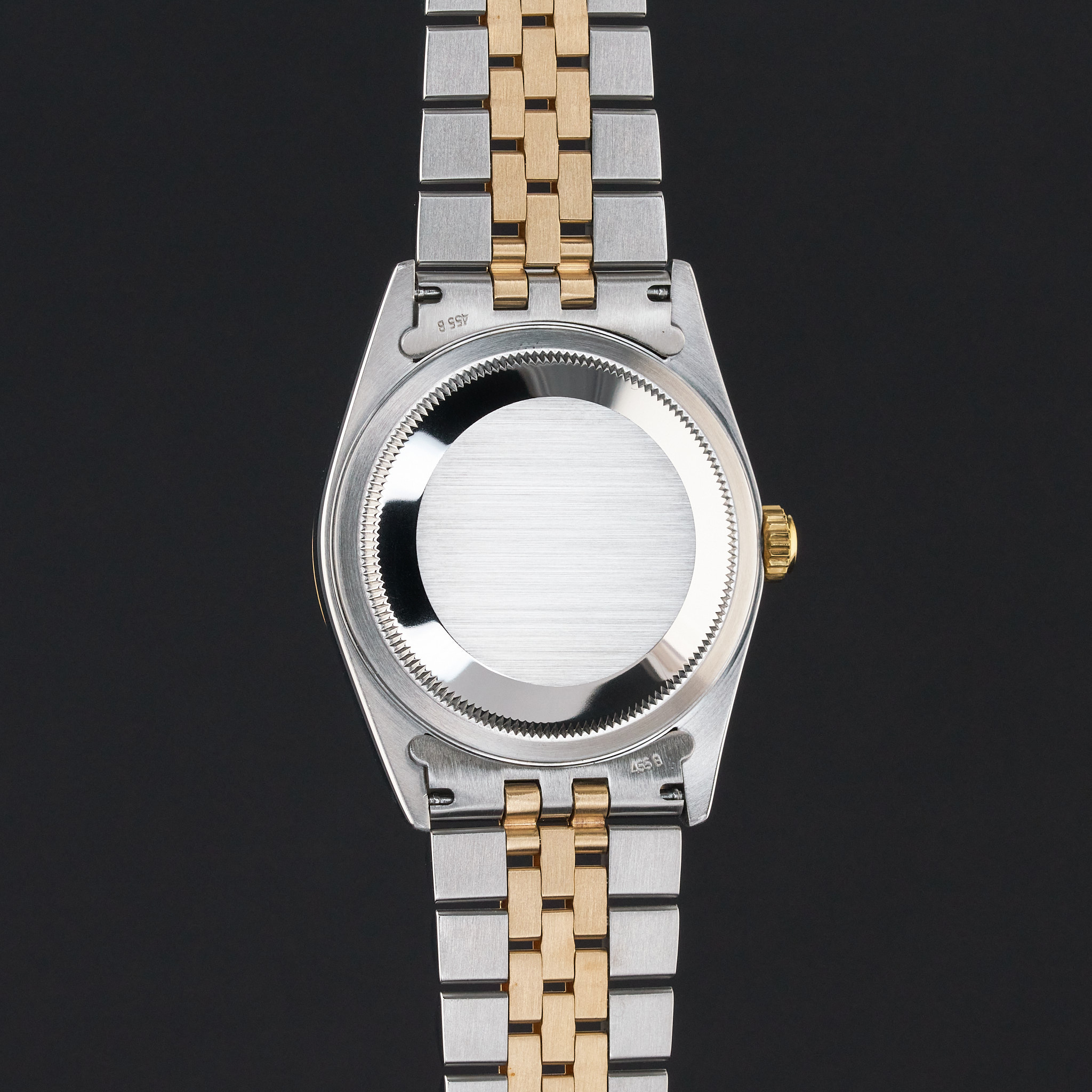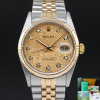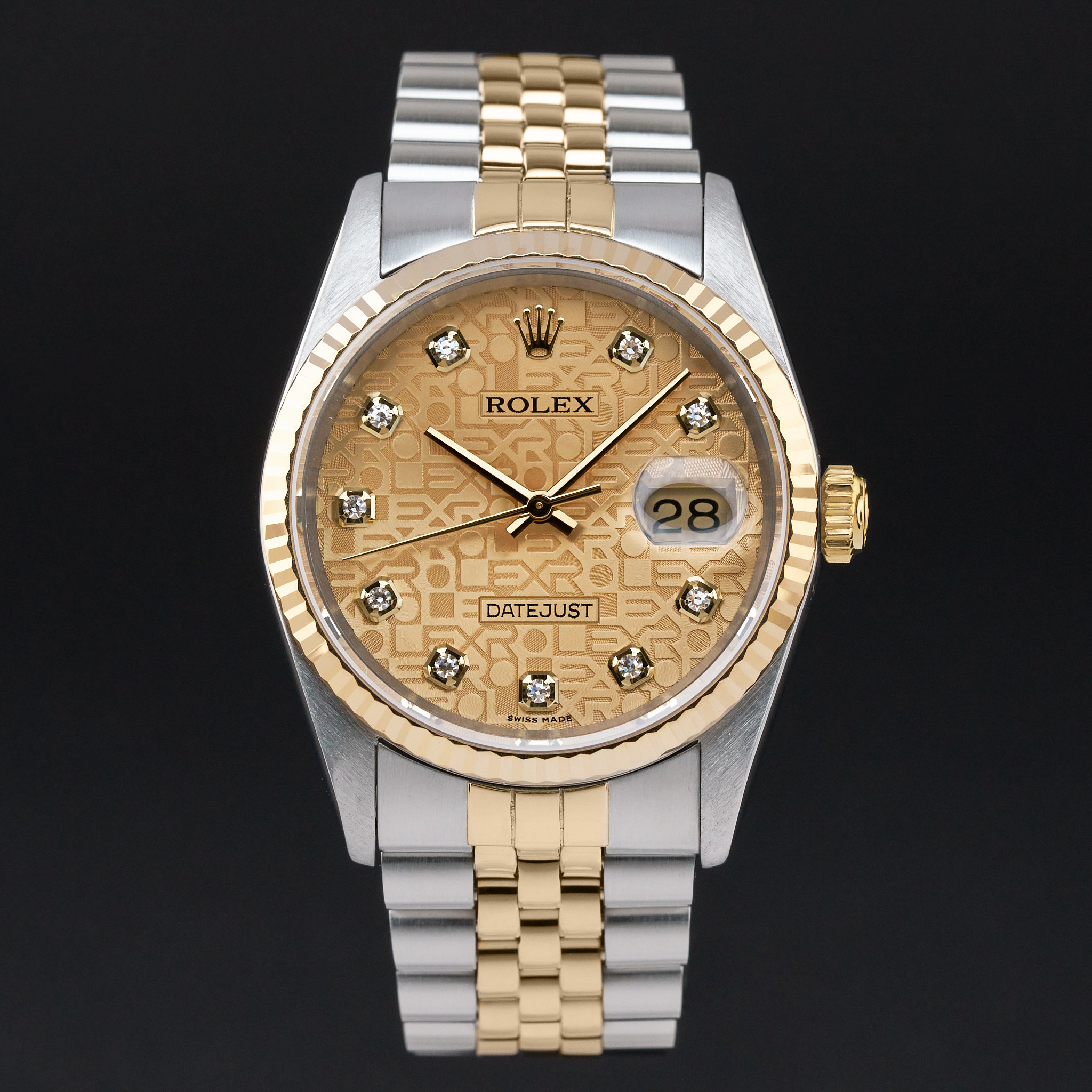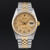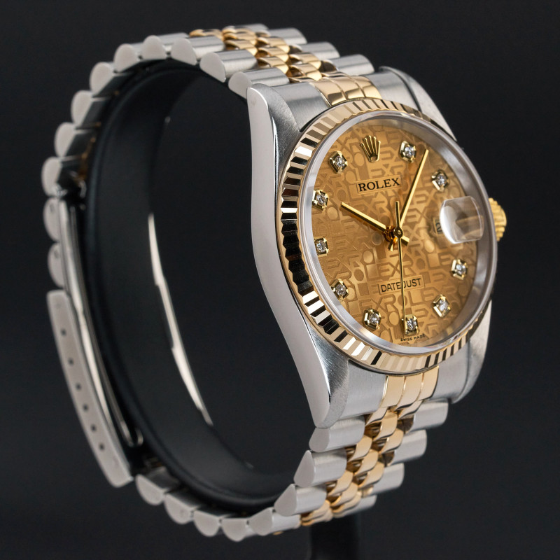 This Rolex Datejust 16233 features a Champagne jubilee big diamond dial and is crafted from 18K yellow gold and stainless steel, with a production year of 1993.