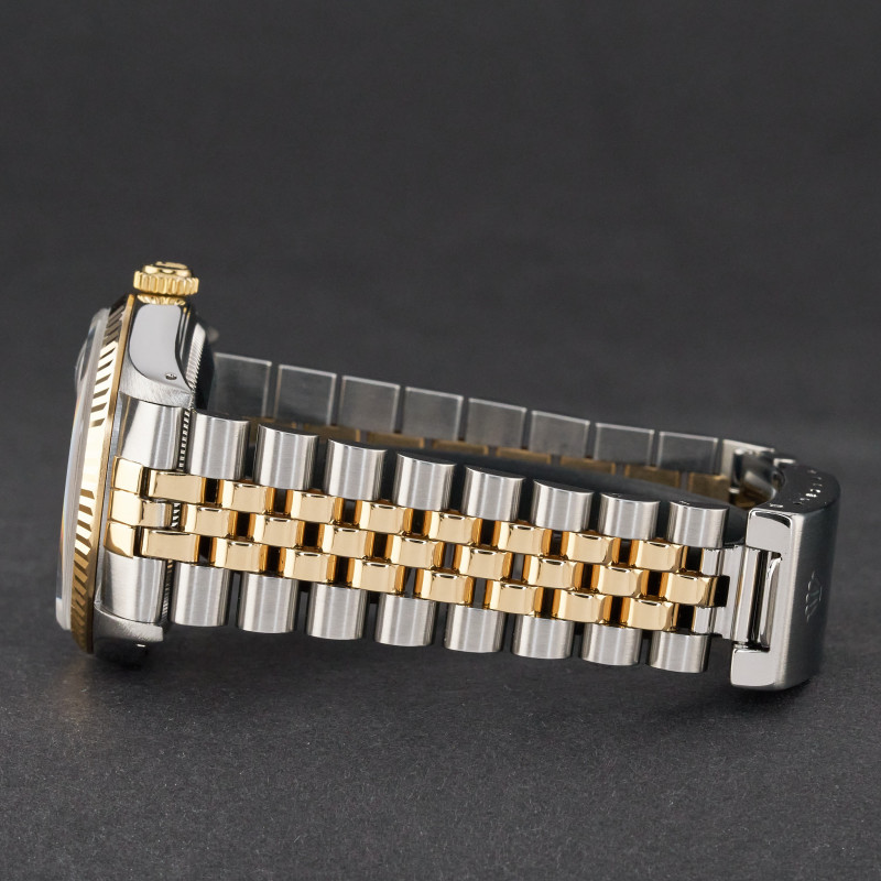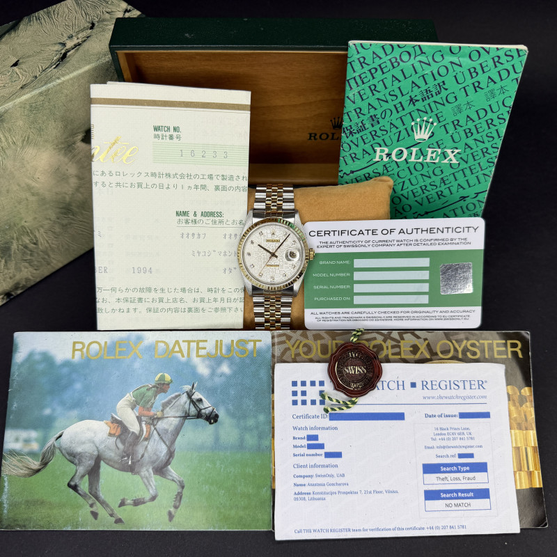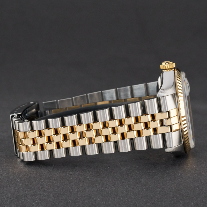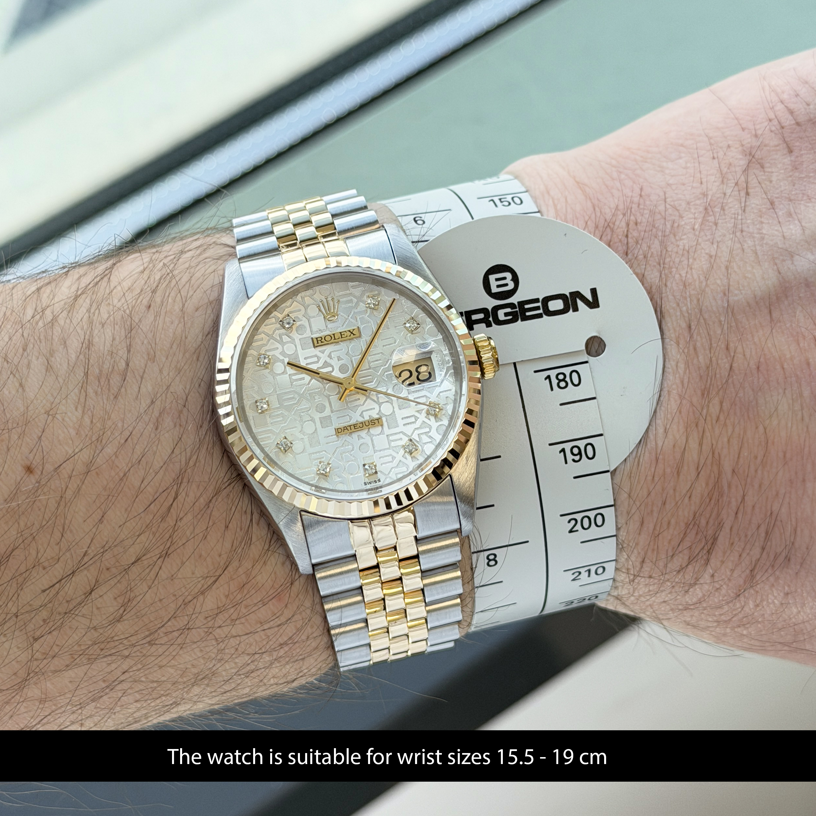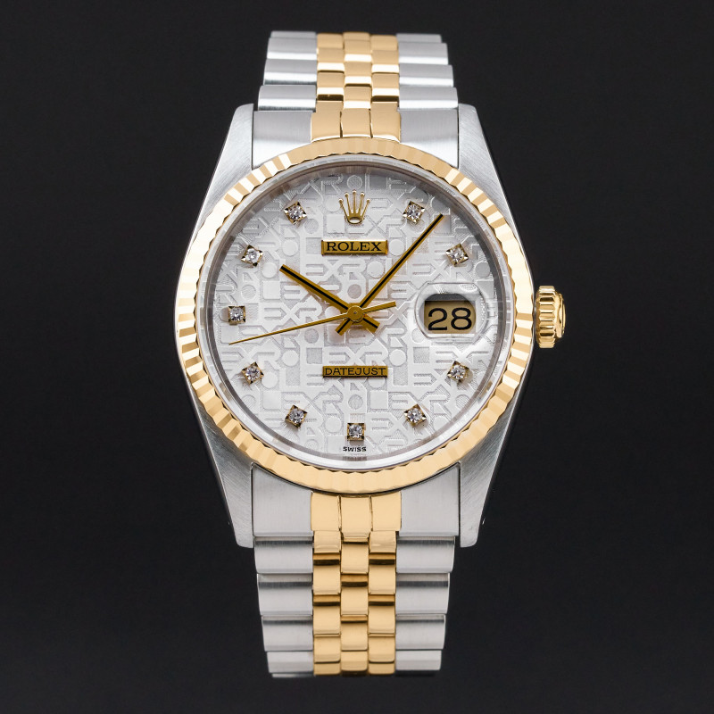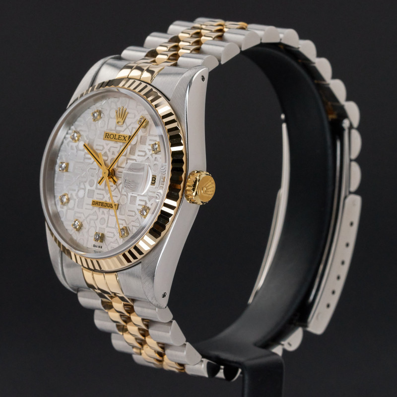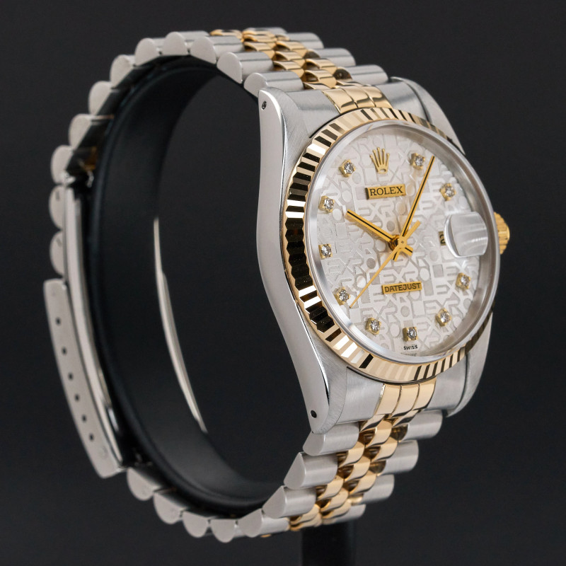 This Rolex Datejust 16233 features a Silver jubilee small diamond dial and is crafted from 18K yellow gold and stainless steel, with a production year of 1993.