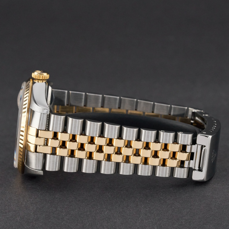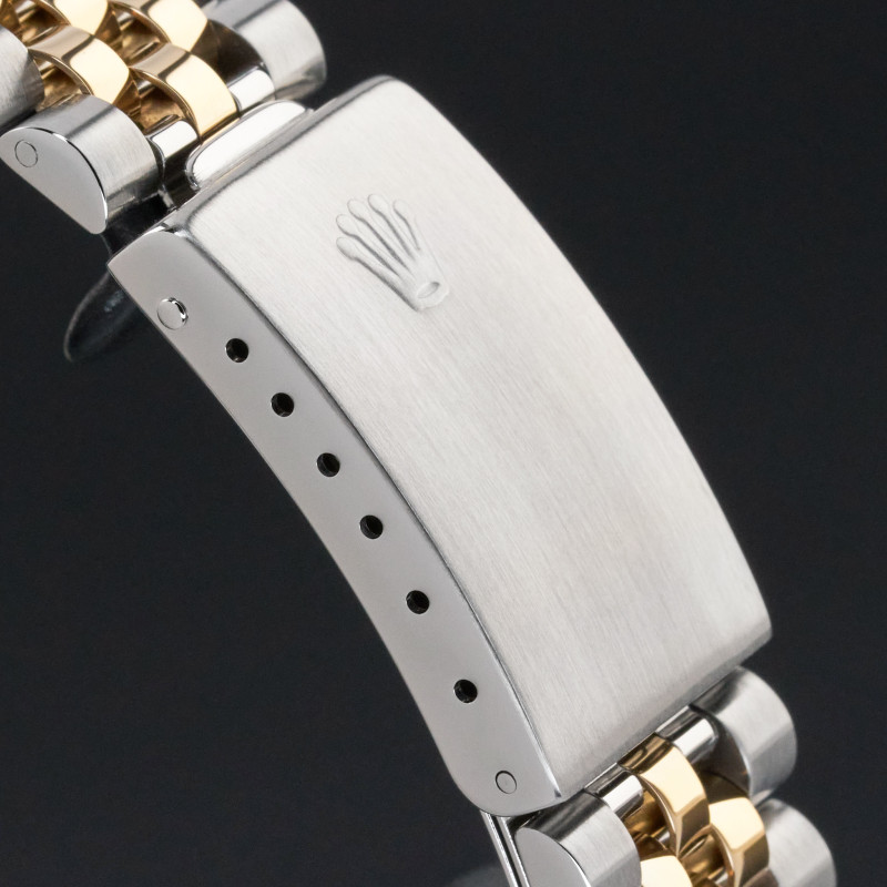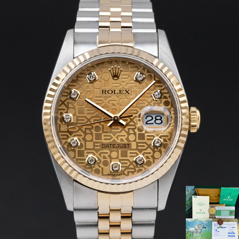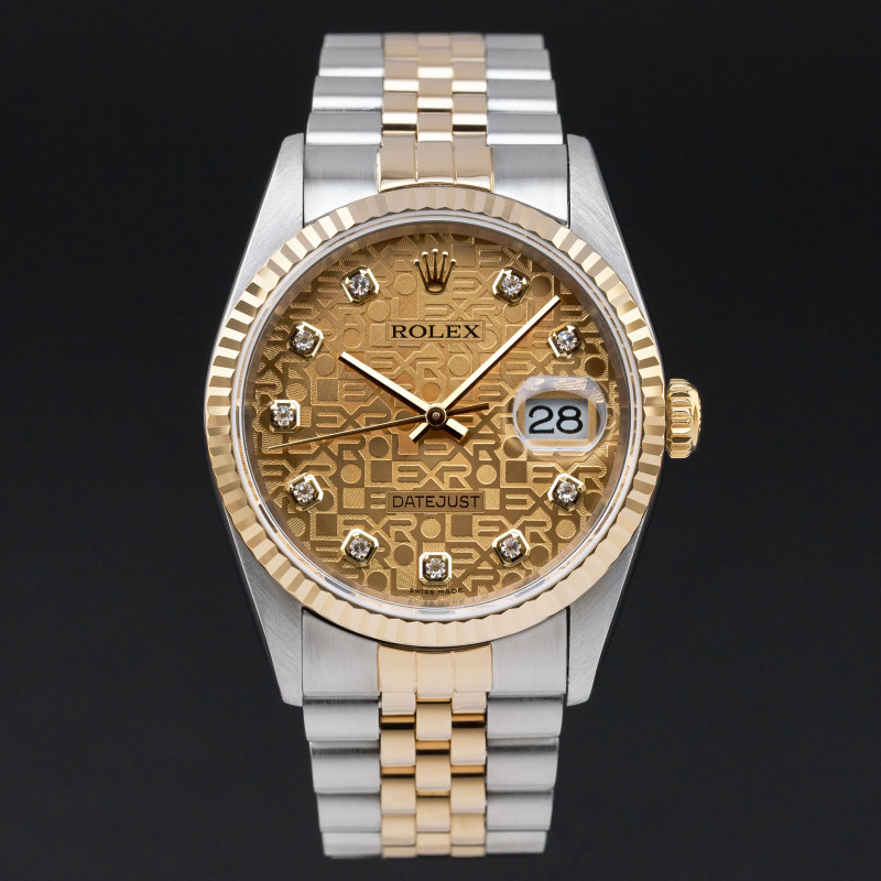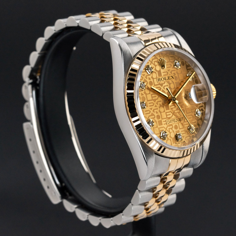 This Rolex Datejust 16233 features a Champagne jubilee big diamond dial and is crafted from 18K yellow gold and stainless steel, with a production year of 1994.