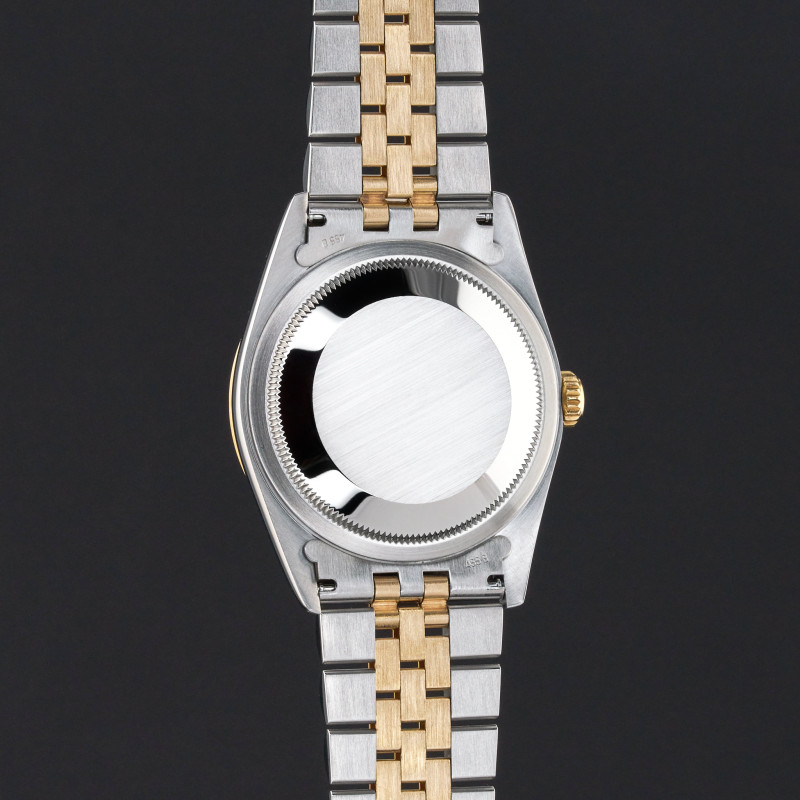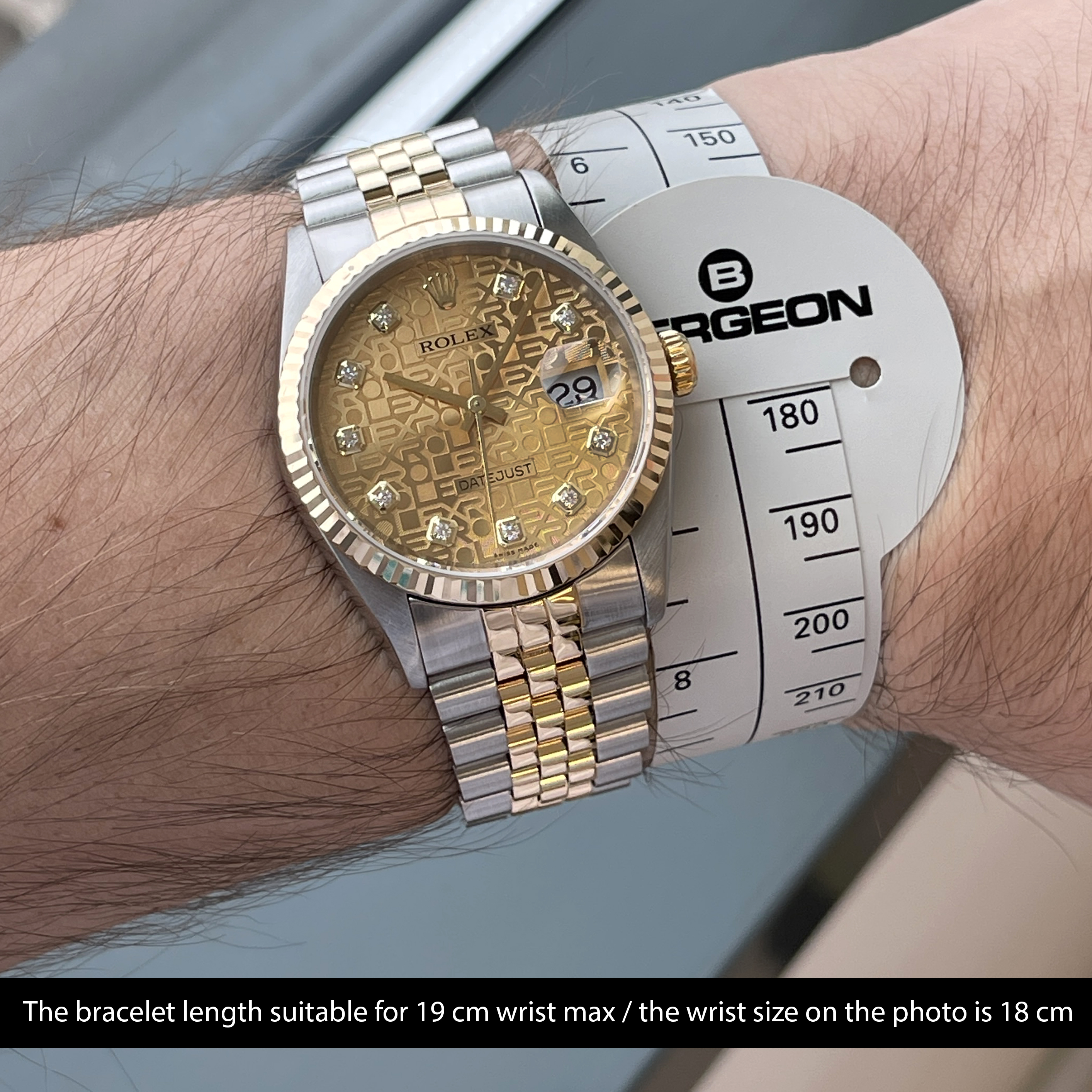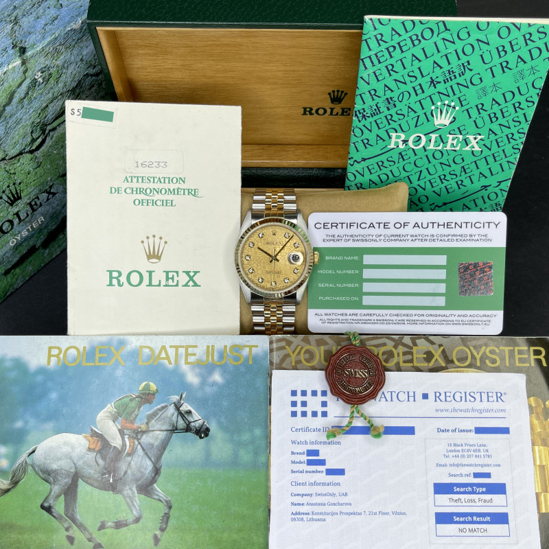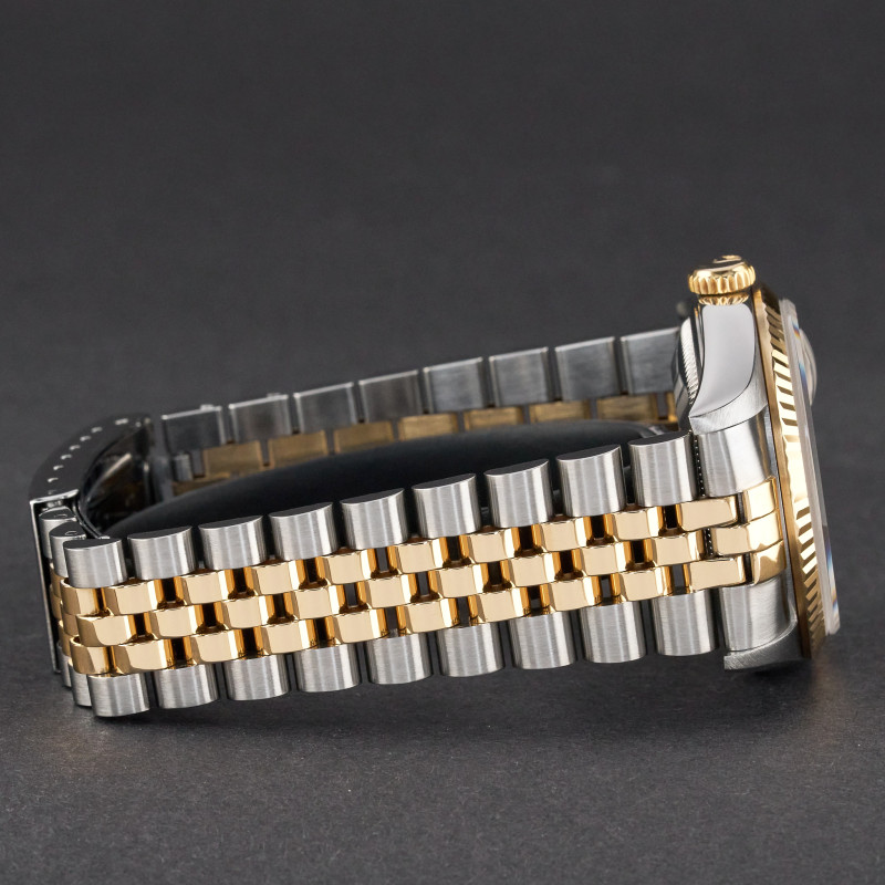 This Rolex Datejust 16233 features a Champagne jubilee big diamond dial and is crafted from 18K yellow gold and stainless steel, with a production year of 1994.