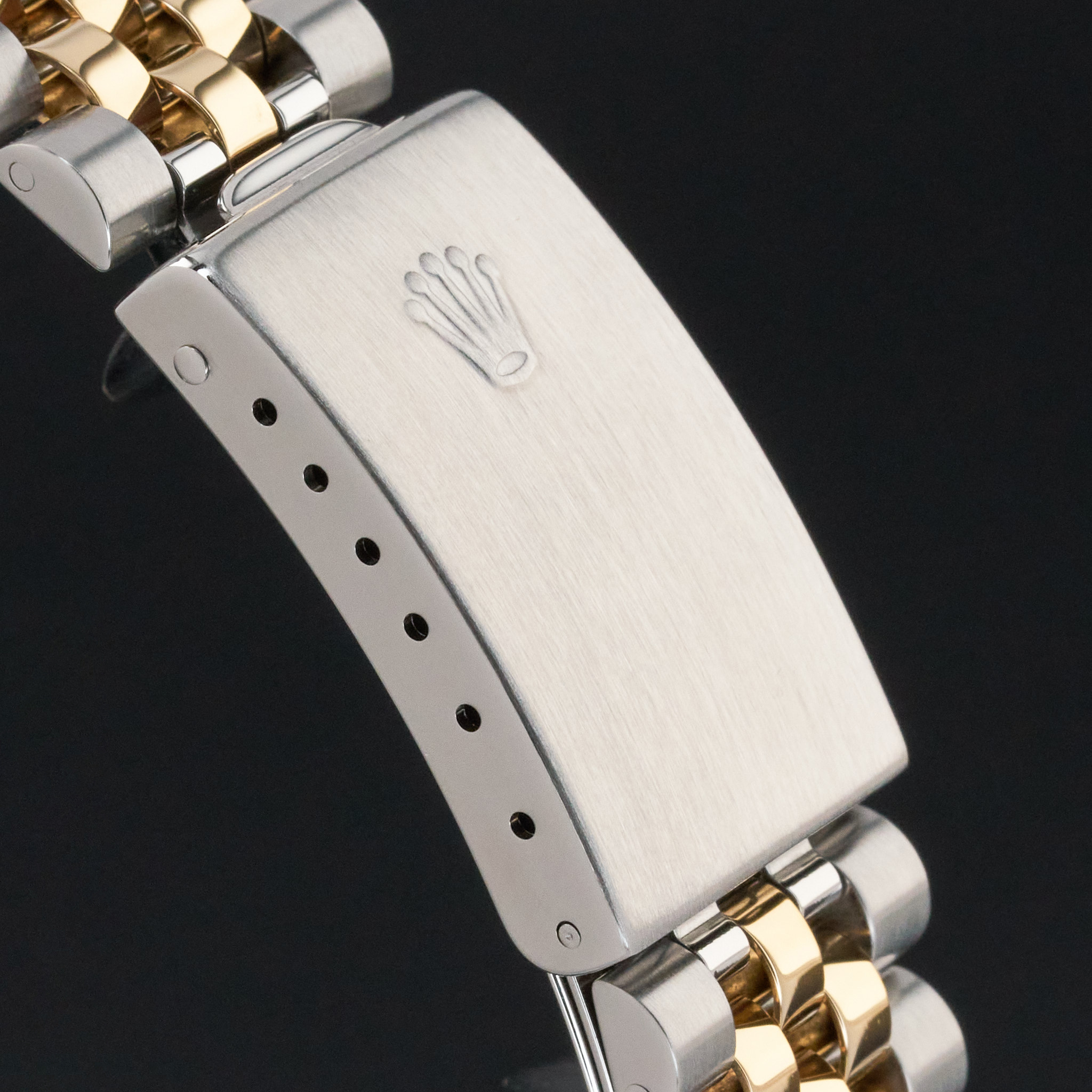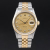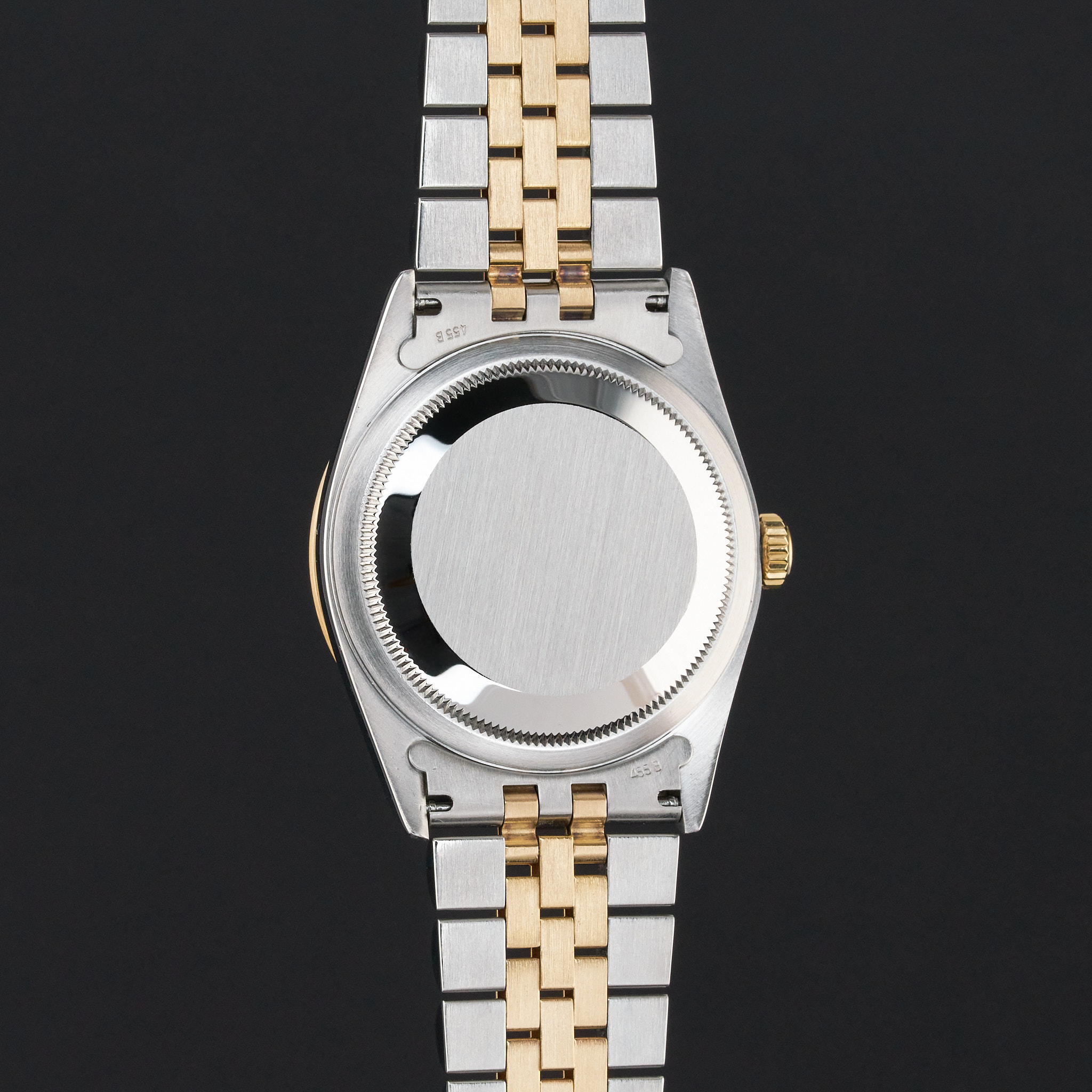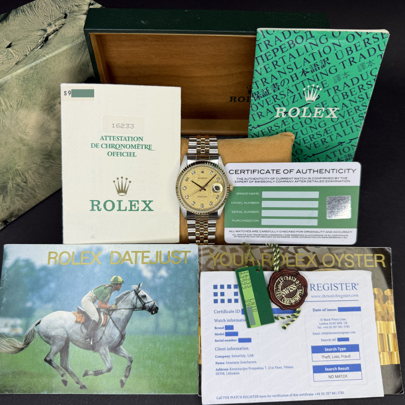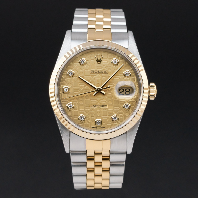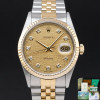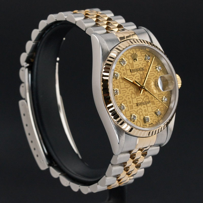 This Rolex Datejust 16233 features a Champagne jubilee big diamond dial and is crafted from 18K yellow gold and stainless steel, with a production year of 1994.