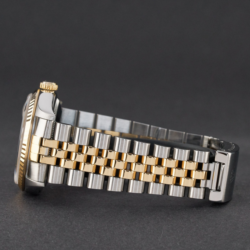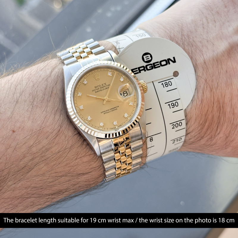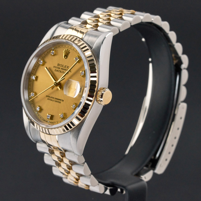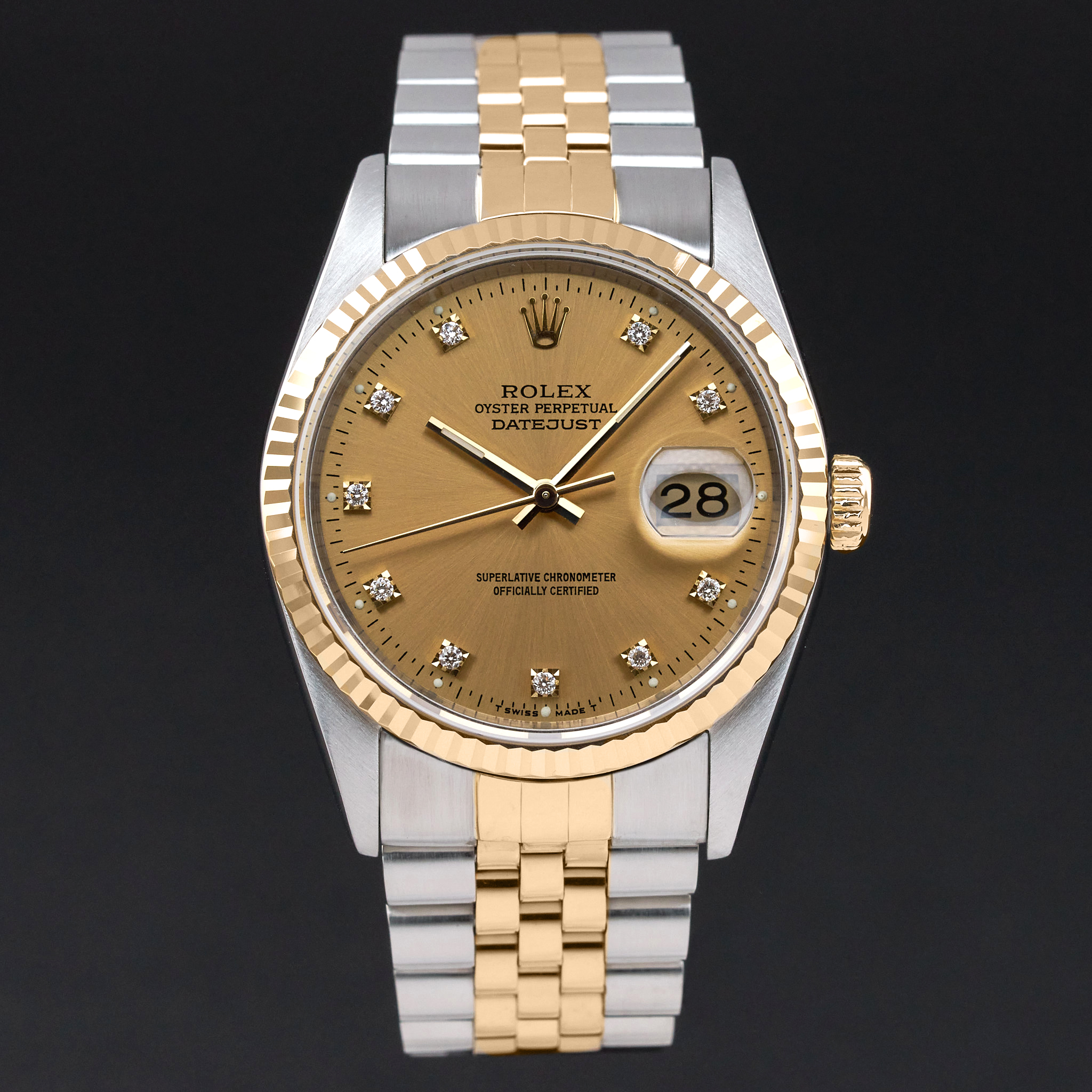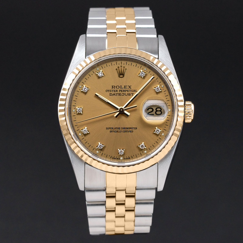 This Rolex Datejust 16233 features a Champagne small diamond dial and is crafted from 18K yellow gold and stainless steel, with a production year of 1994.