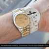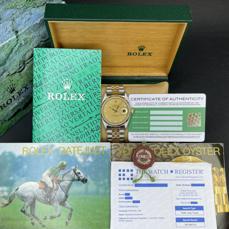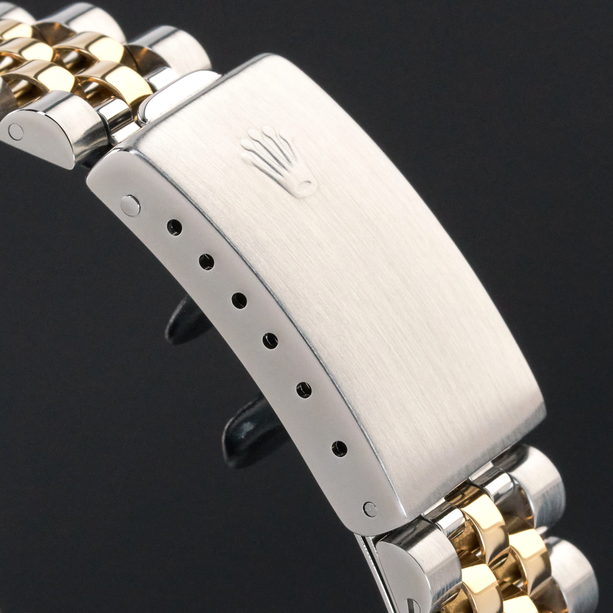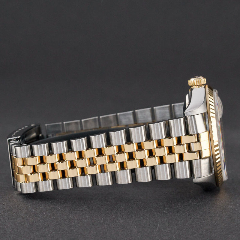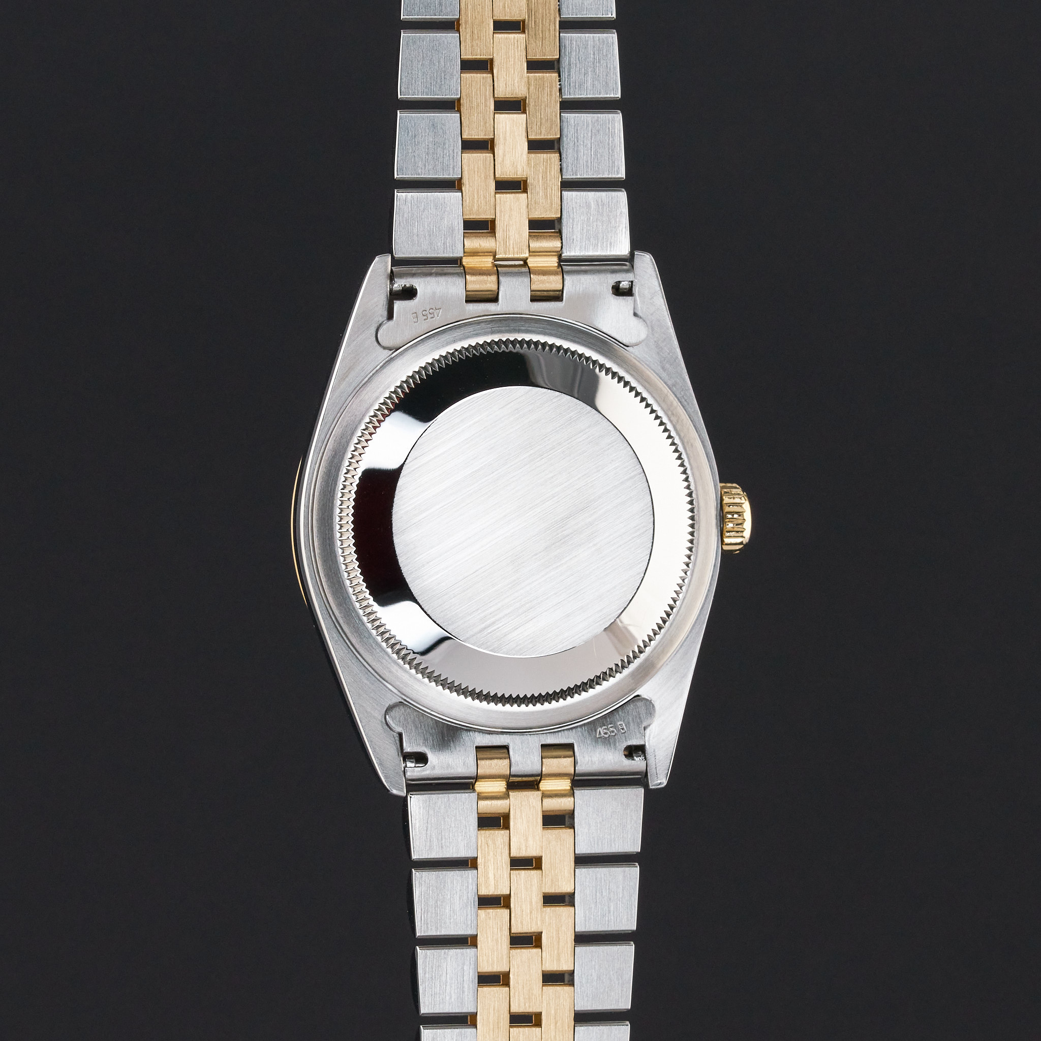 This Rolex Datejust 16233 features a Champagne small diamond dial and is crafted from 18K yellow gold and stainless steel, with a production year of 1994.