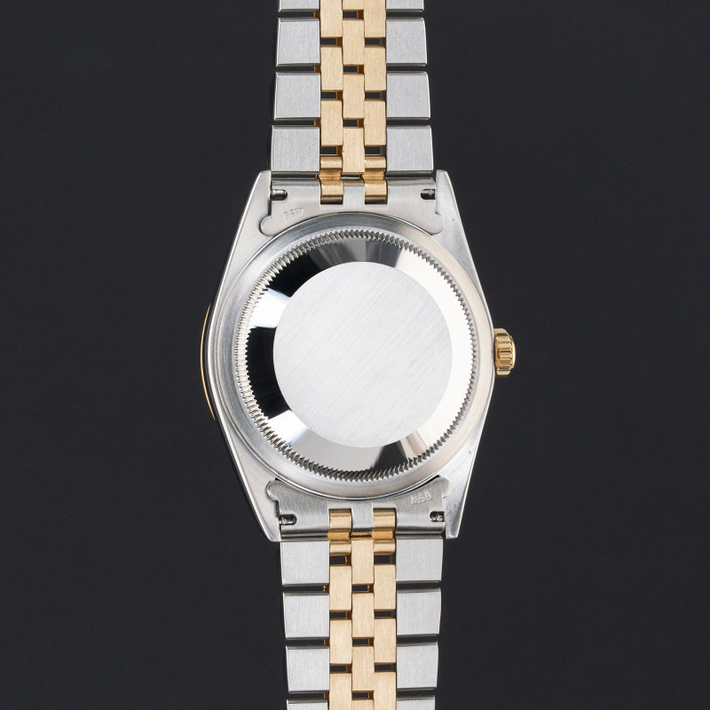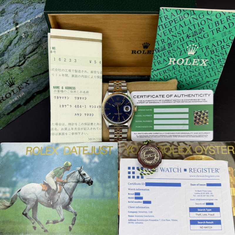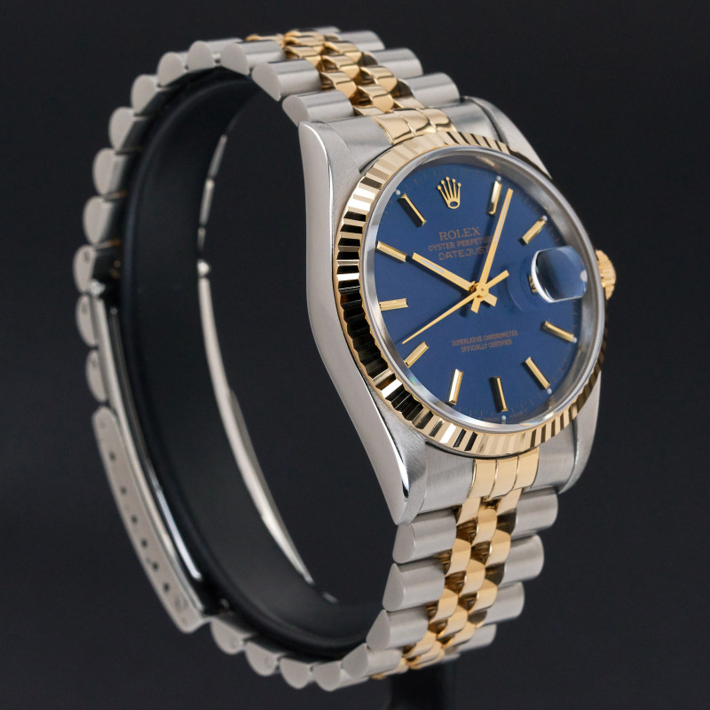 This Rolex Datejust 16233 features a Blue dial and is crafted from 18K yellow gold and stainless steel, with a production year of 1995.