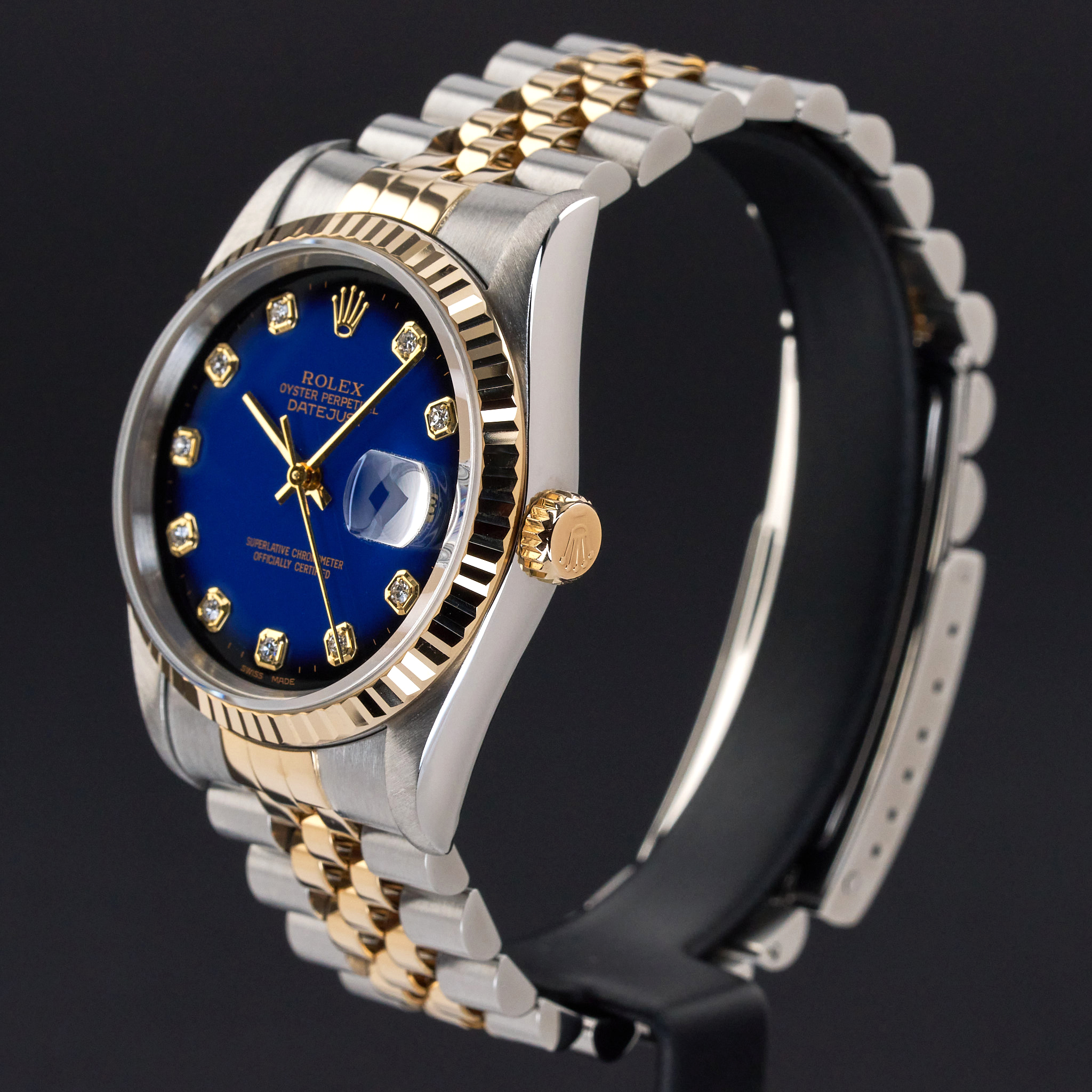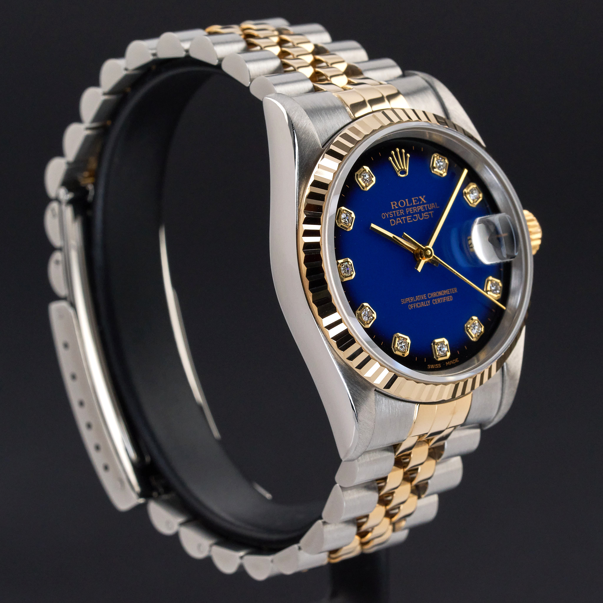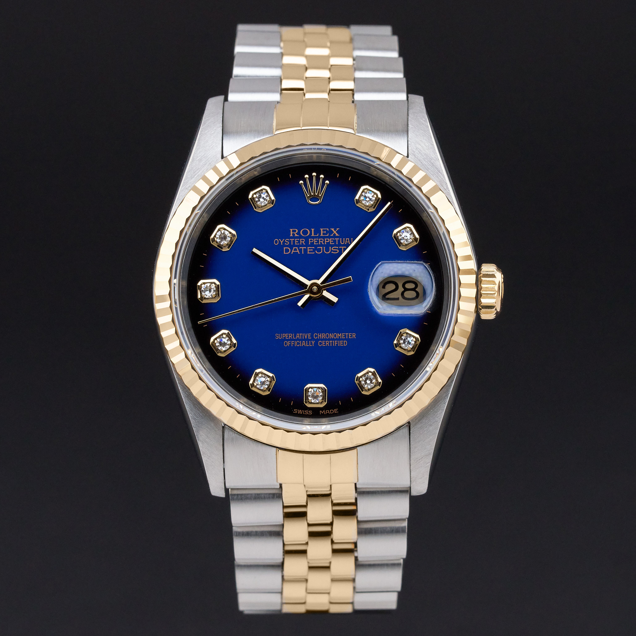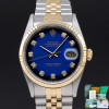 This Rolex Datejust 16233 features a Blue vignette big diamond dial and is crafted from 18K yellow gold and stainless steel, with a production year of 1995.