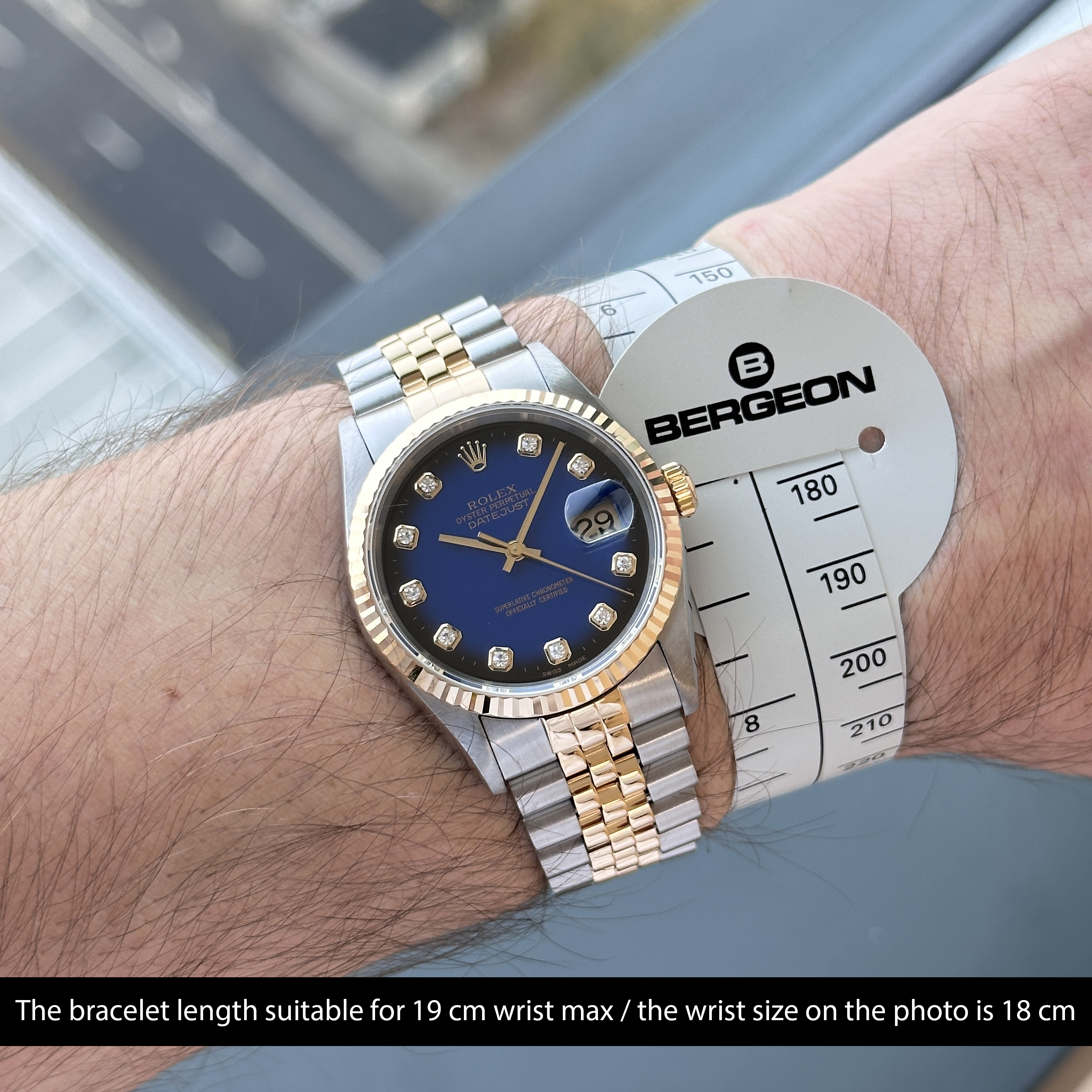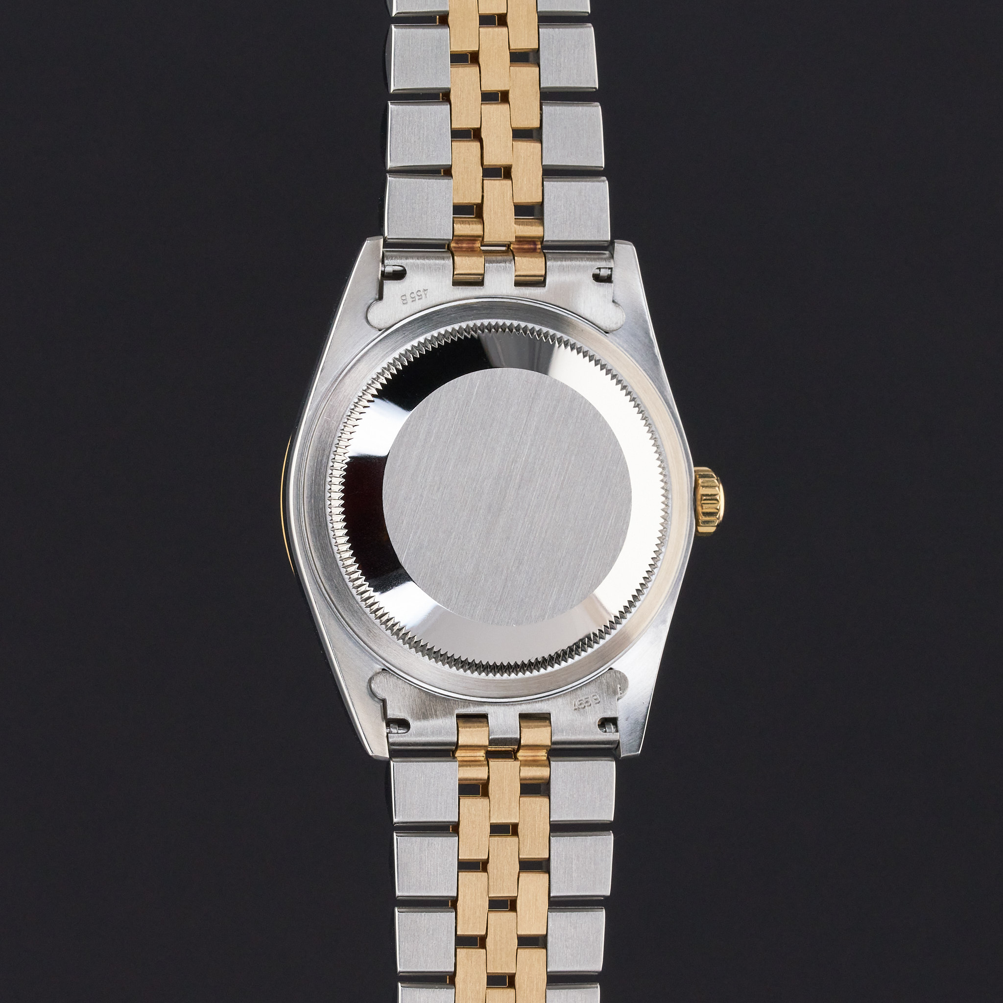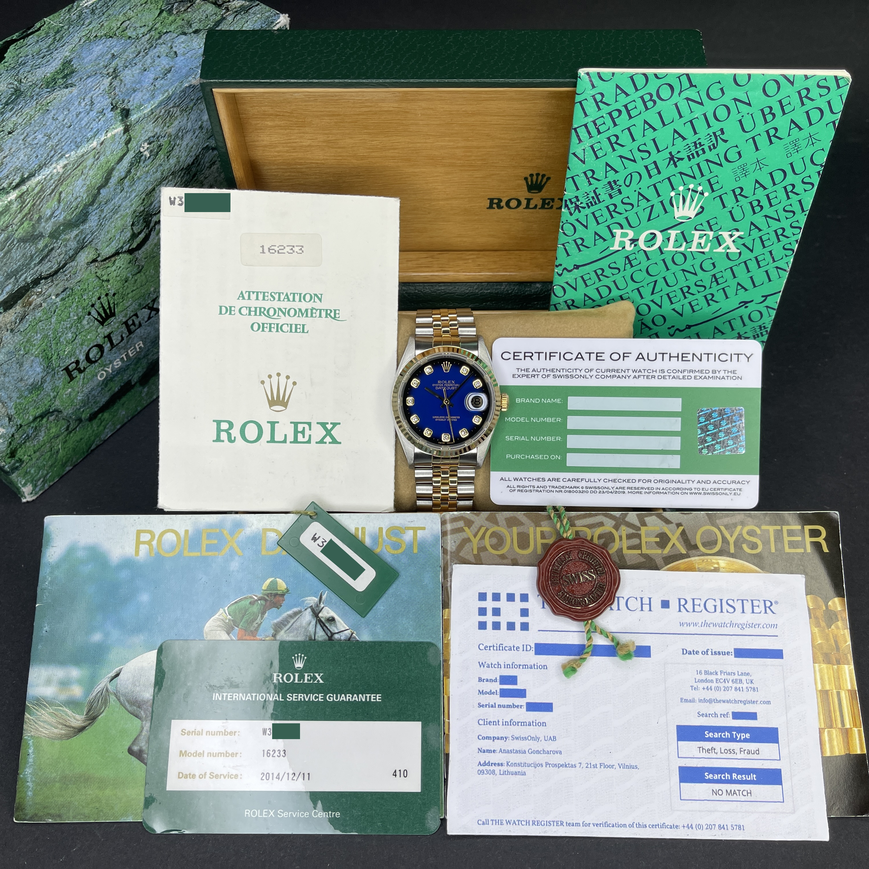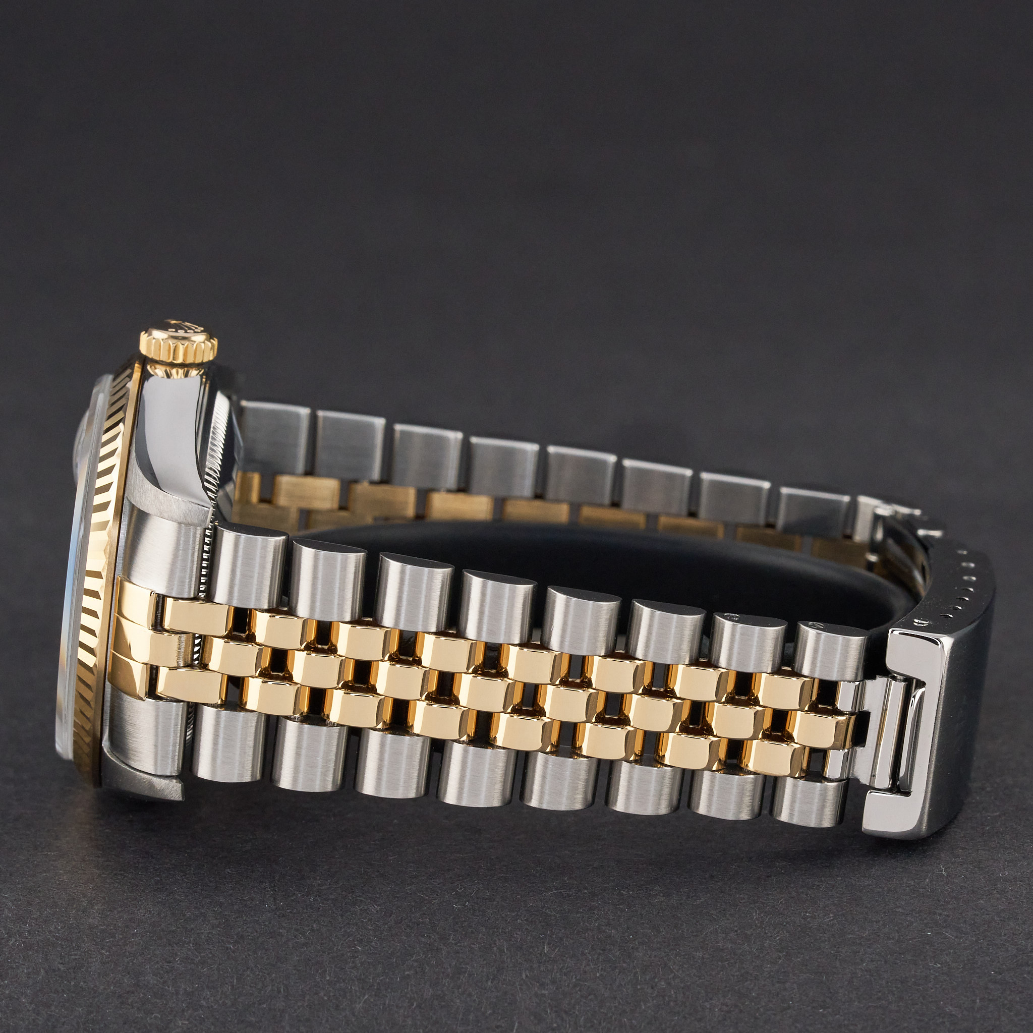 This Rolex Datejust 16233 features a Blue vignette big diamond dial and is crafted from 18K yellow gold and stainless steel, with a production year of 1995.
