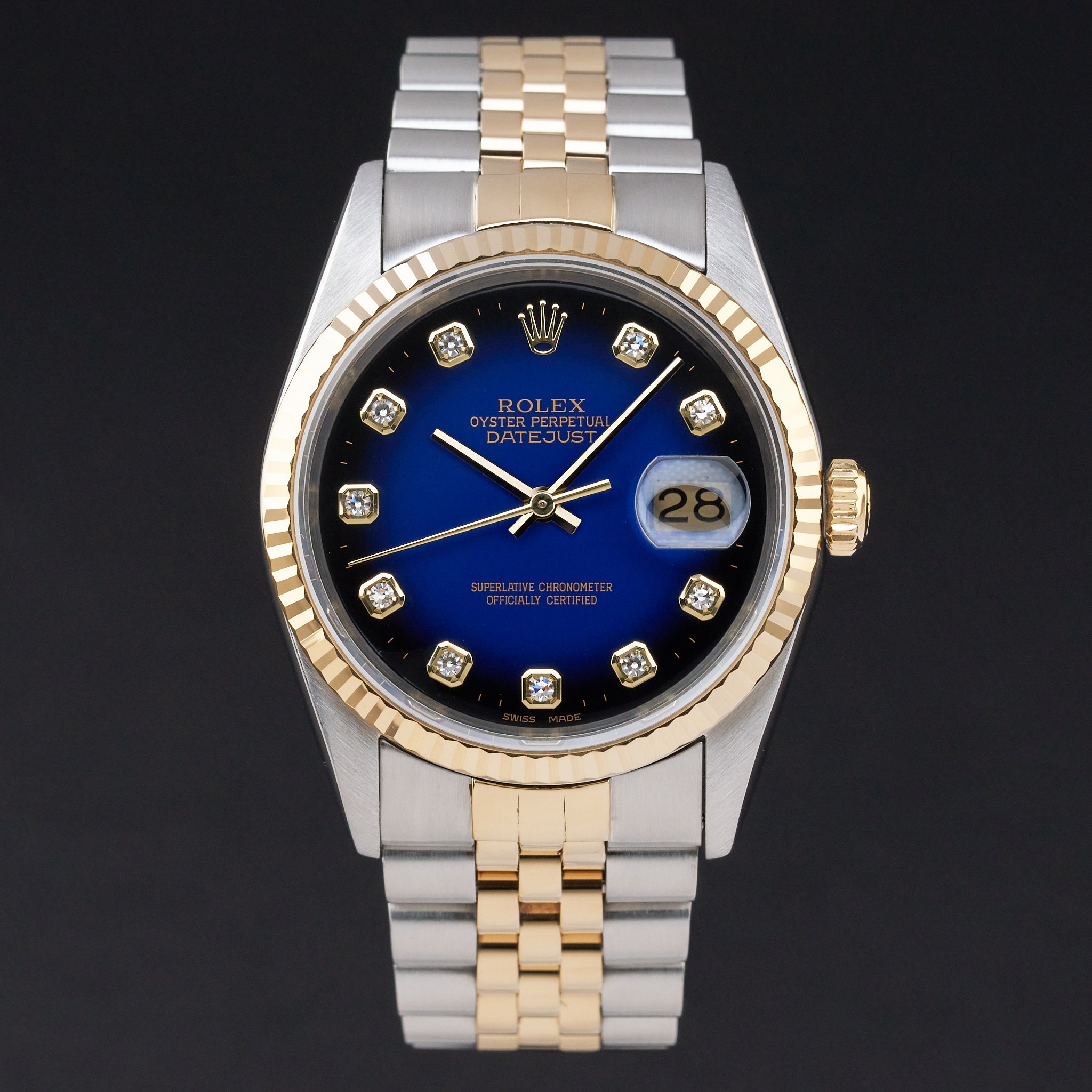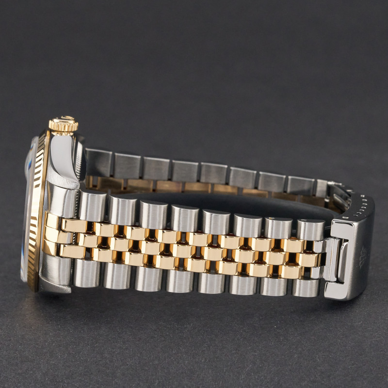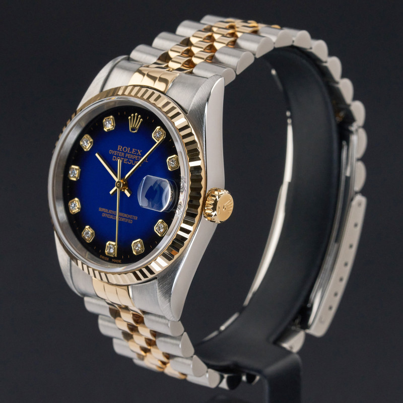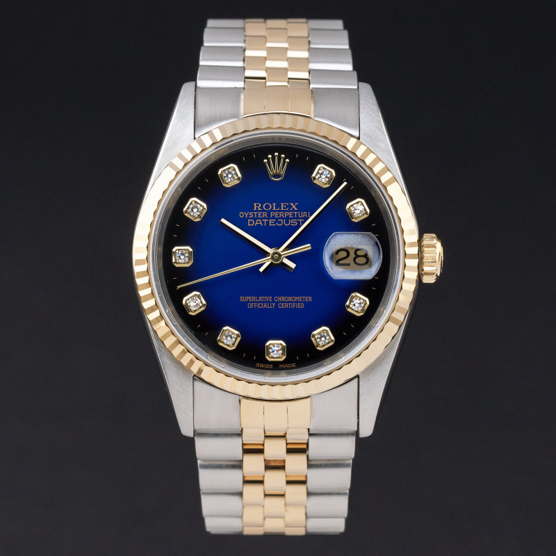 This Rolex Datejust 16233 features a Blue vignette big diamond dial and is crafted from 18K yellow gold and stainless steel, with a production year of 1995.