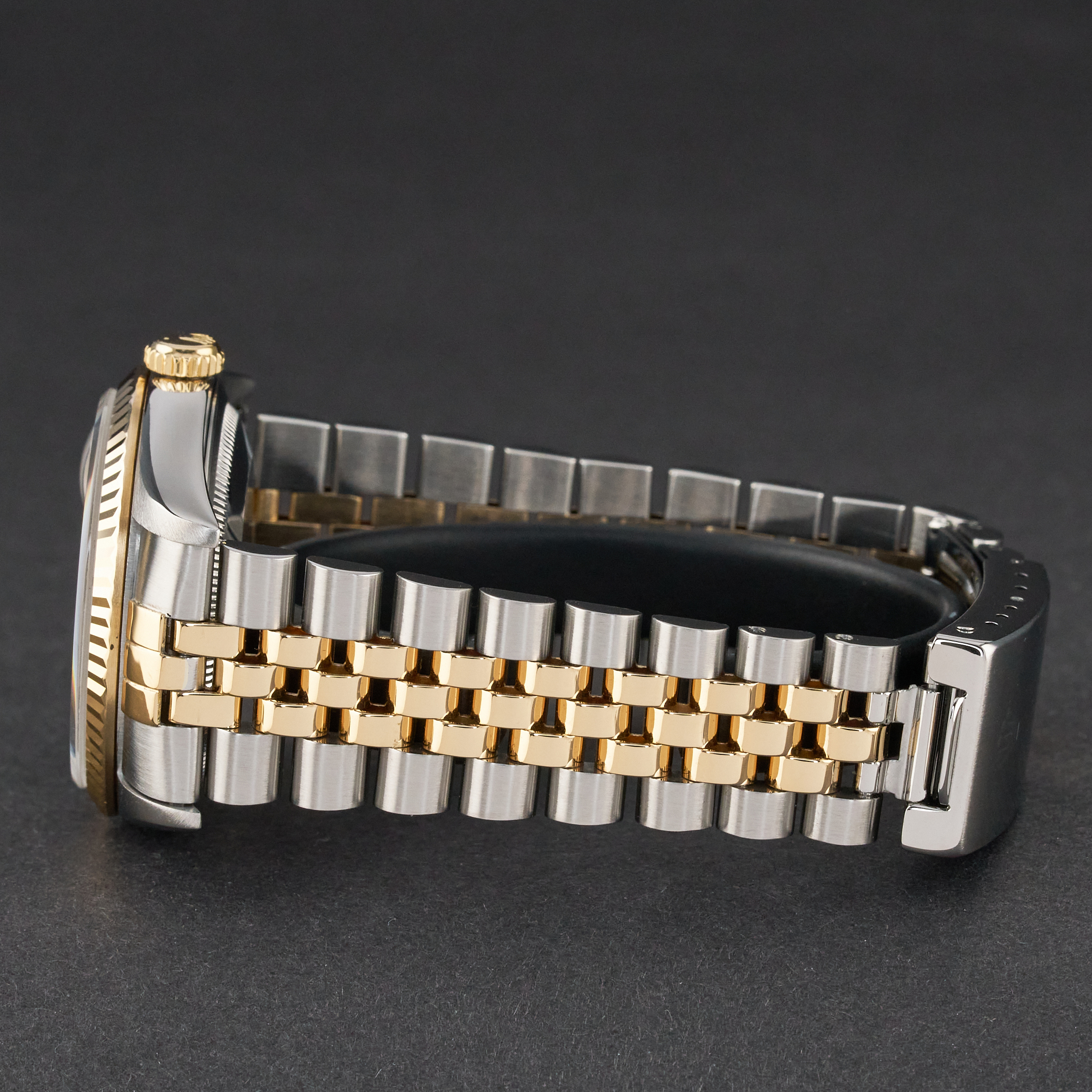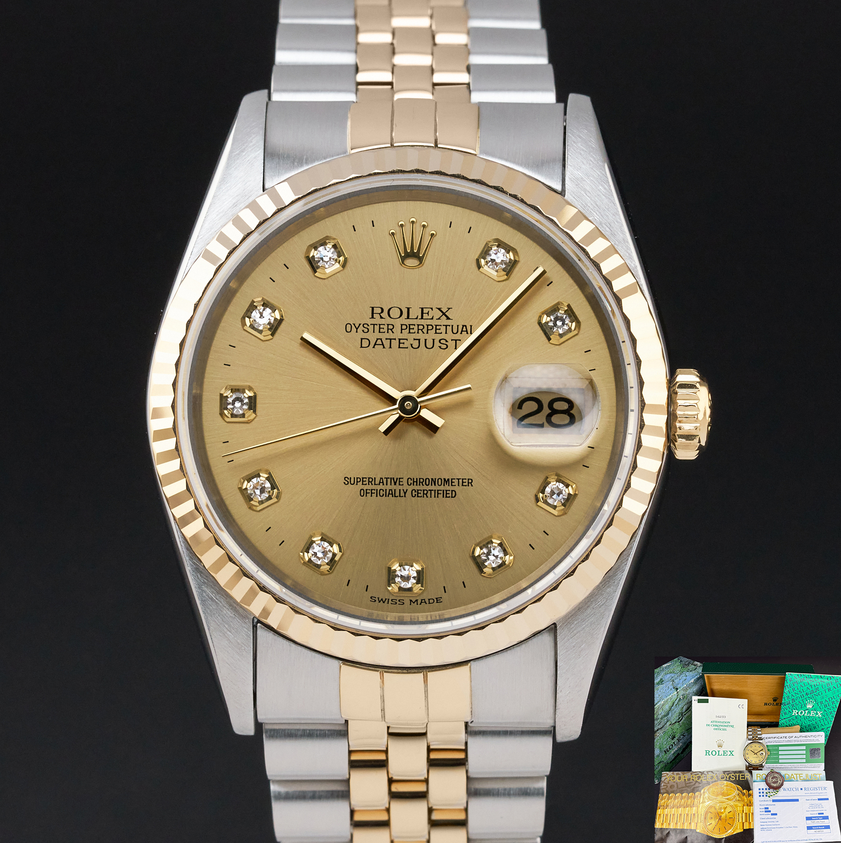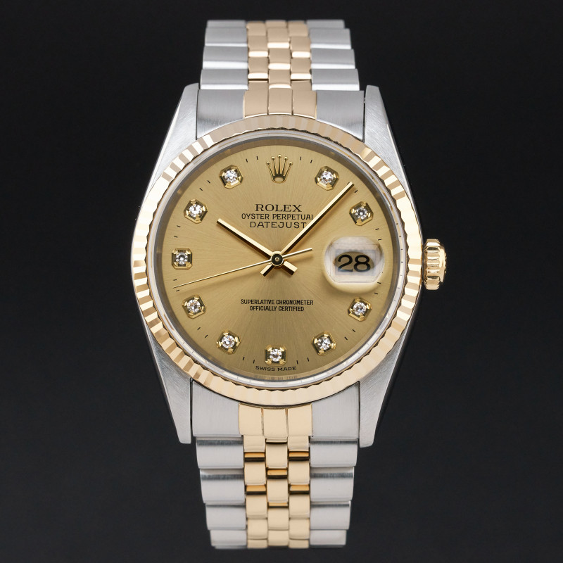This Rolex Datejust 16233 features a Champagne big diamond dial and is crafted from 18K yellow gold and stainless steel, with a production year of 1995.