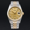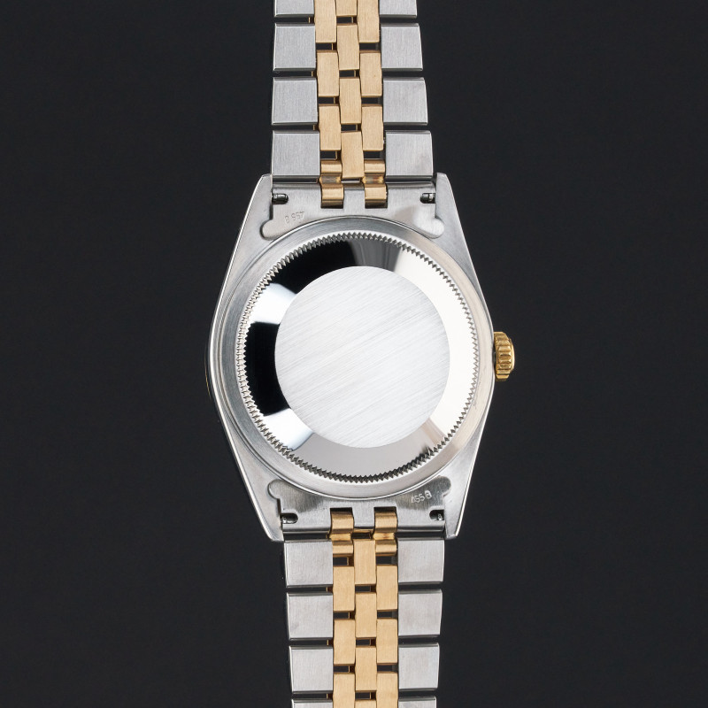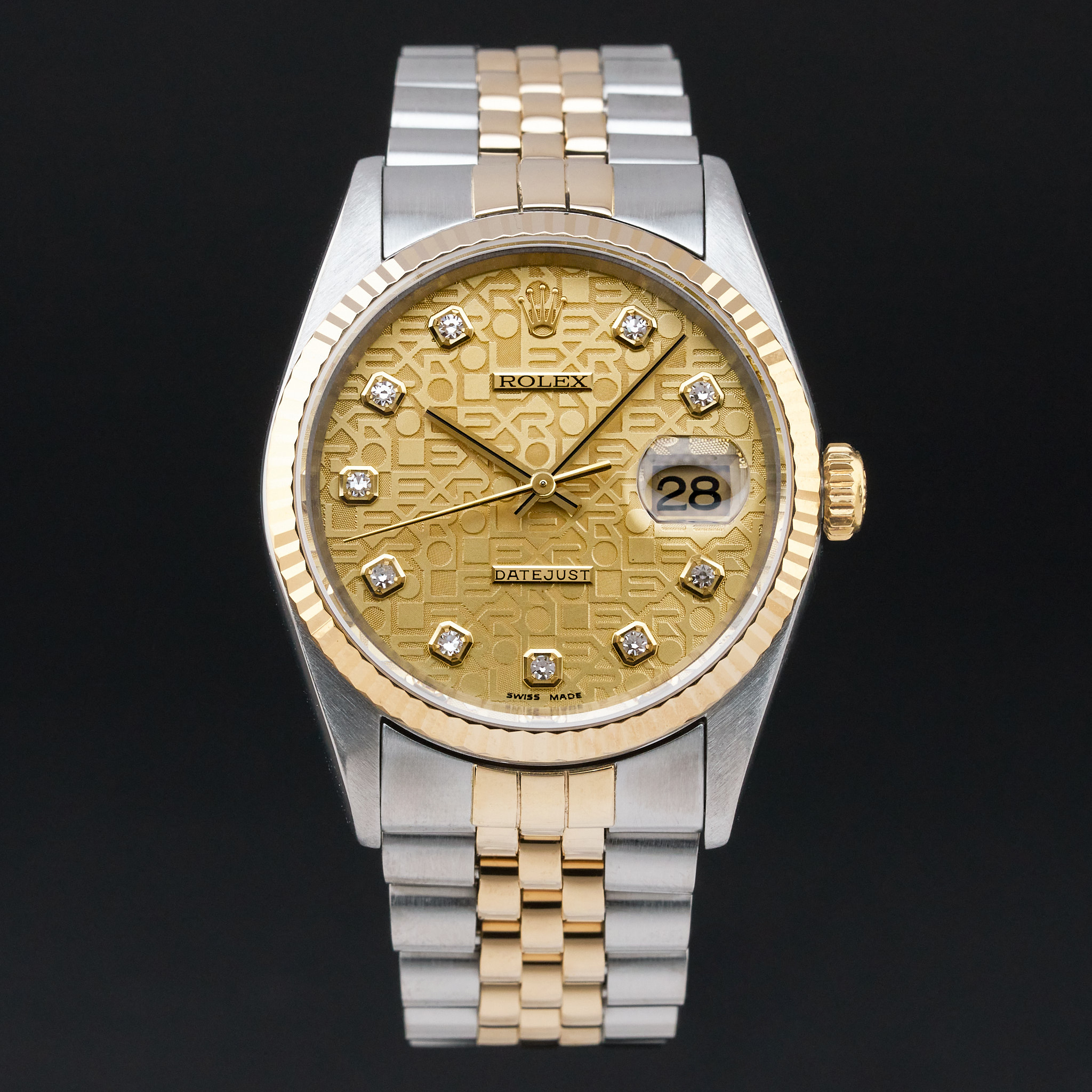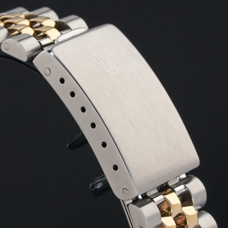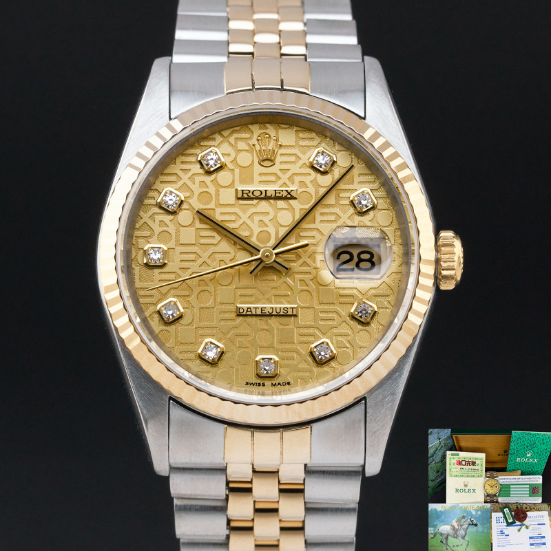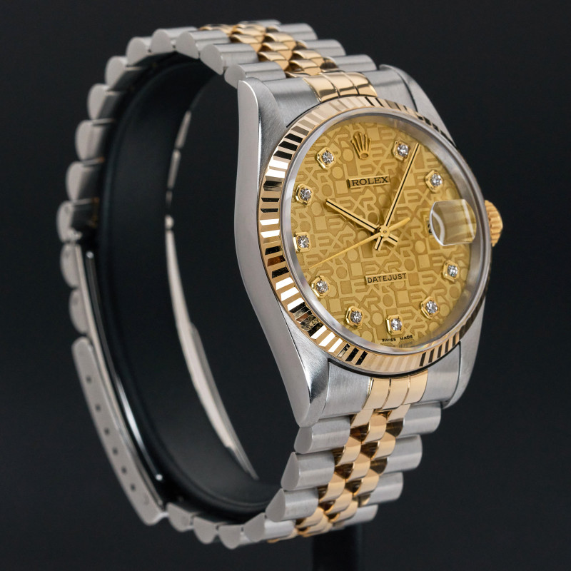 This Rolex Datejust 16233 features a Champagne jubilee big diamond dial and is crafted from 18K yellow gold and stainless steel, with a production year of 1995.