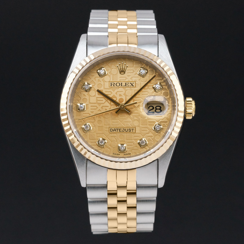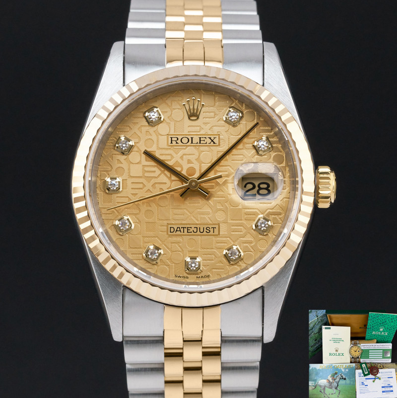 This Rolex Datejust 16233 features a Champagne jubilee big diamond dial and is crafted from 18K yellow gold and stainless steel, with a production year of 1995.