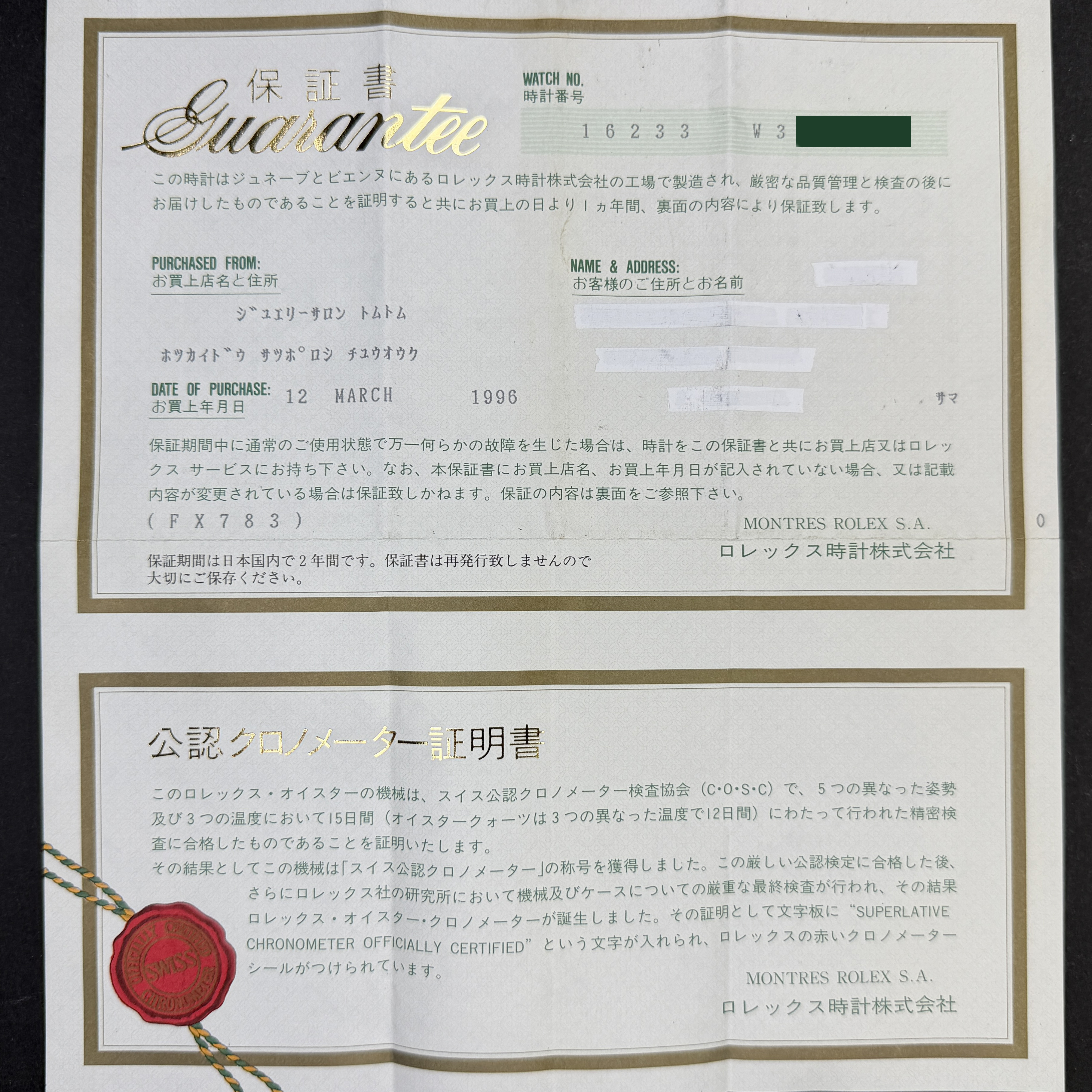 This Rolex Datejust 16233 features an Ivory jubilee Arabic dial and is crafted from 18K yellow gold and stainless steel, with a production year of 1995.