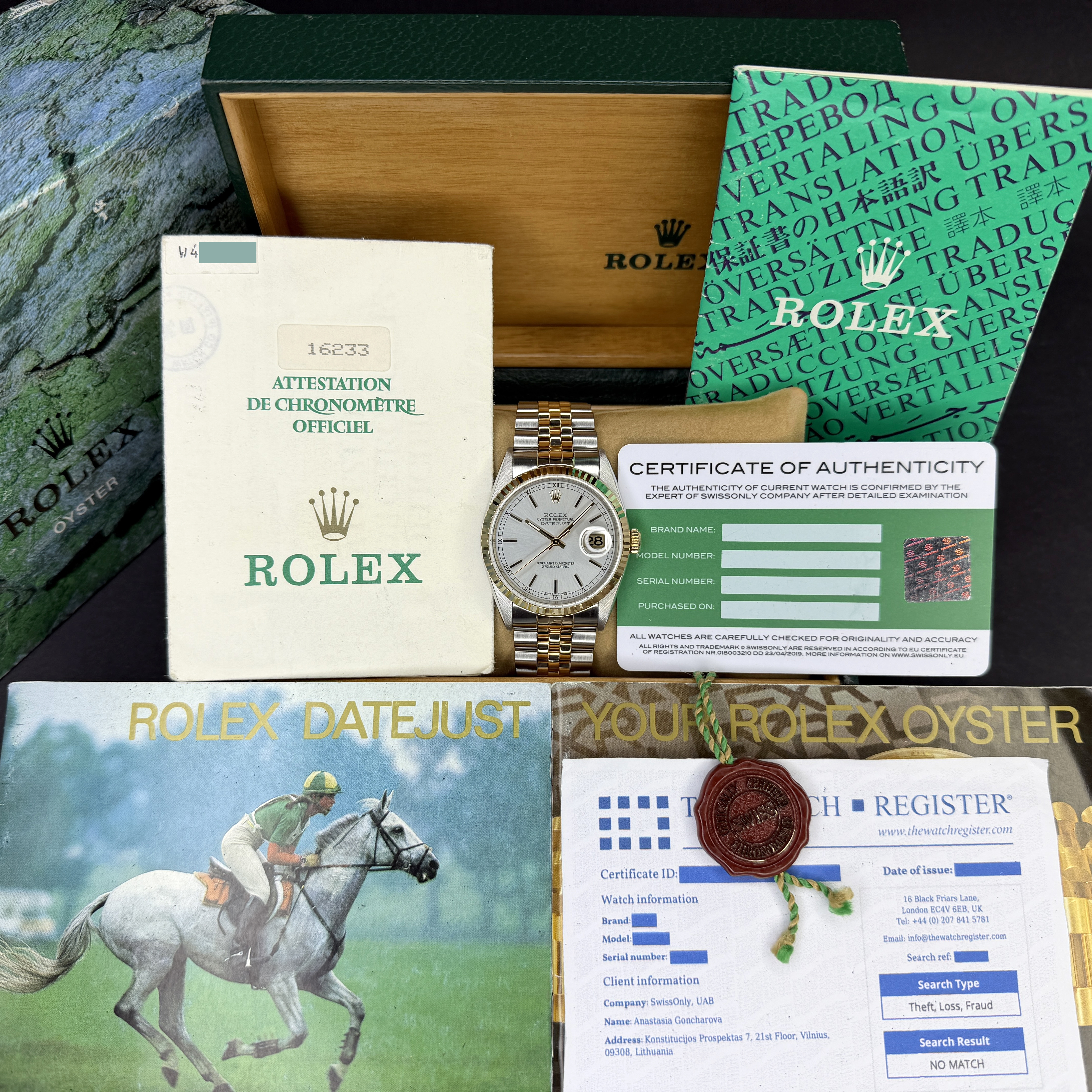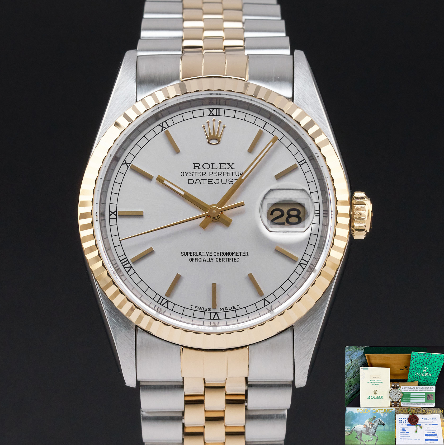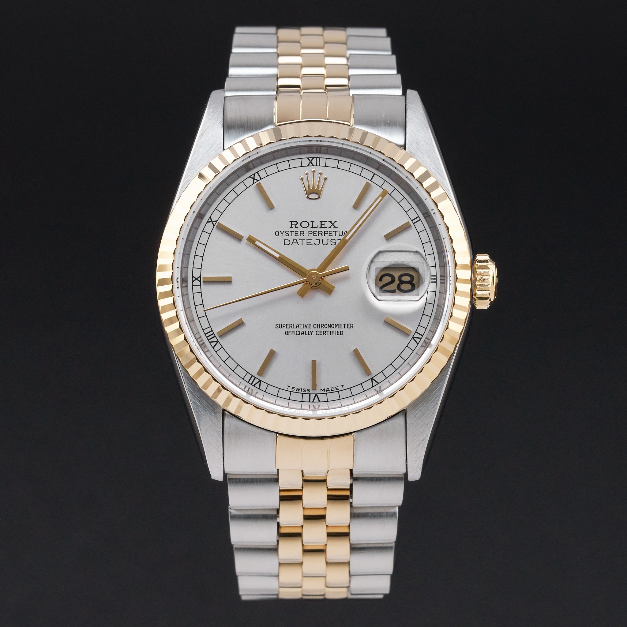 This Rolex Datejust 16233 features a Silver dial and is crafted from 18K yellow gold and stainless steel, with a production year of 1995.