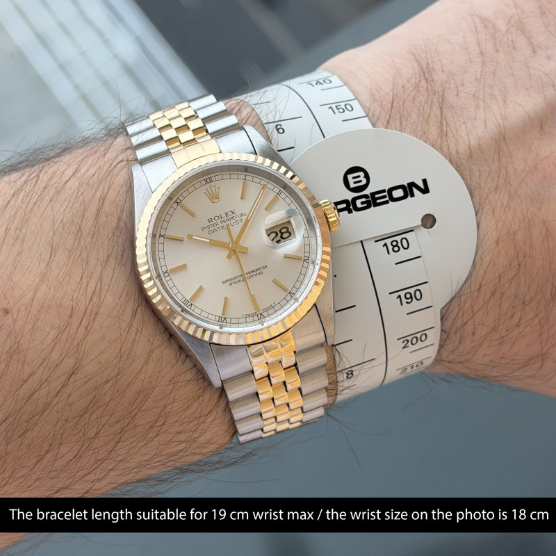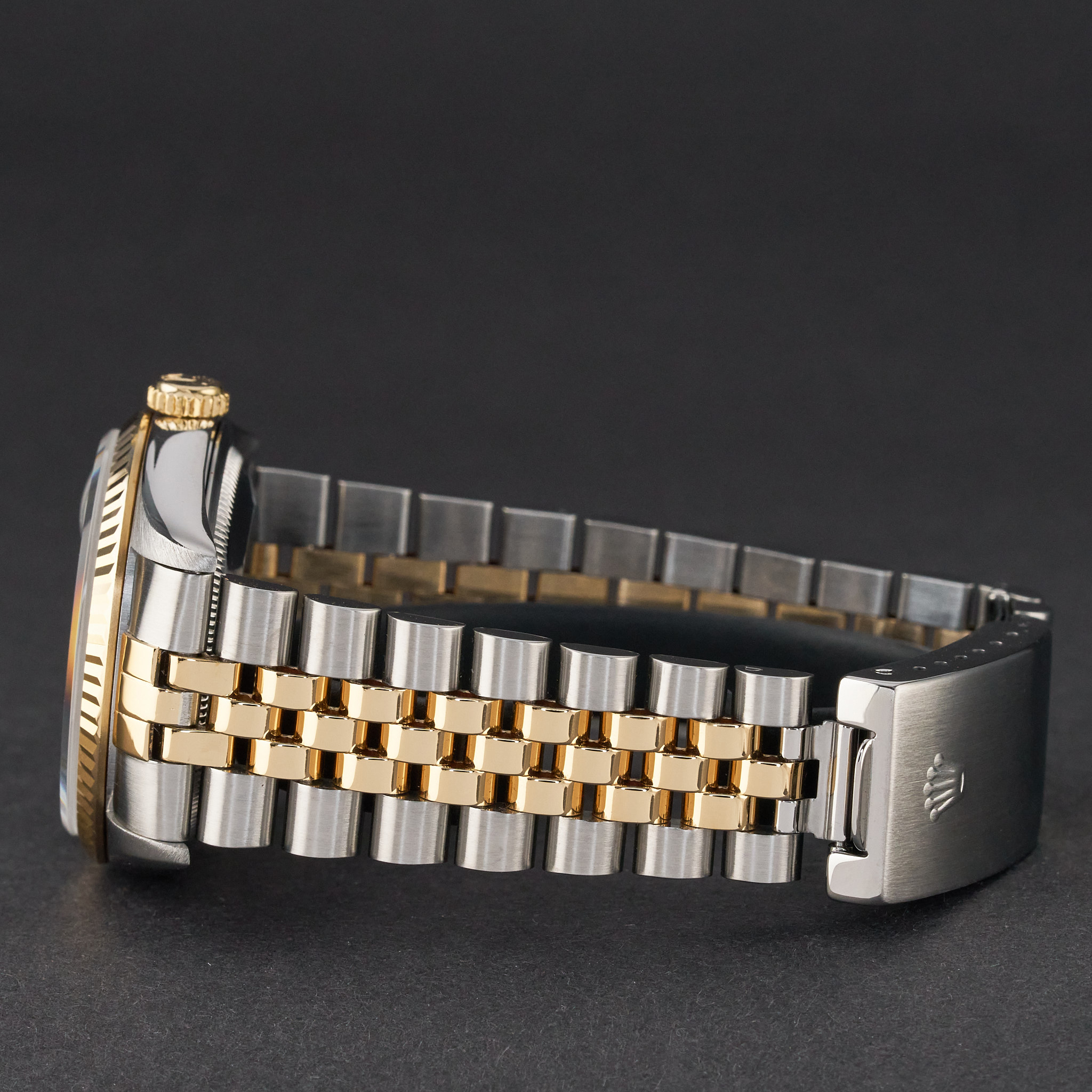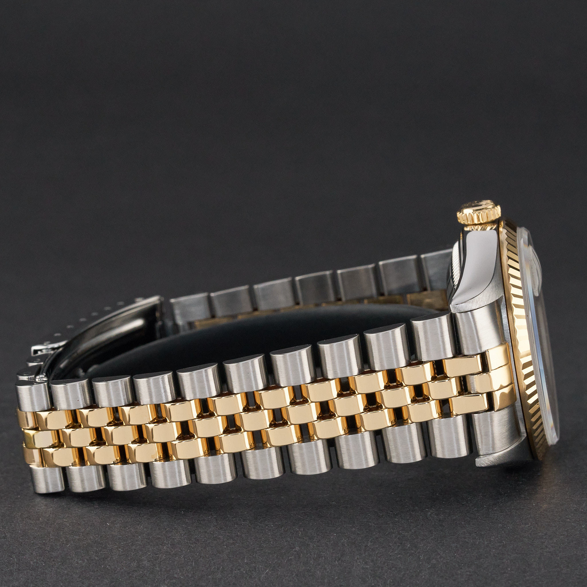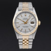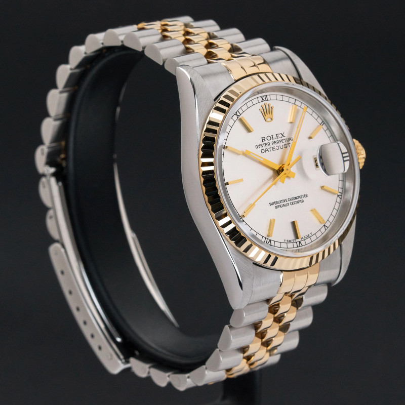 This Rolex Datejust 16233 features a Silver dial and is crafted from 18K yellow gold and stainless steel, with a production year of 1995.