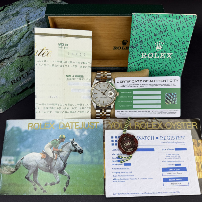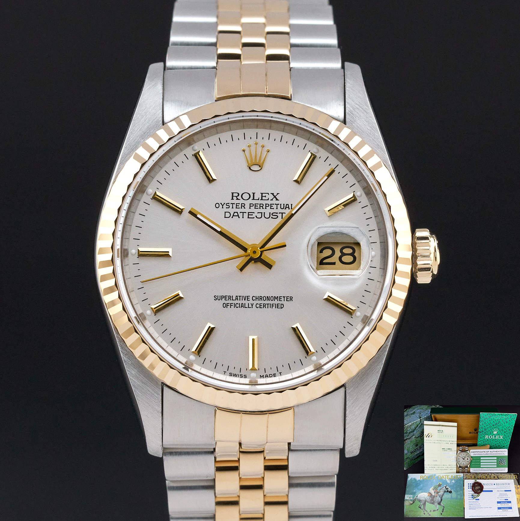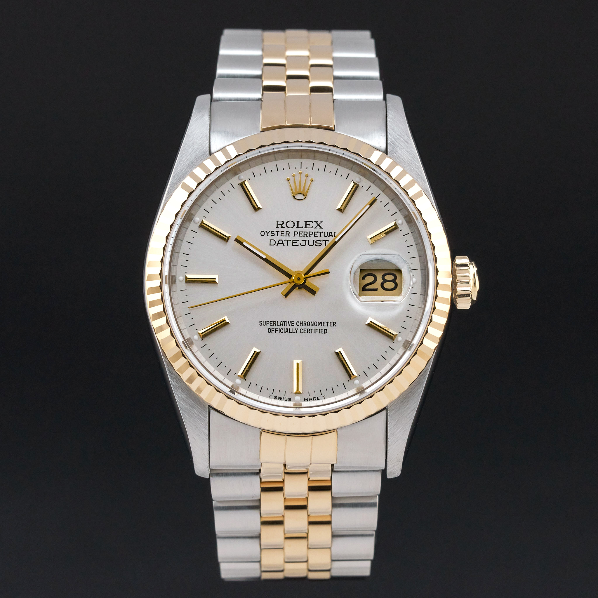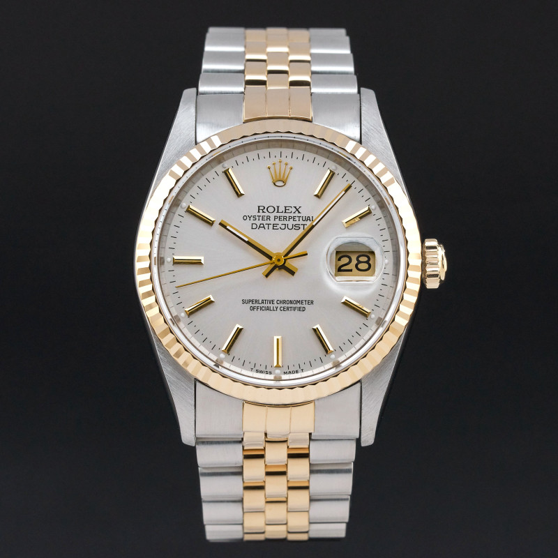 This Rolex Datejust 16233 features a Silver dial and is crafted from 18K yellow gold and stainless steel, with a production year of 1995.