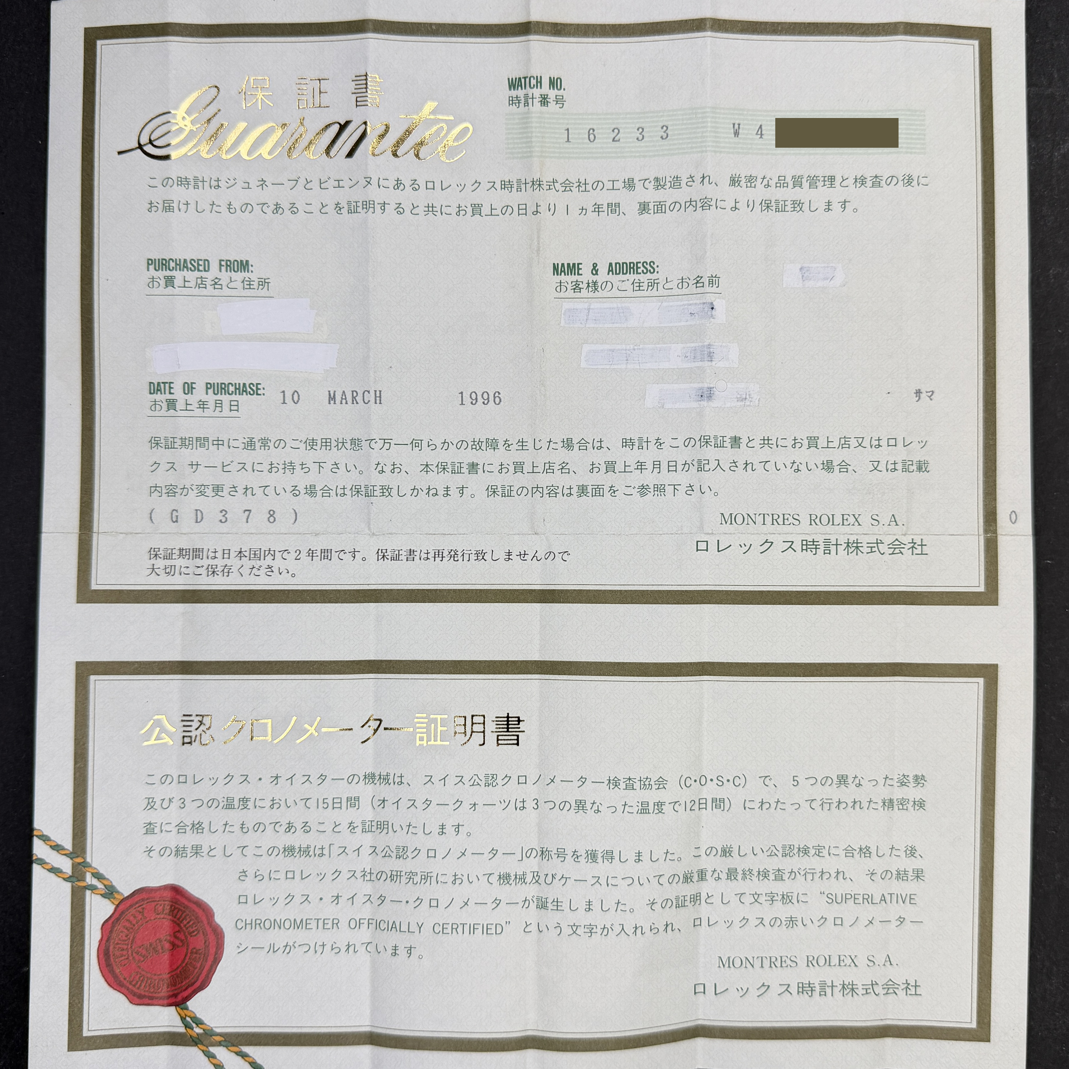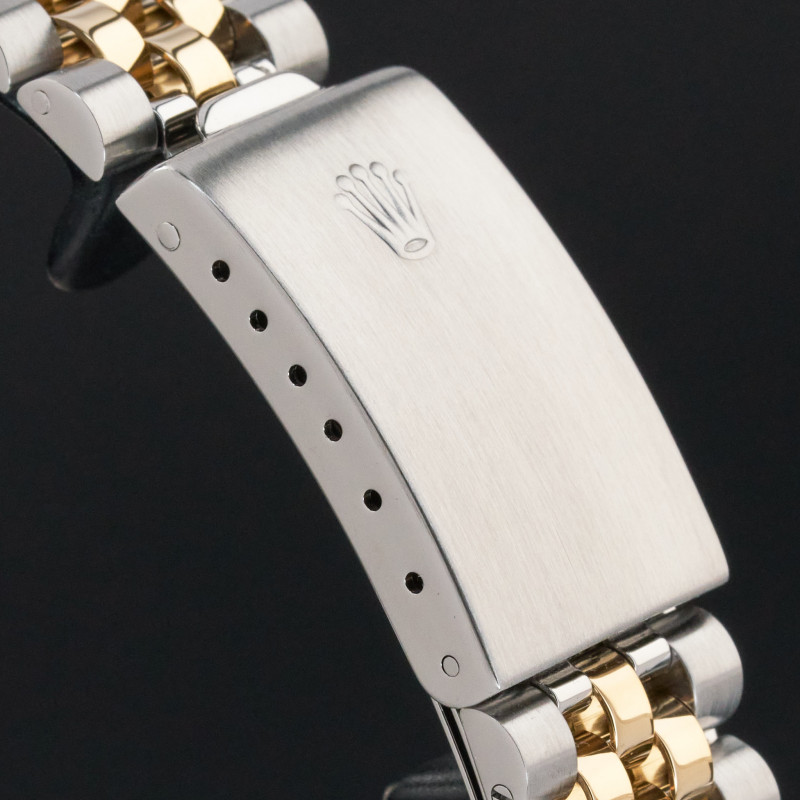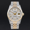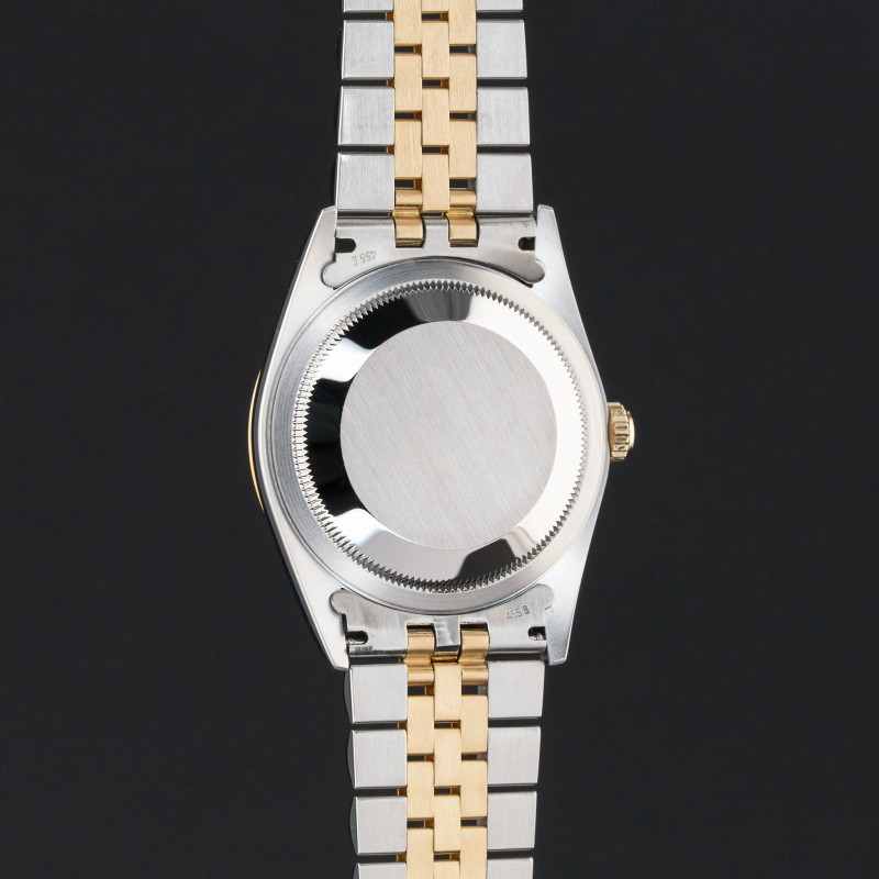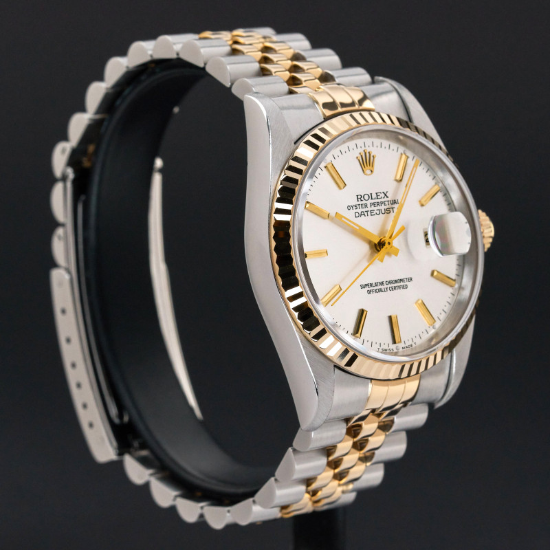 This Rolex Datejust 16233 features a Silver dial and is crafted from 18K yellow gold and stainless steel, with a production year of 1995.