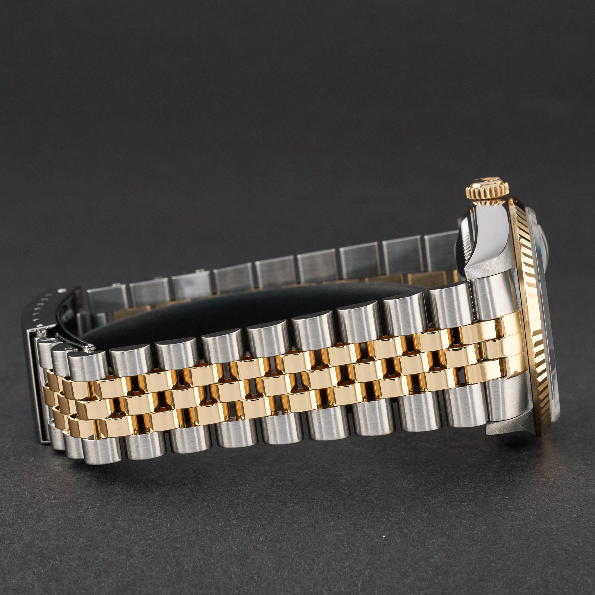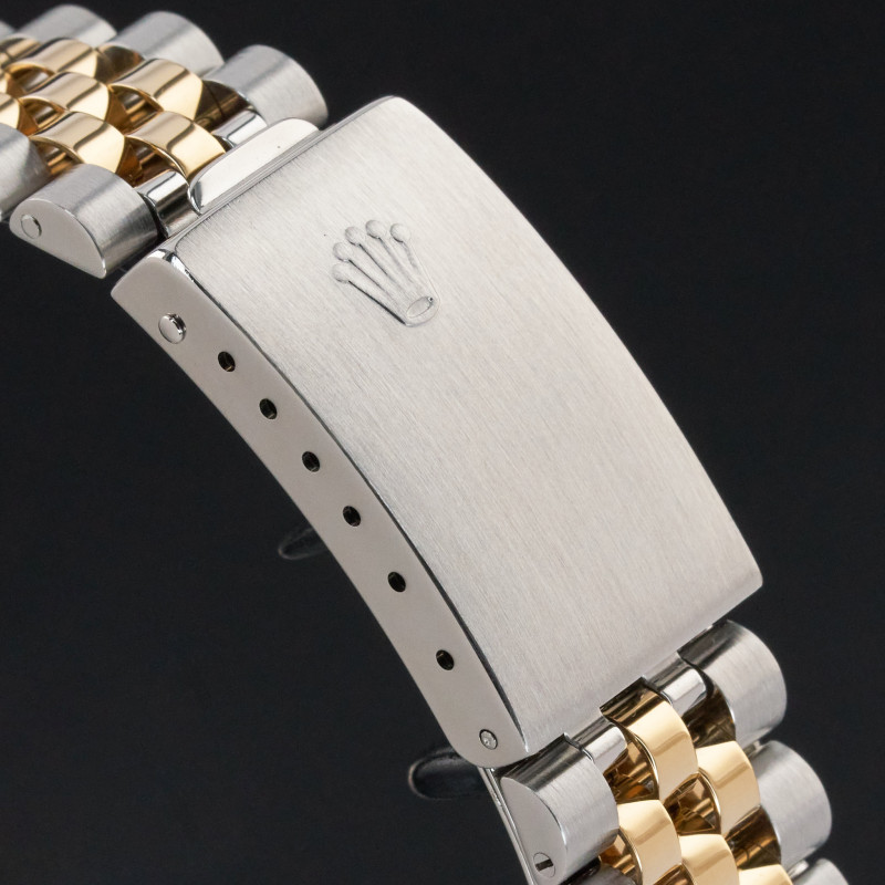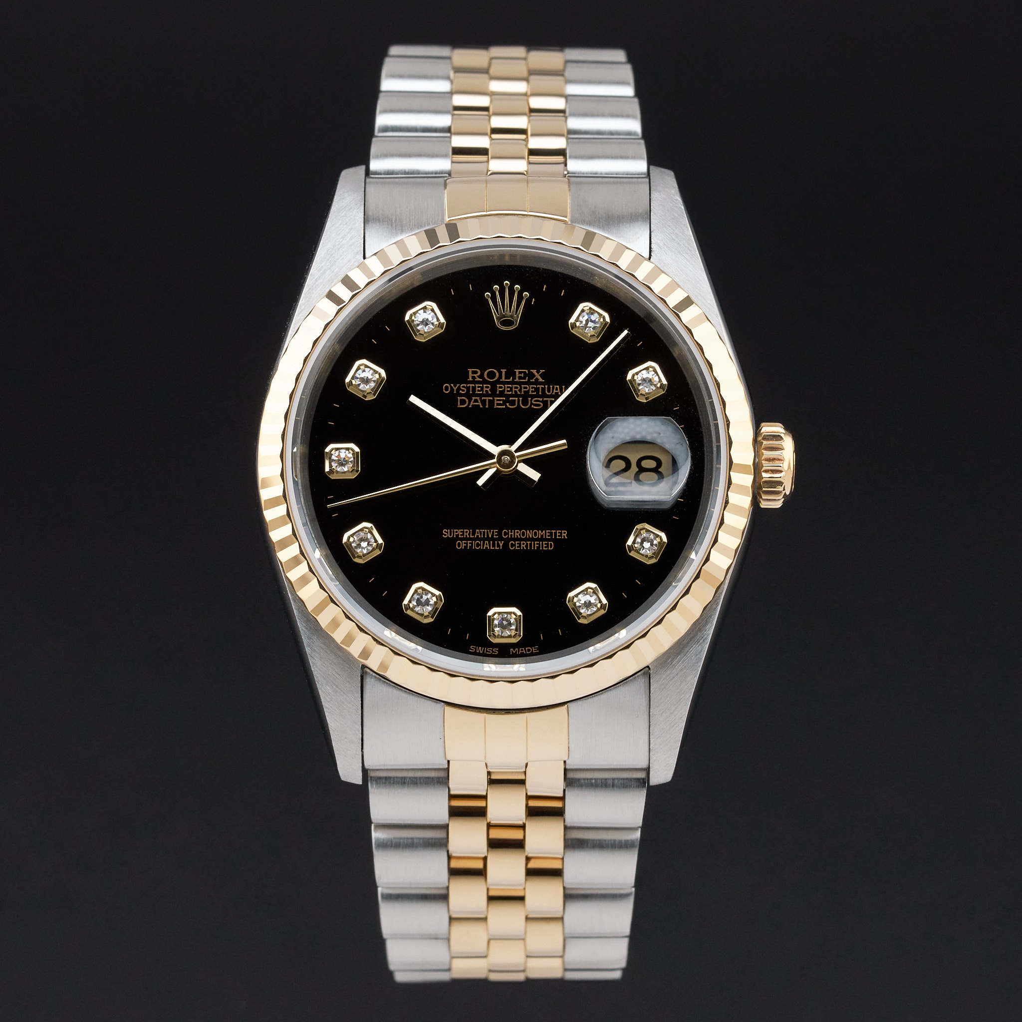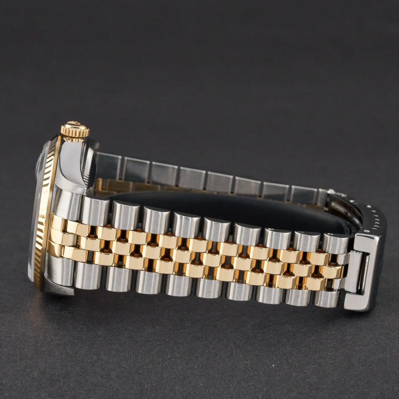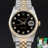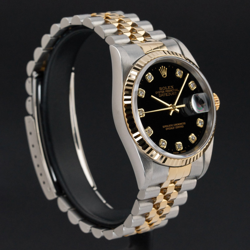 This Rolex Datejust 16233 features a Black big diamond dial and is crafted from 18K yellow gold and stainless steel, with a production year of 1996.