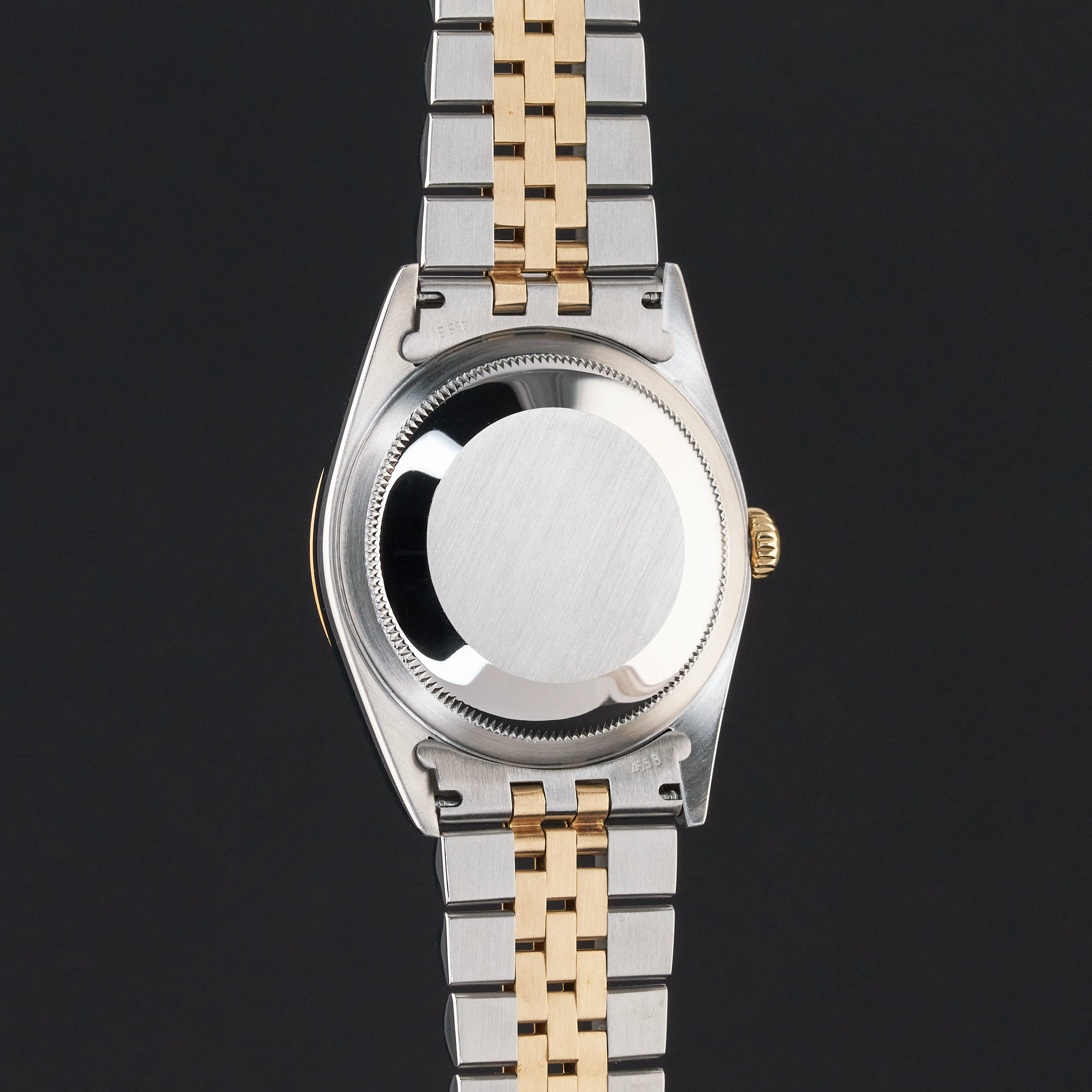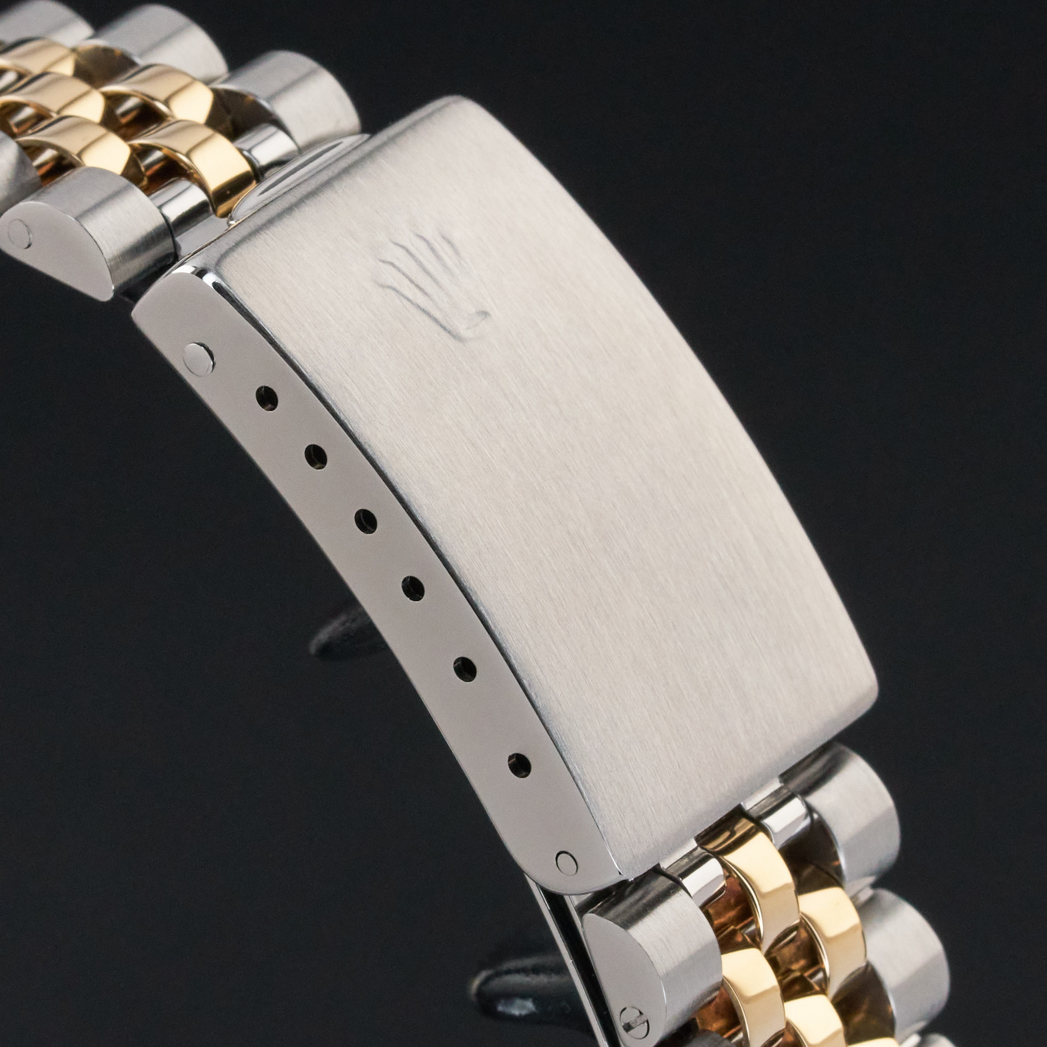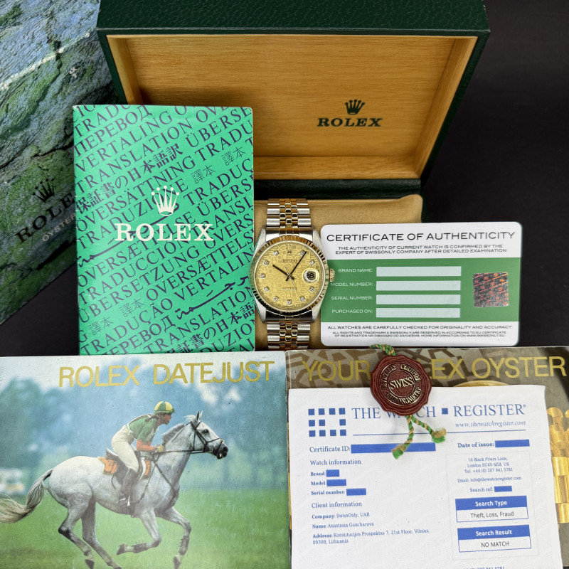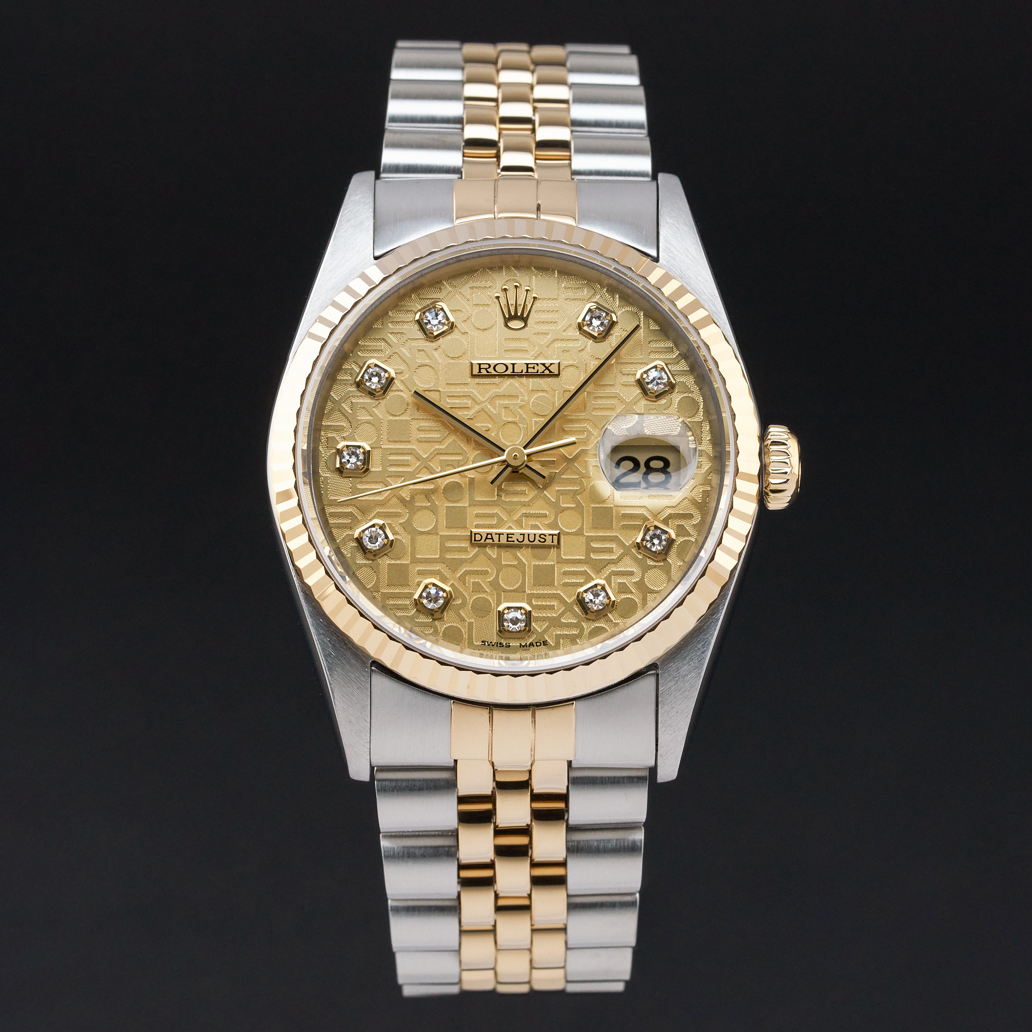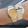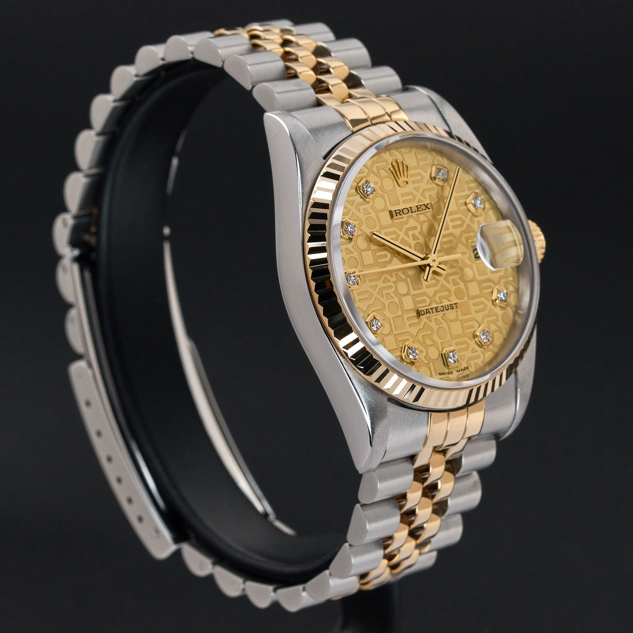 This Rolex Datejust 16233 features a Champagne jubilee big diamond dial and is crafted from 18K yellow gold and stainless steel, with a production year of 1996.