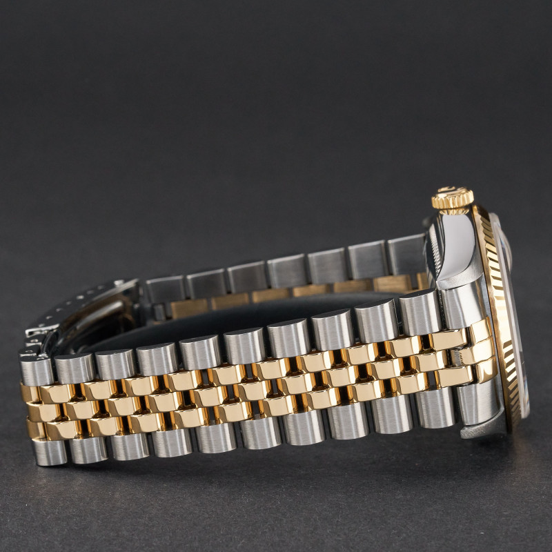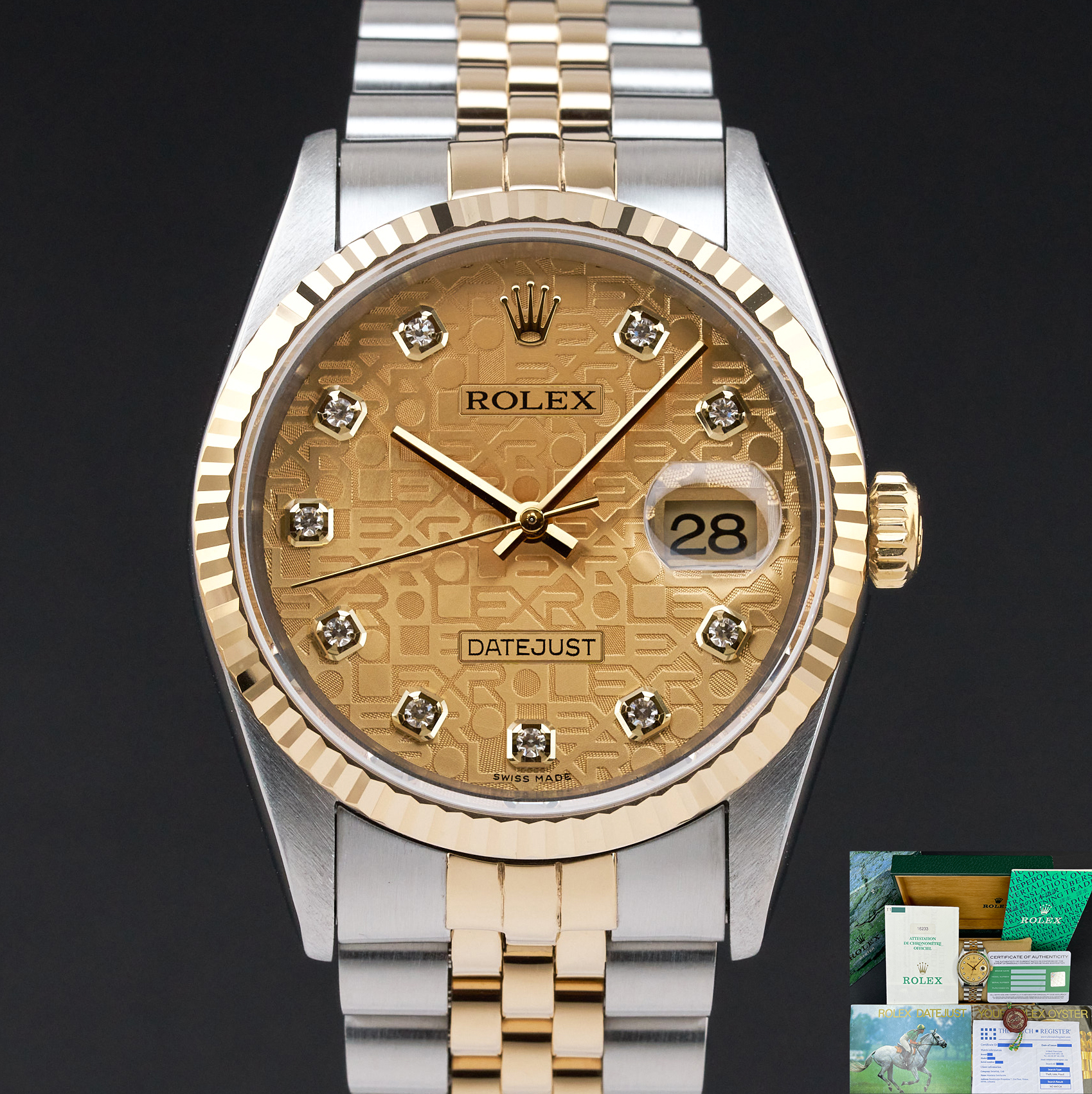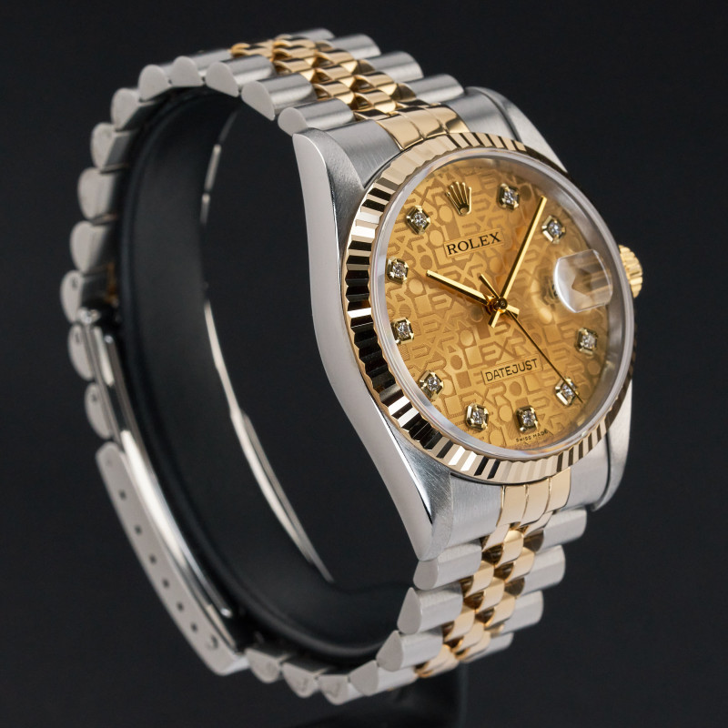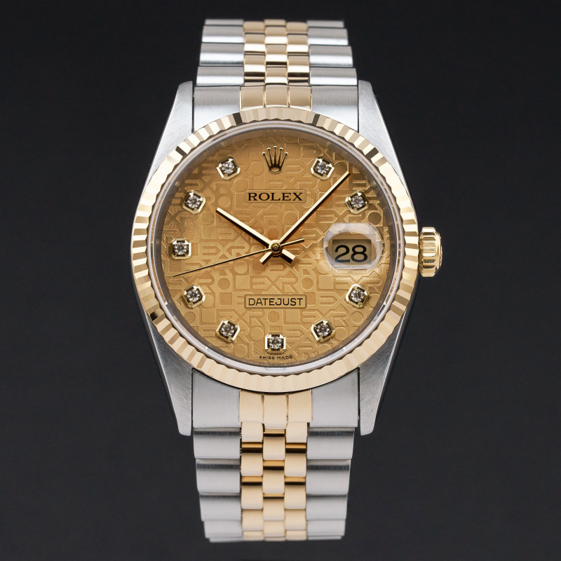 This Rolex Datejust 16233 features a Champagne jubilee big diamond dial and is crafted from 18K yellow gold and stainless steel, with a production year of 1996.