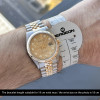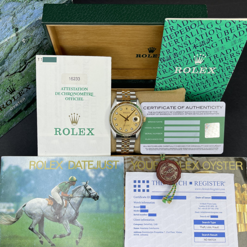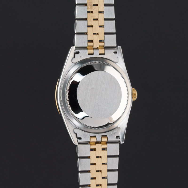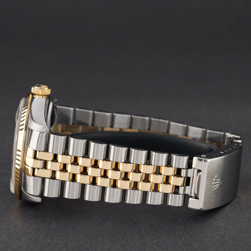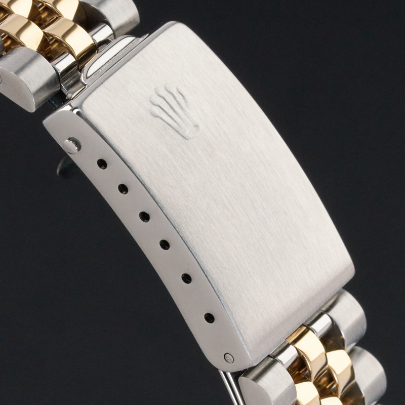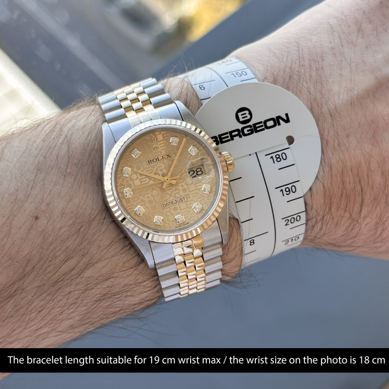 This Rolex Datejust 16233 features a Champagne jubilee big diamond dial and is crafted from 18K yellow gold and stainless steel, with a production year of 1996.