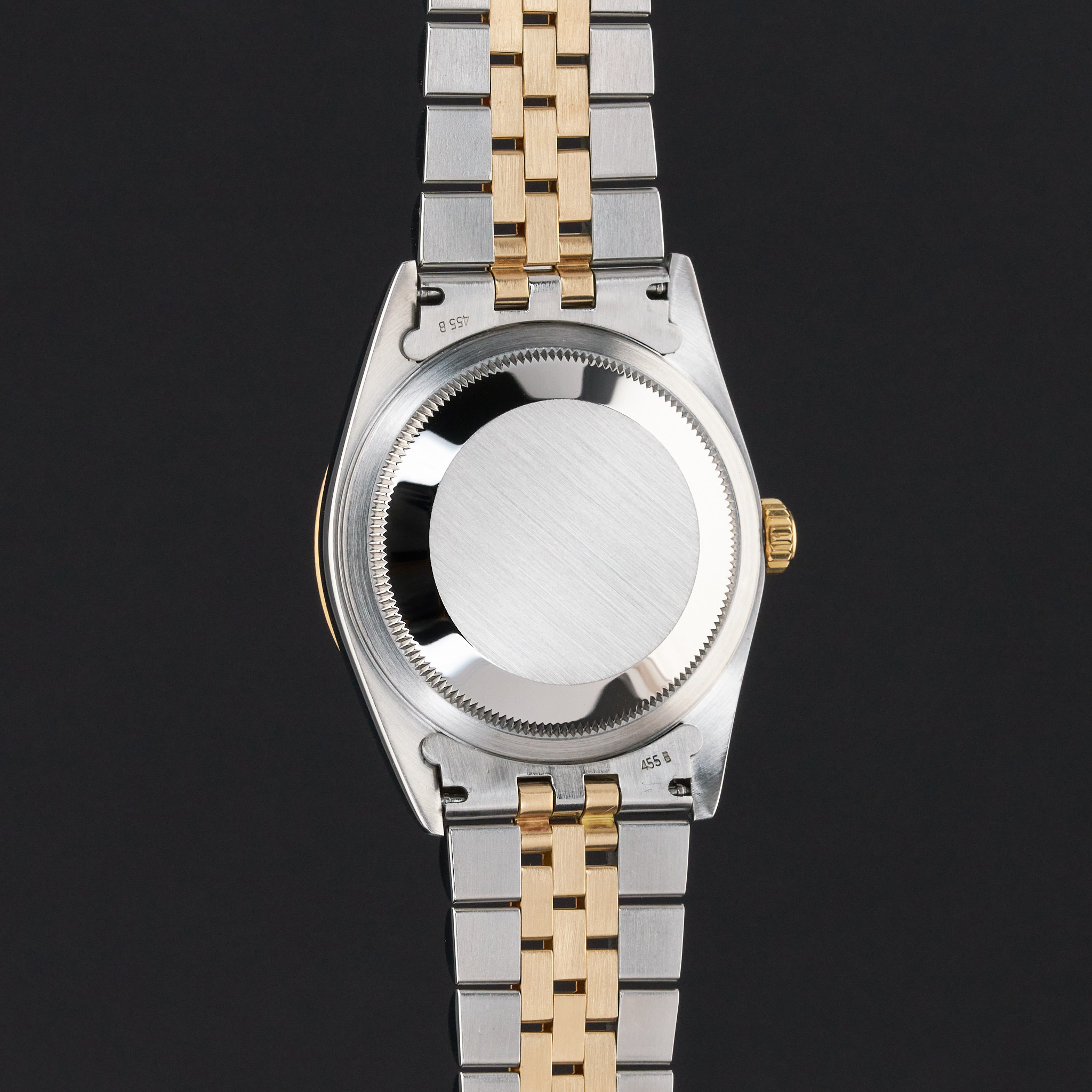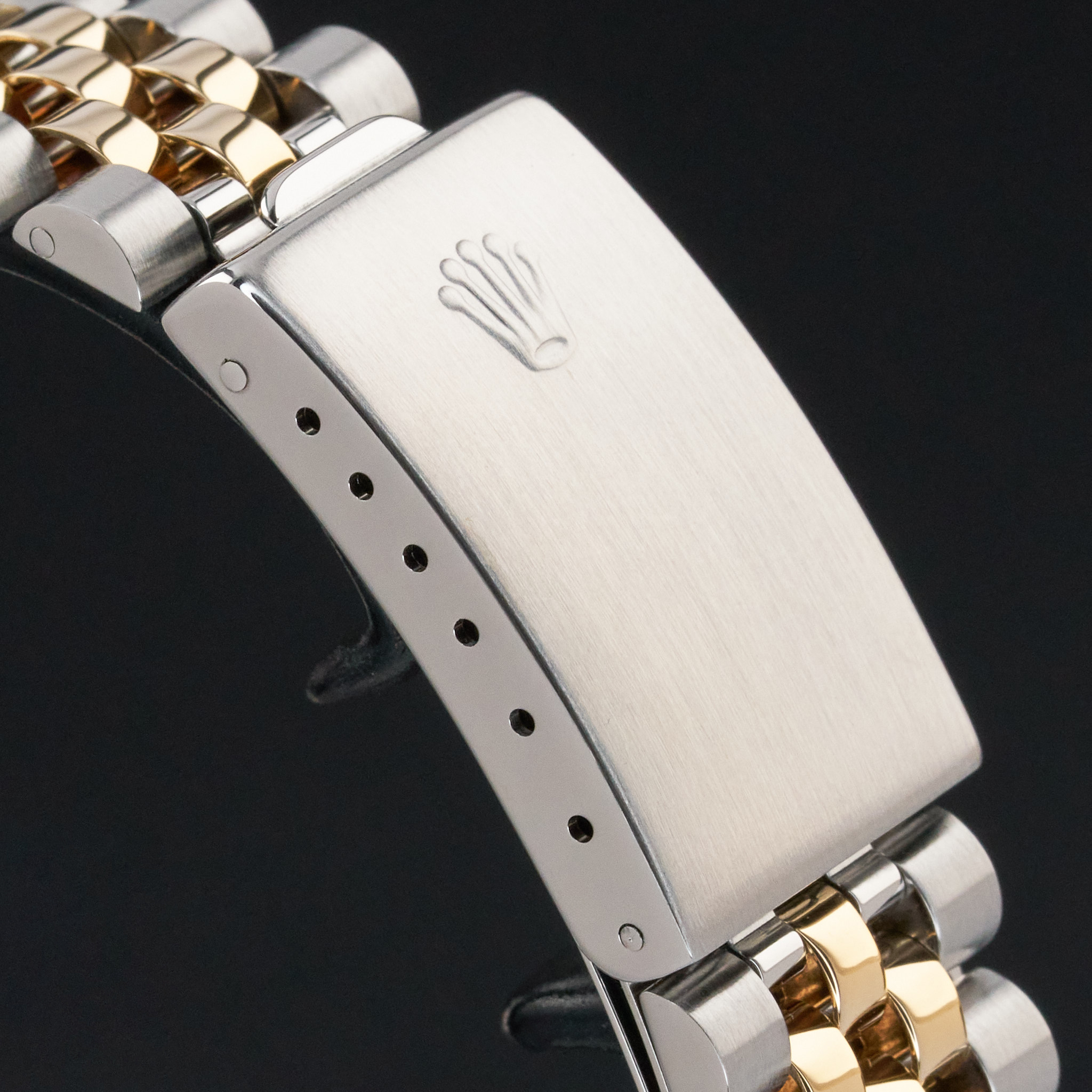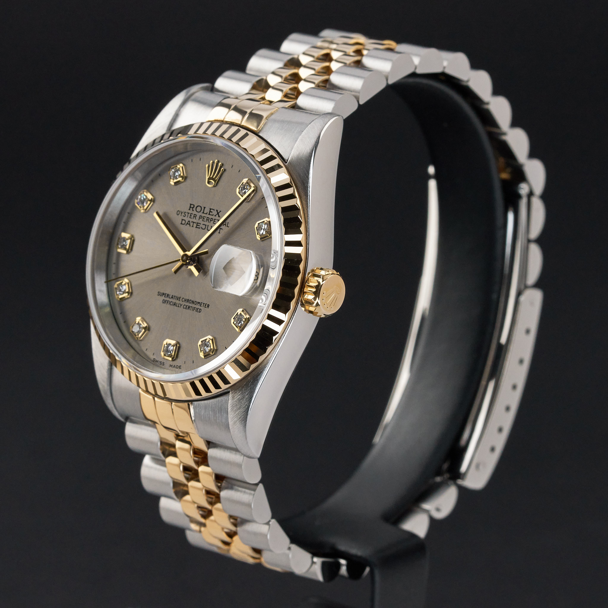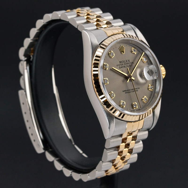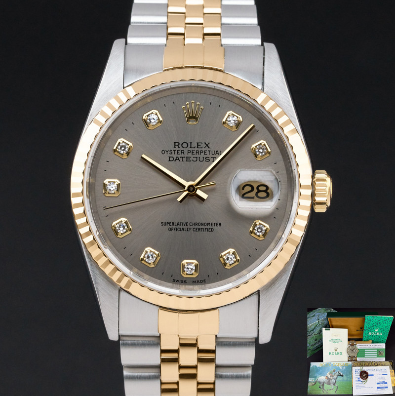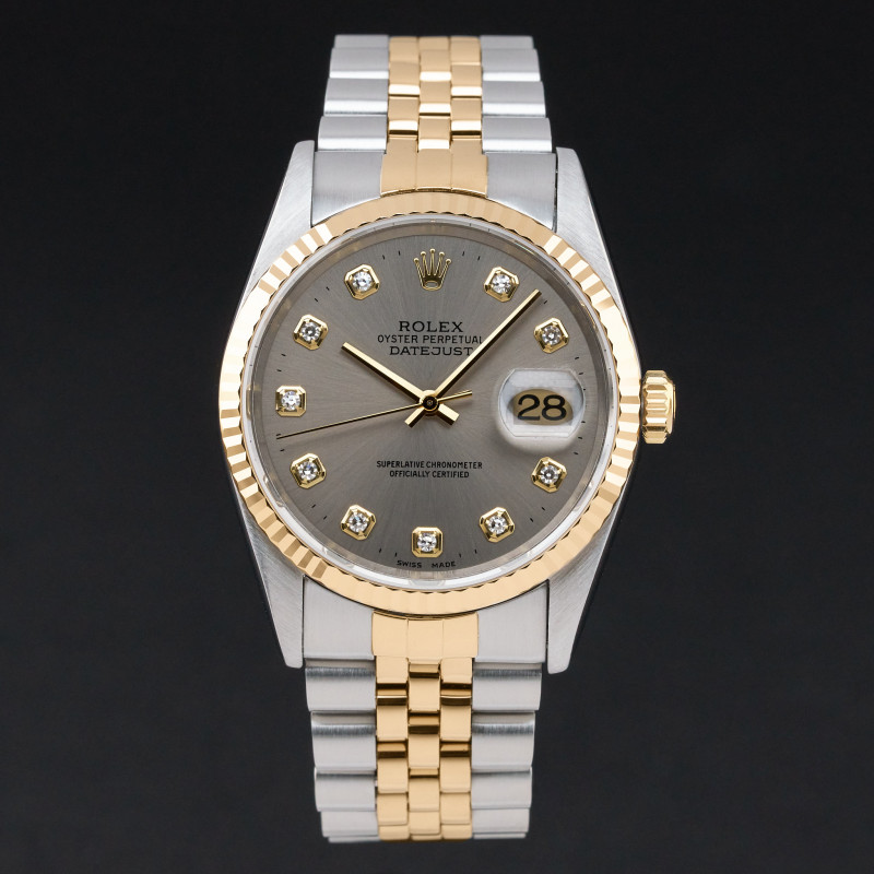 This Rolex Datejust 16233 features a Grey big diamond dial and is crafted from 18K yellow gold and stainless steel, with a production year of 1996.