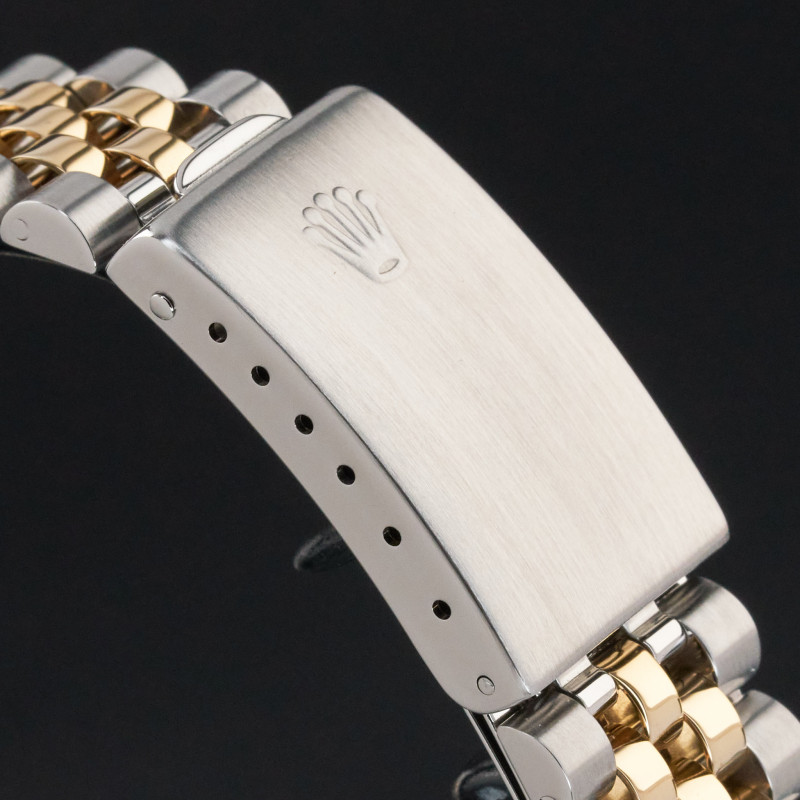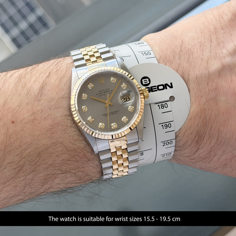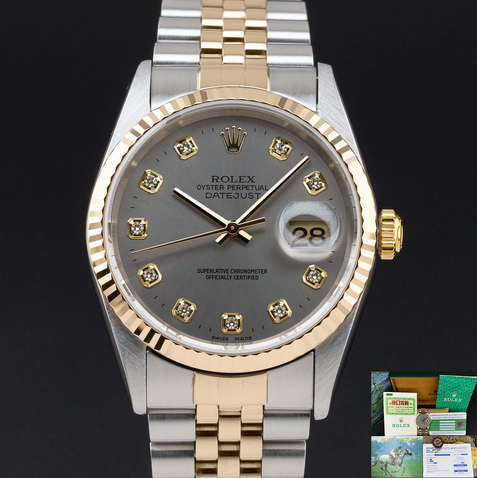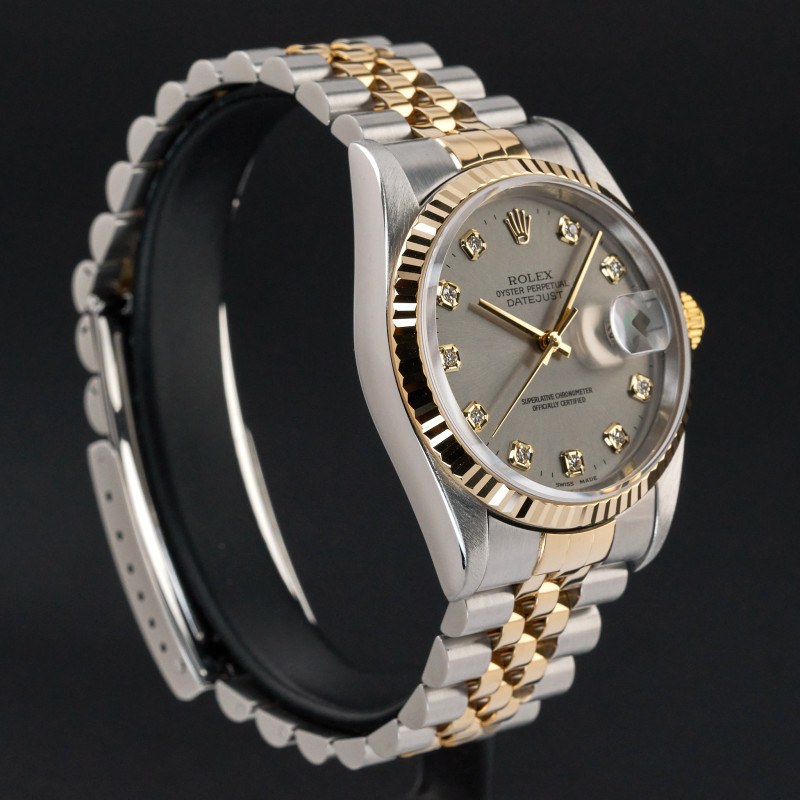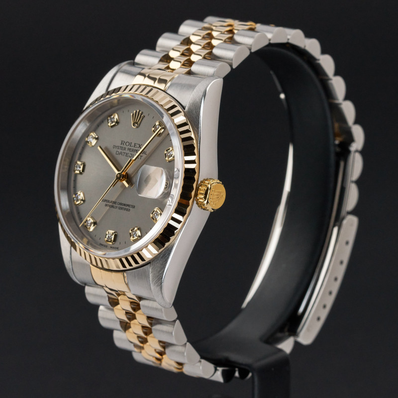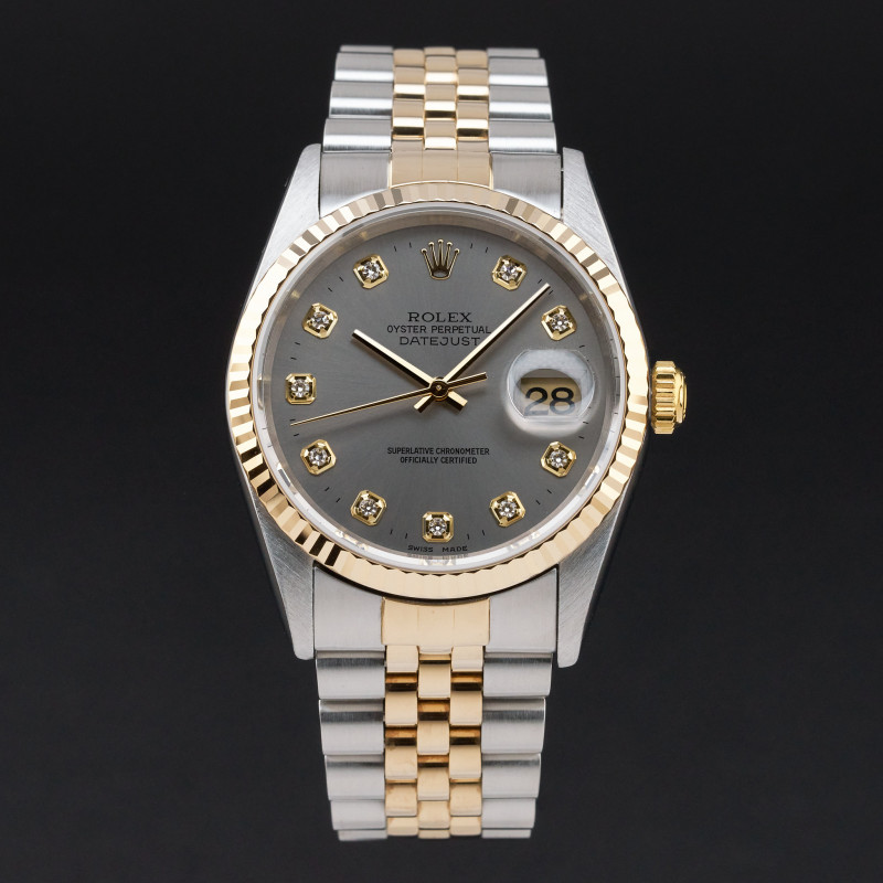 This Rolex Datejust 16233 features a Grey big diamond dial and is crafted from 18K yellow gold and stainless steel, with a production year of 1996.