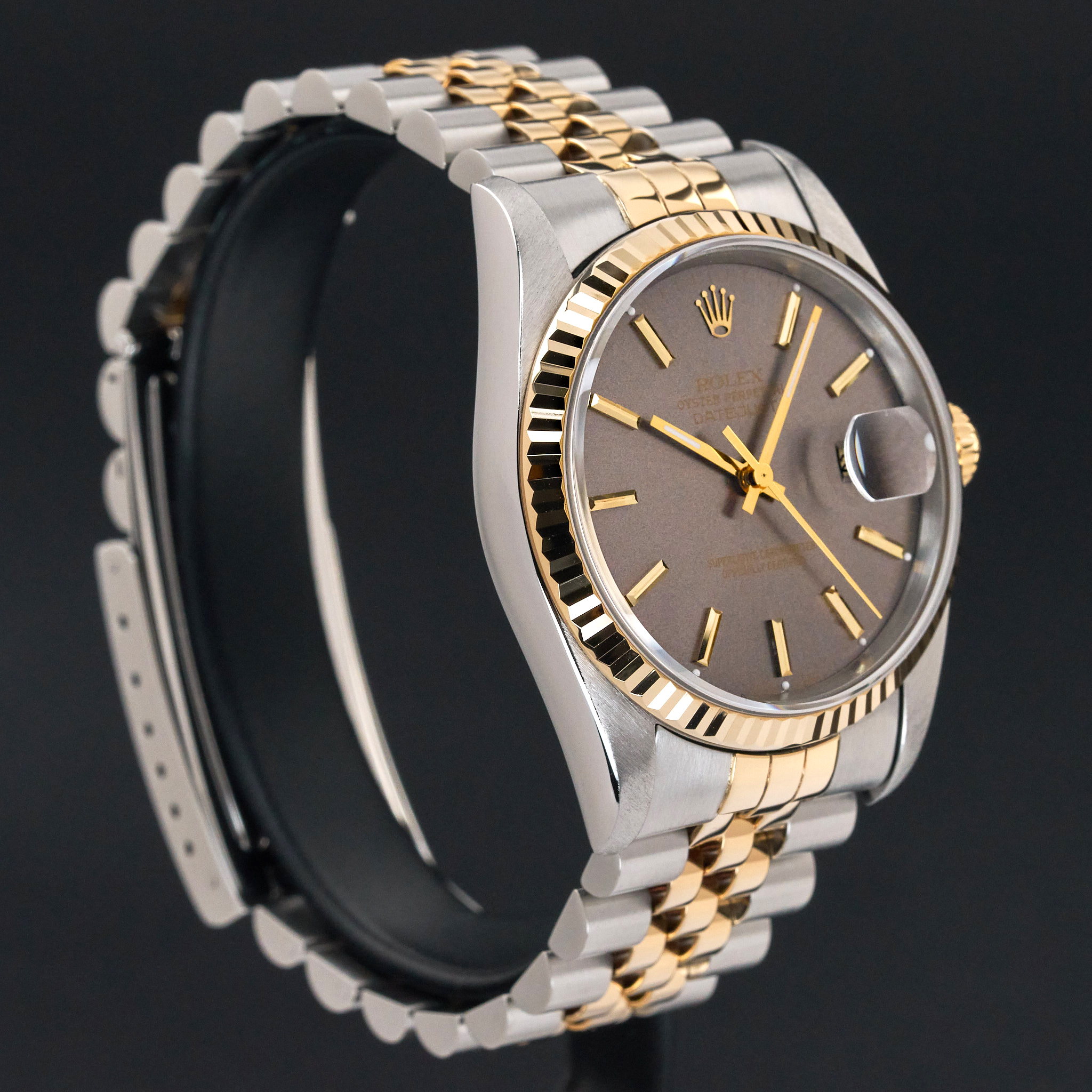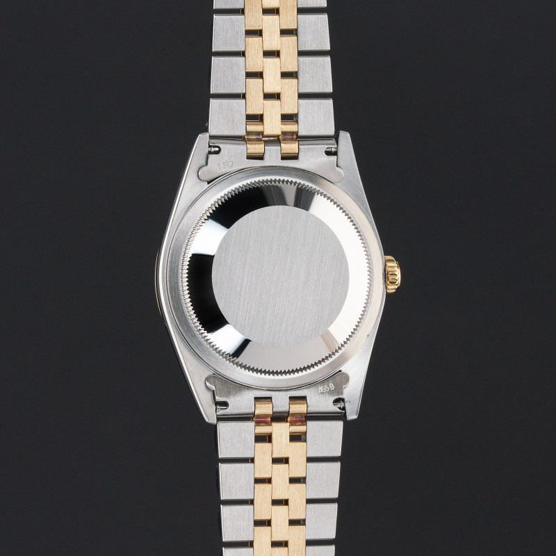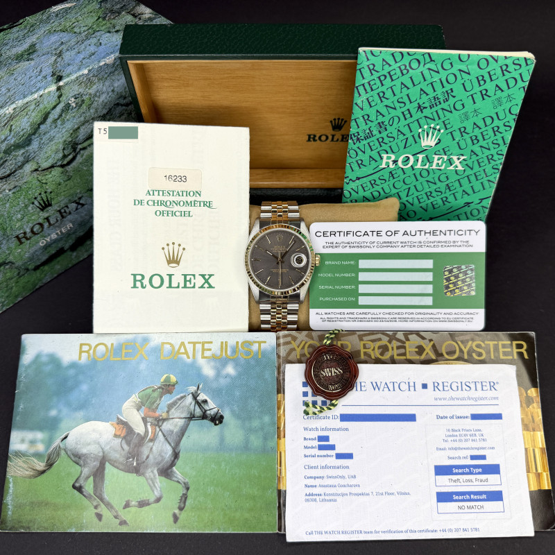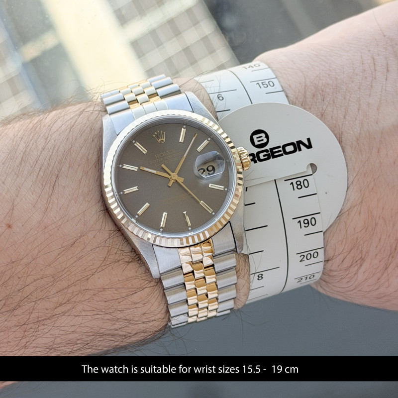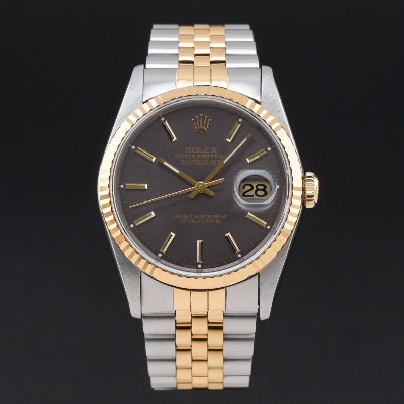 This Rolex Datejust 16233 features a Grey dial and is crafted from 18K yellow gold and stainless steel, with a production year of 1996.