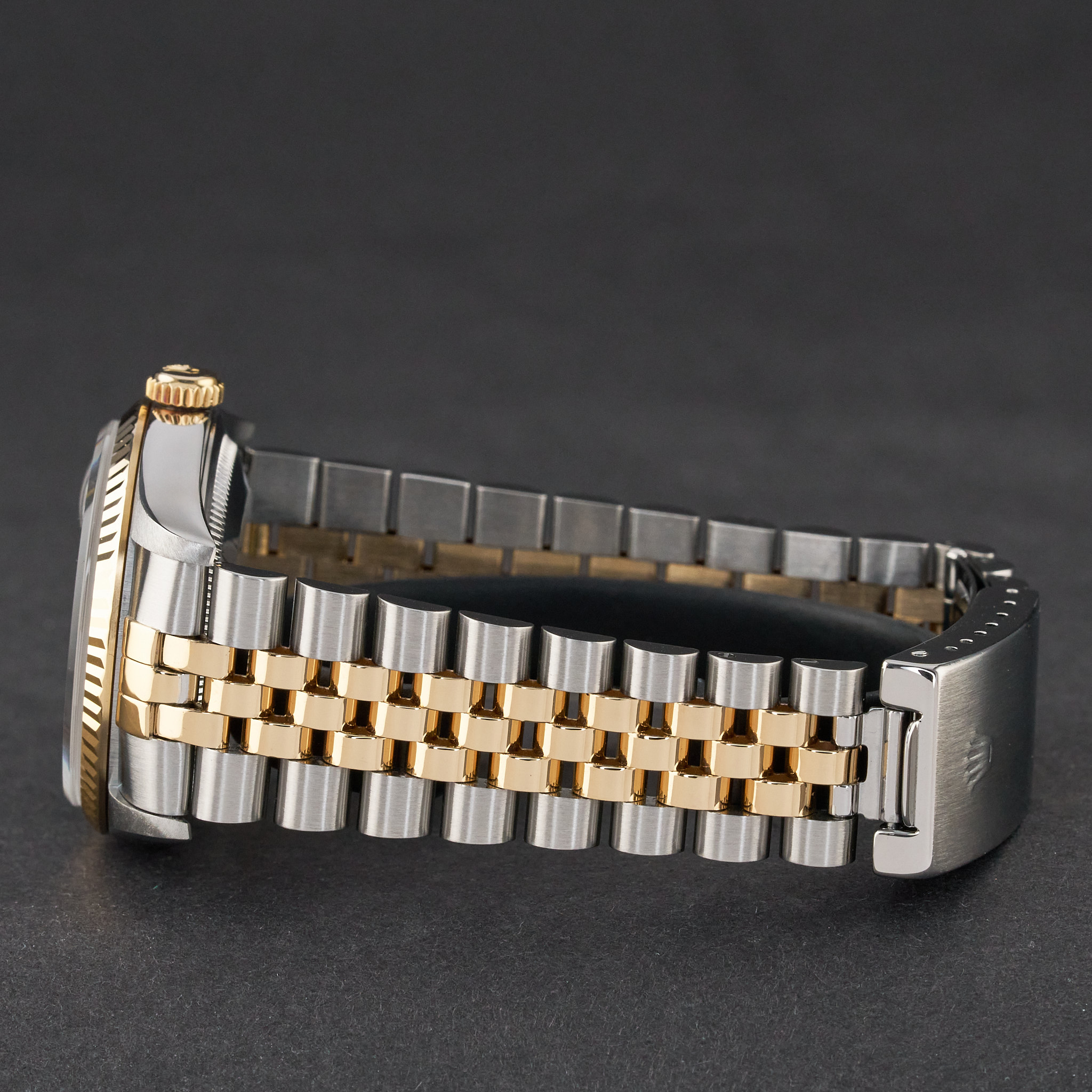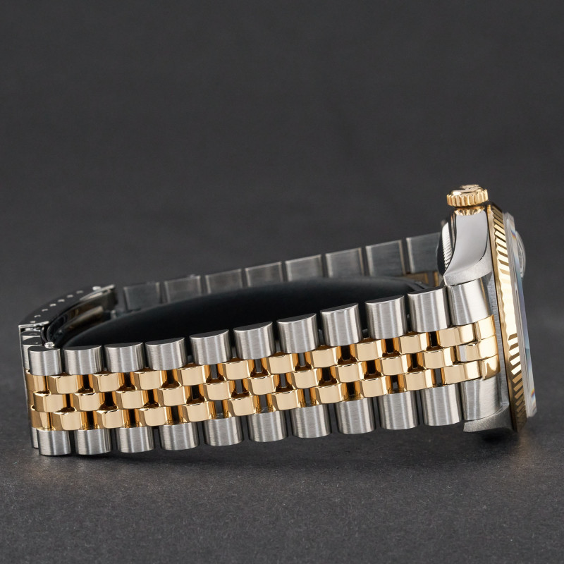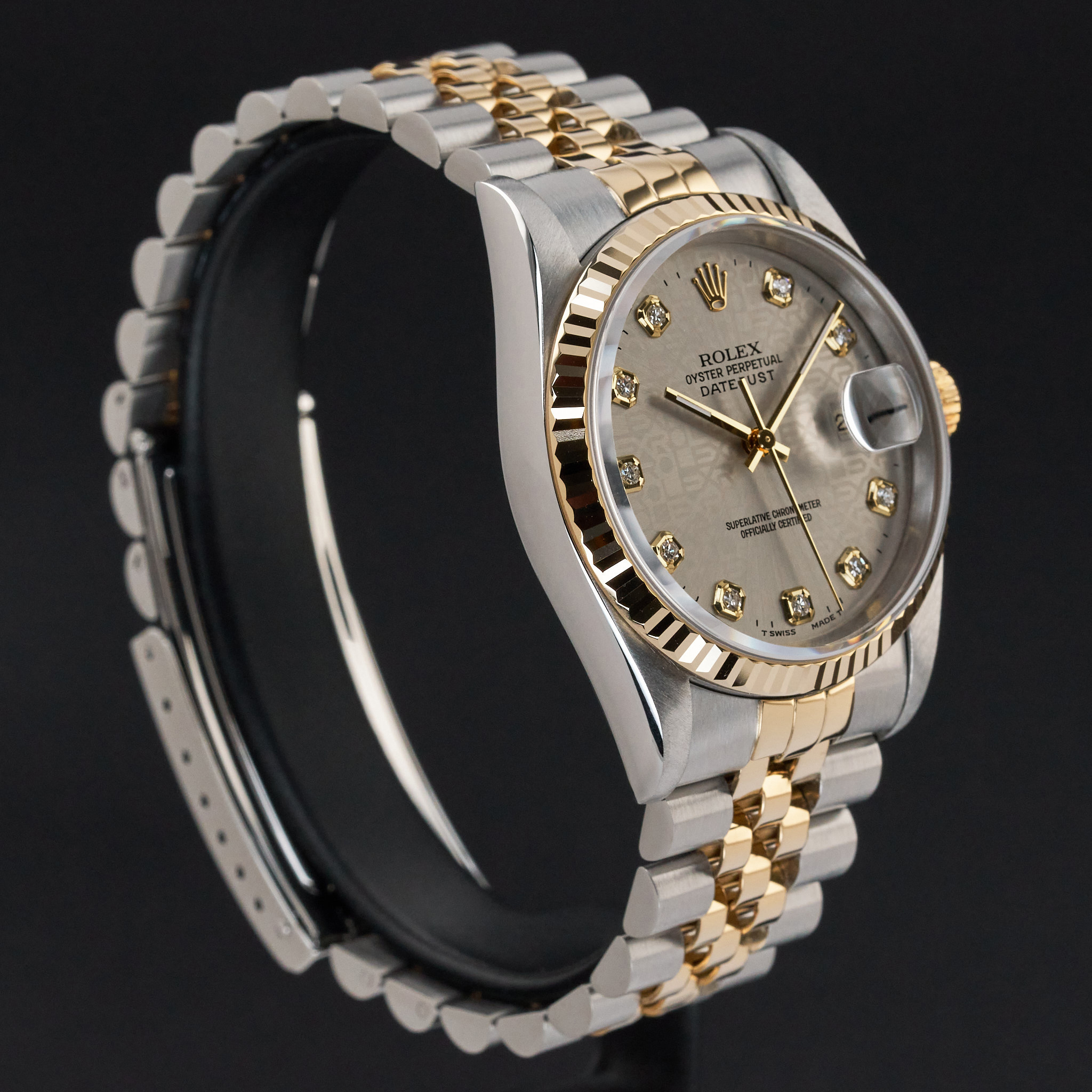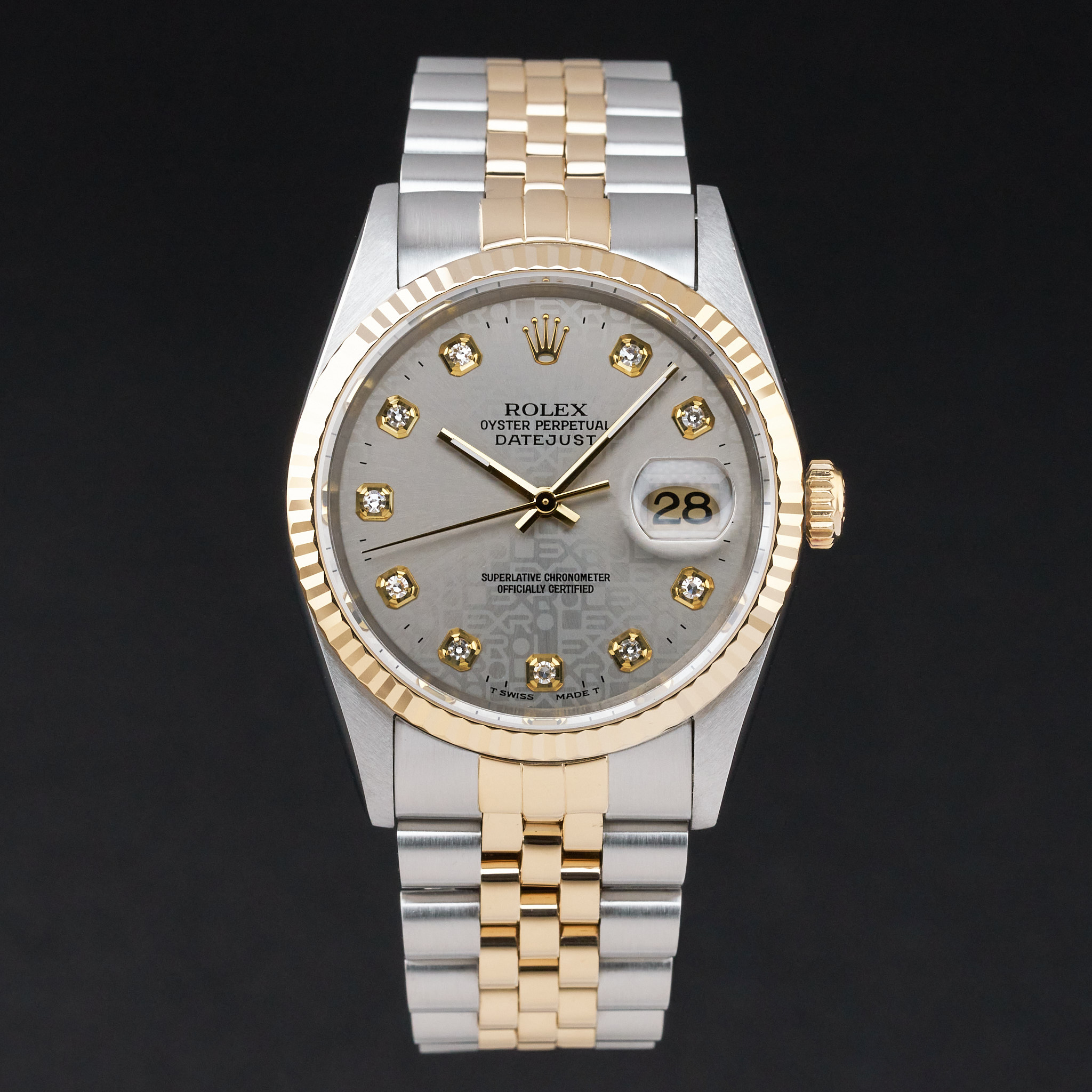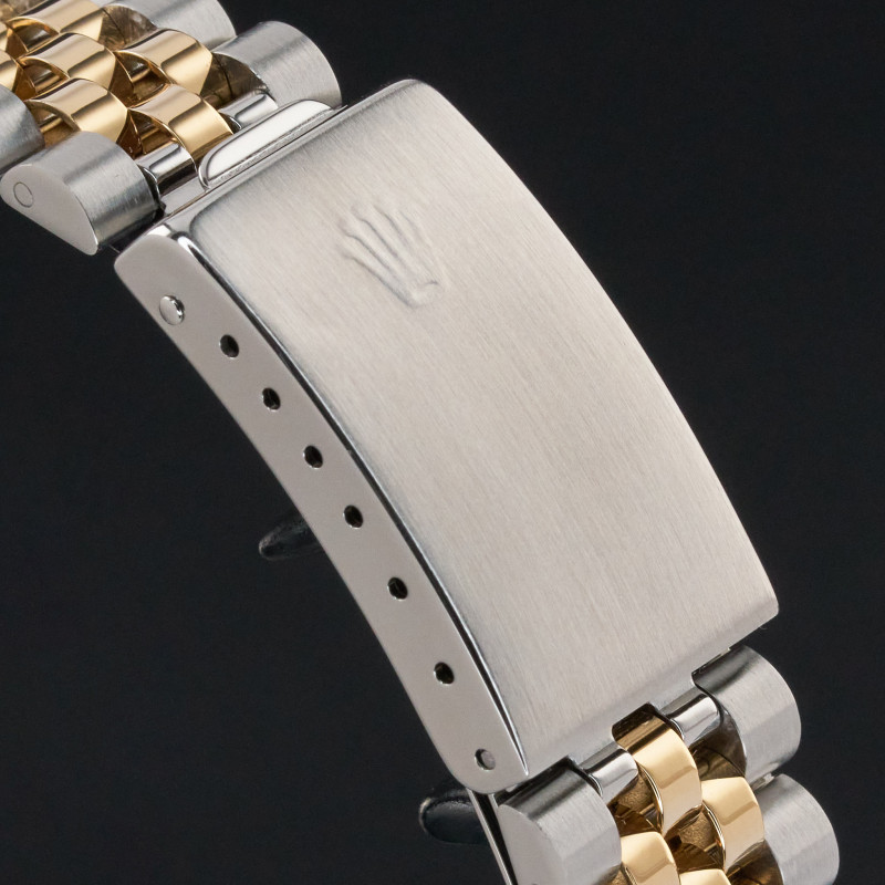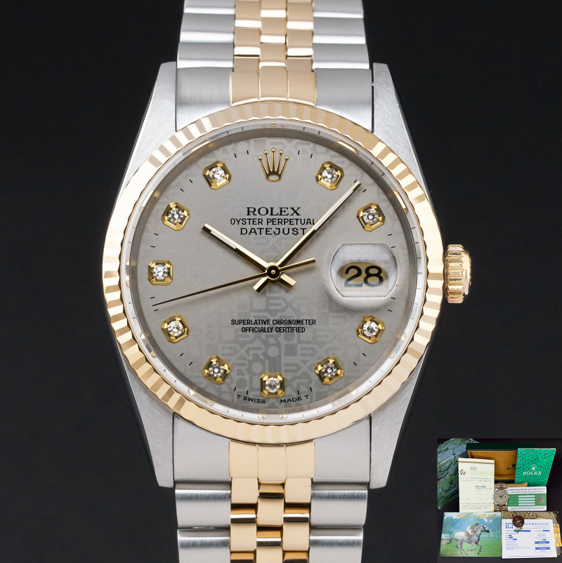 This Rolex Datejust 16233 features a Grey big diamond dial and is crafted from 18K yellow gold and stainless steel, with a production year of 1996.