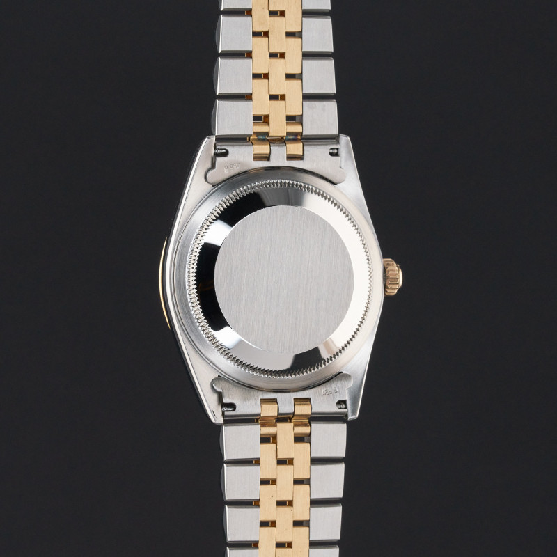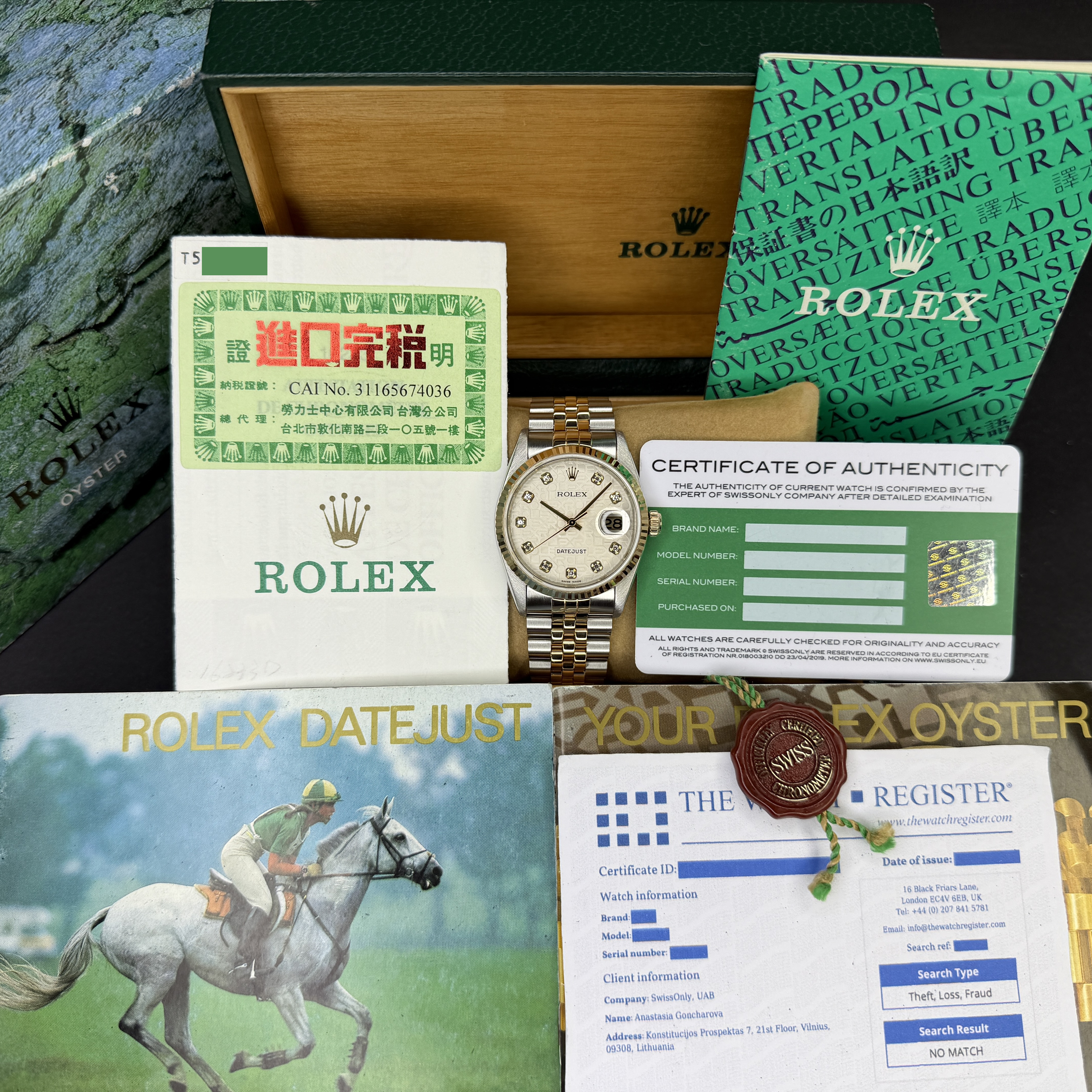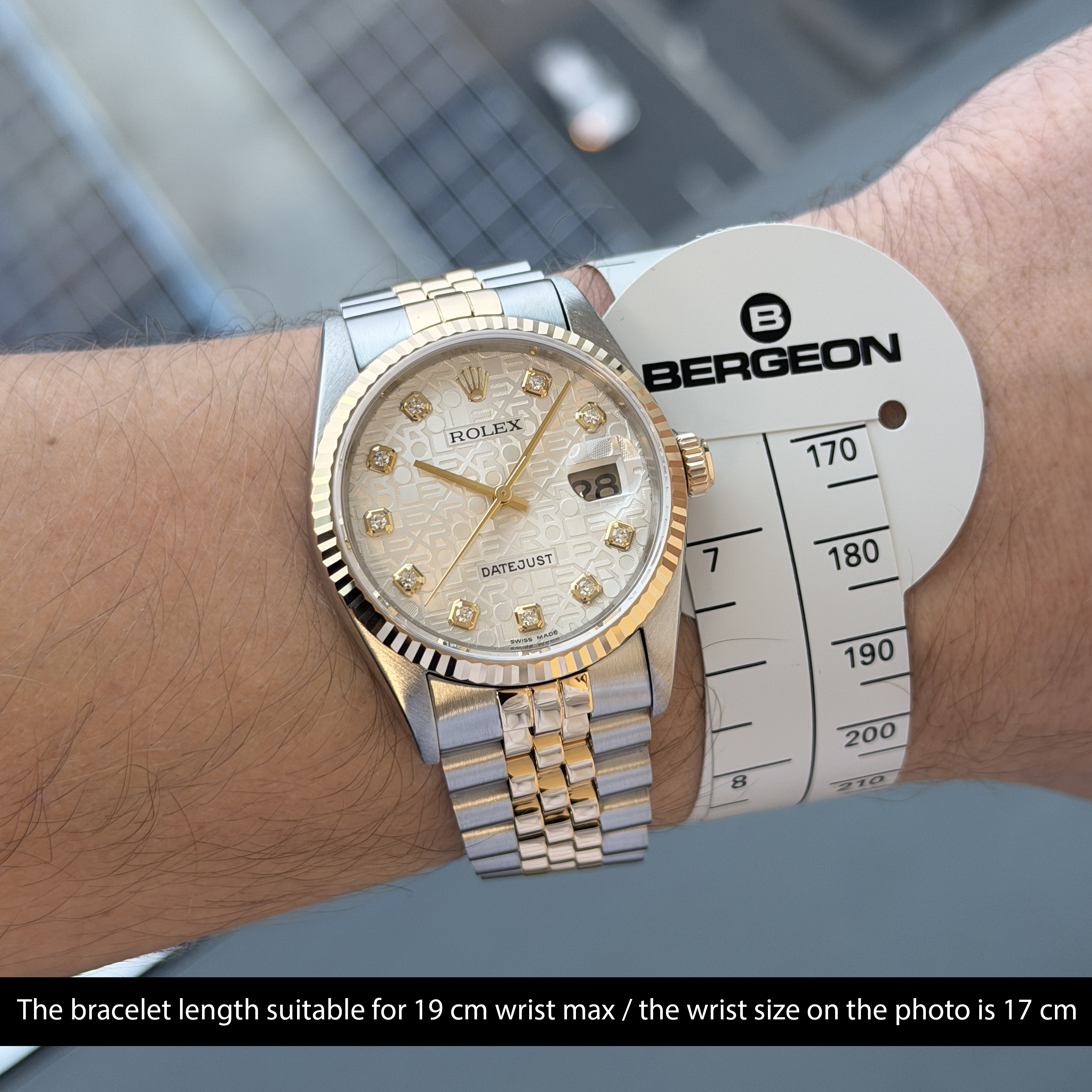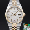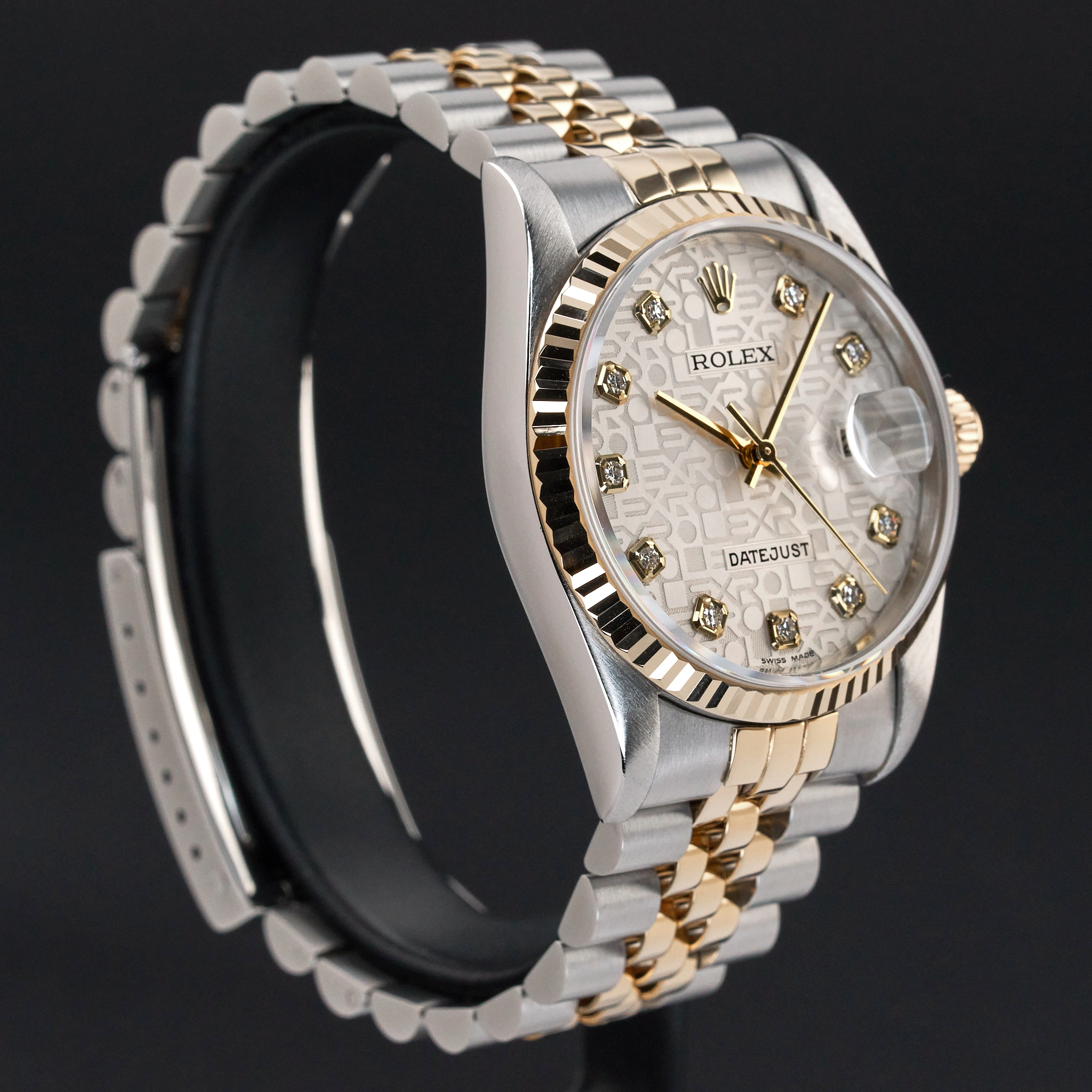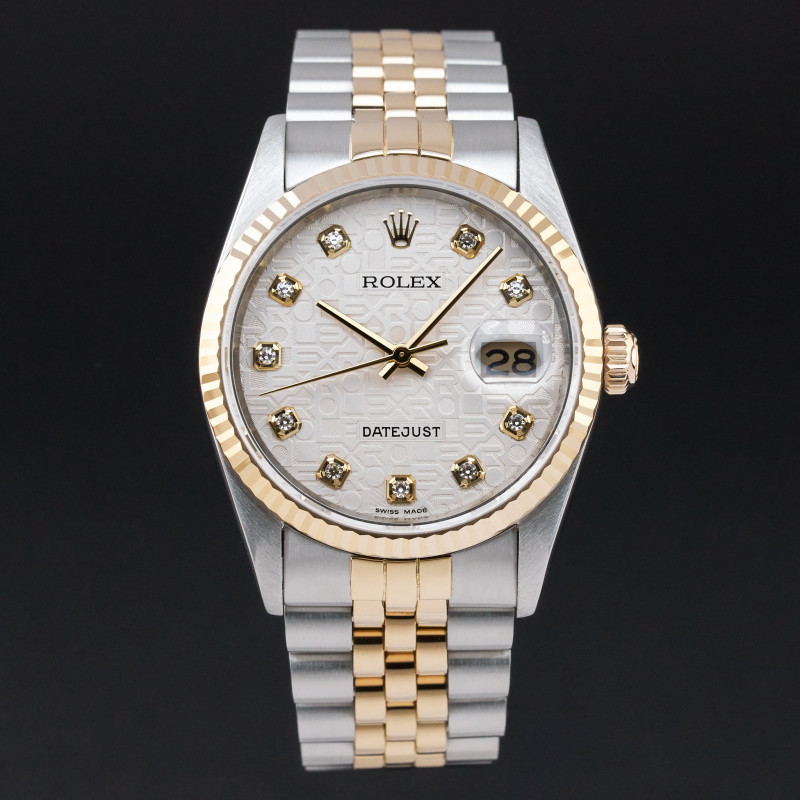 This Rolex Datejust 16233 features a Silver jubilee big diamond dial and is crafted from 18K yellow gold and stainless steel, with a production year of 1996.