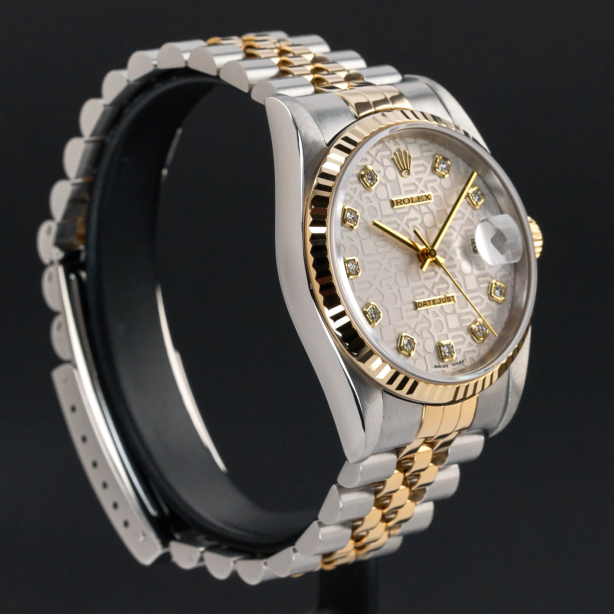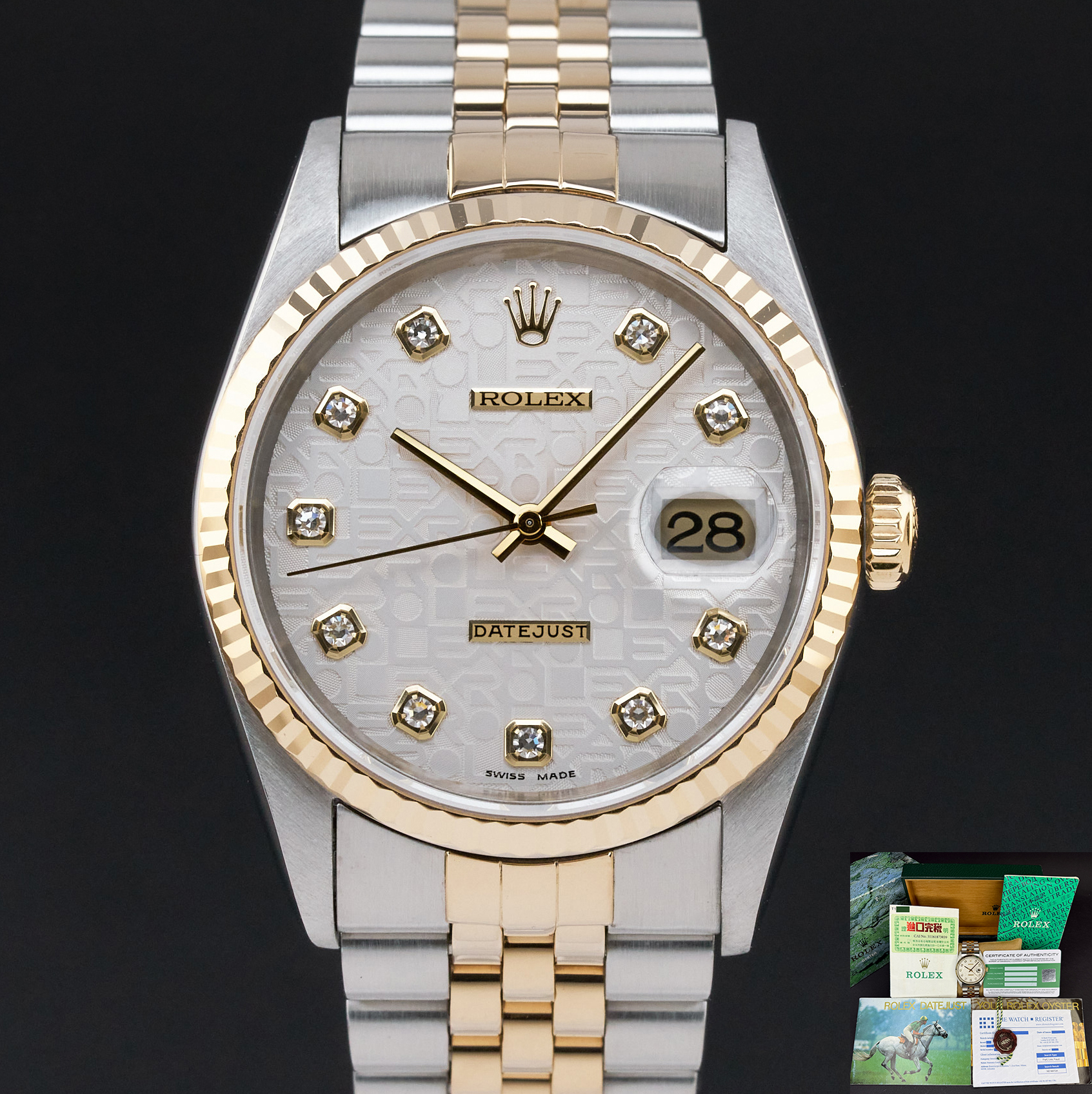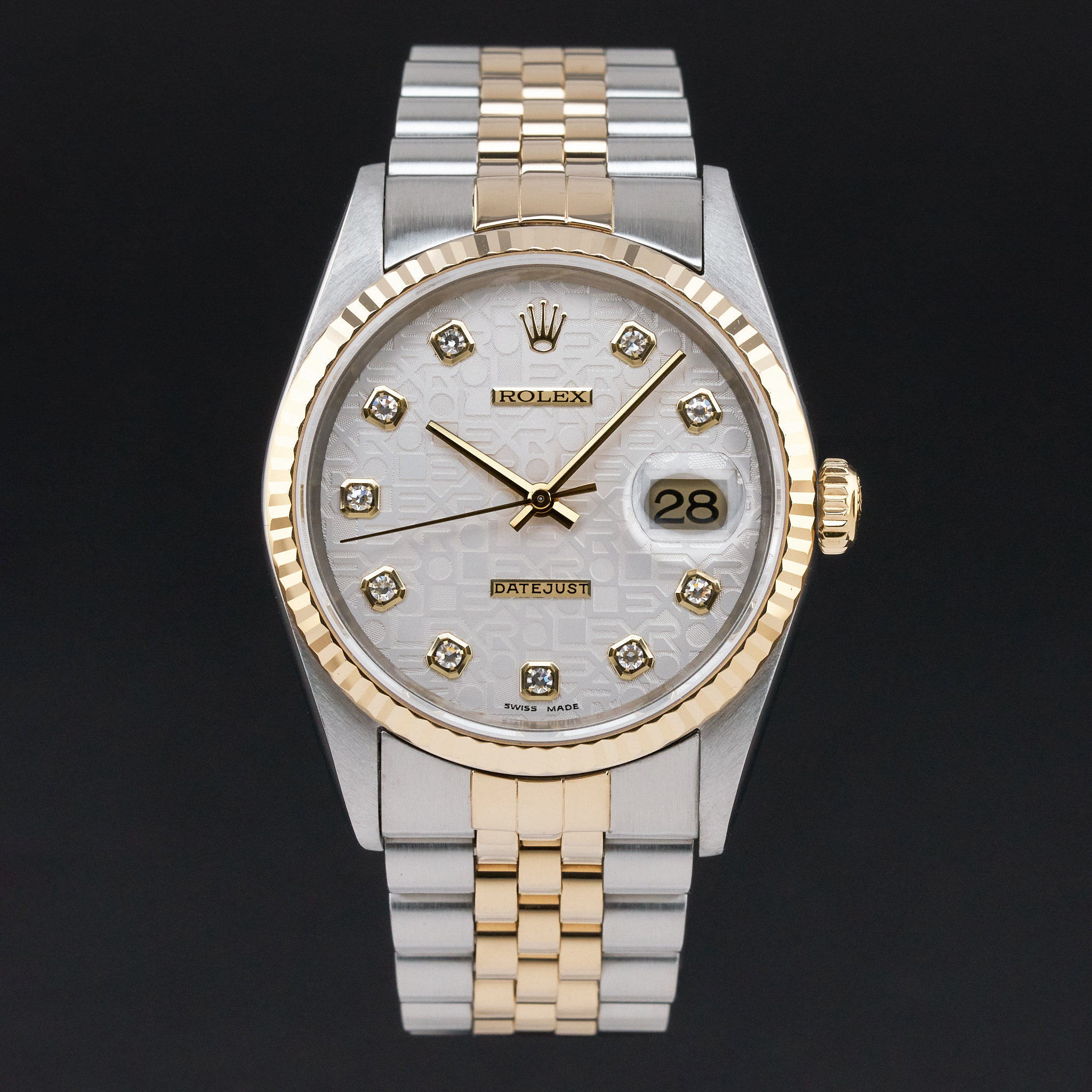 This Rolex Datejust 16233 features a Silver jubilee big diamond dial and is crafted from 18K yellow gold and stainless steel, with a production year of 1996.