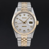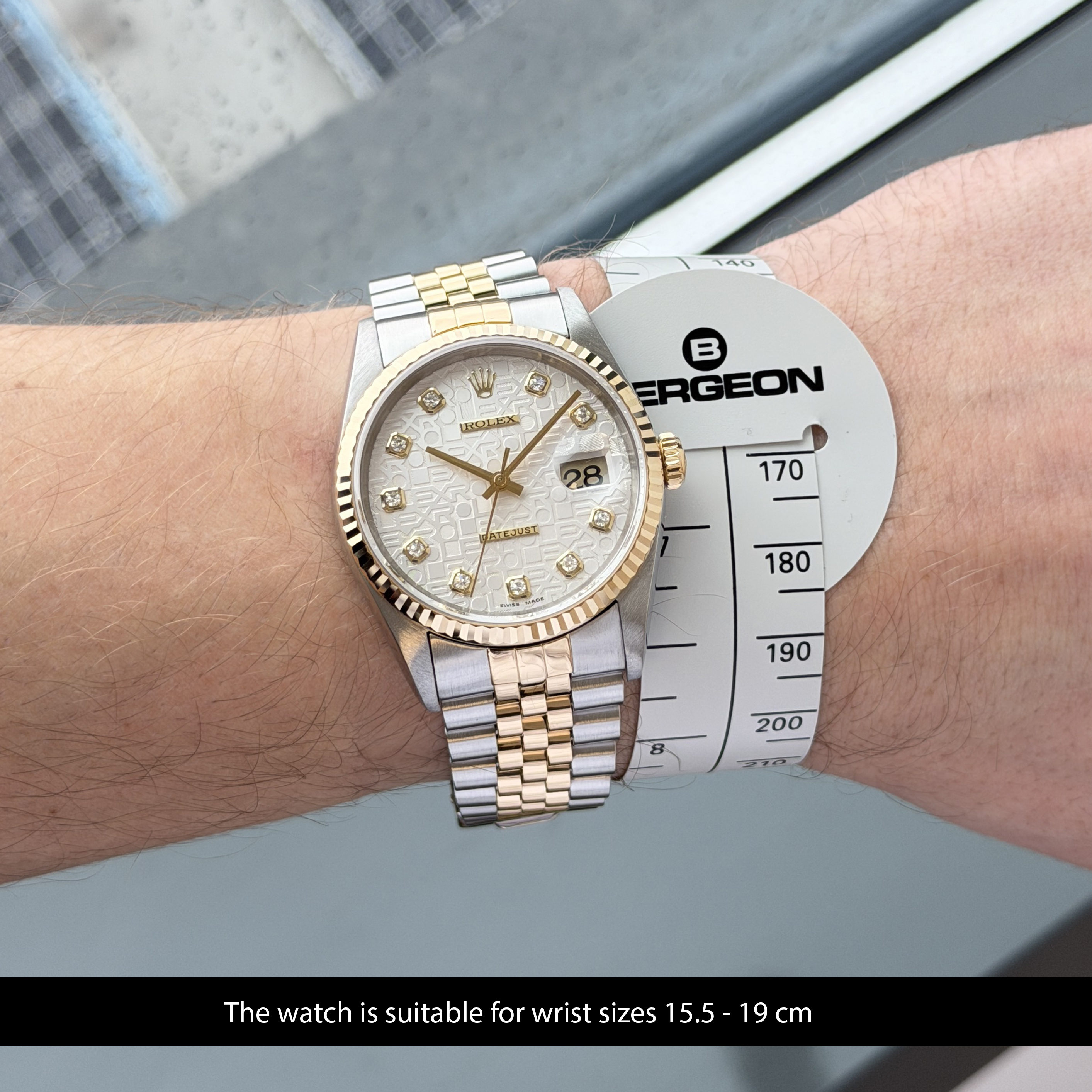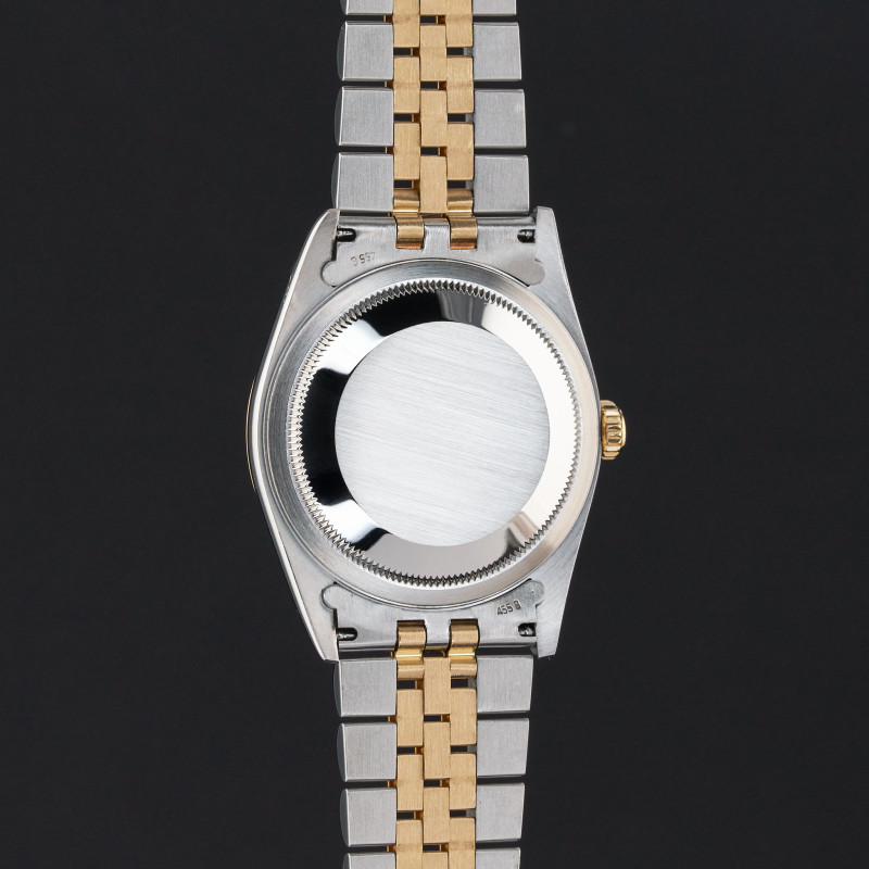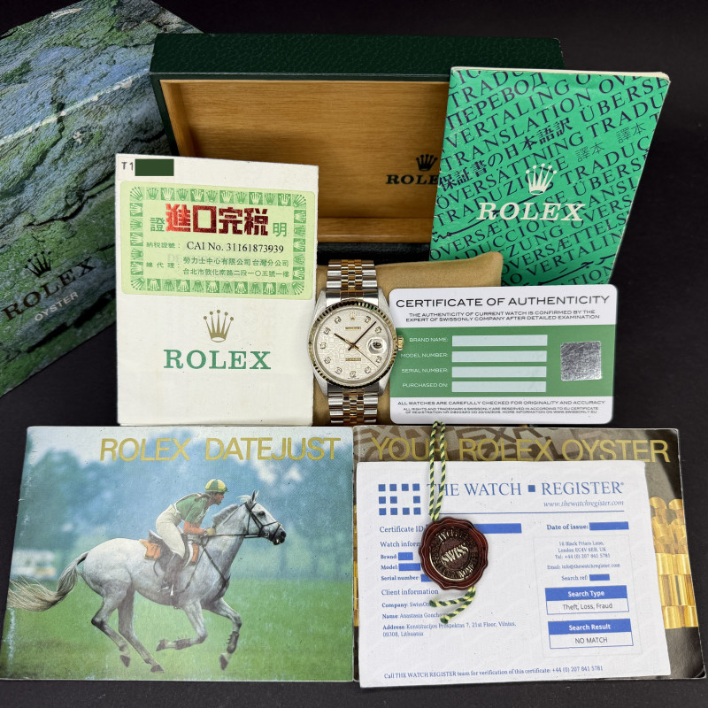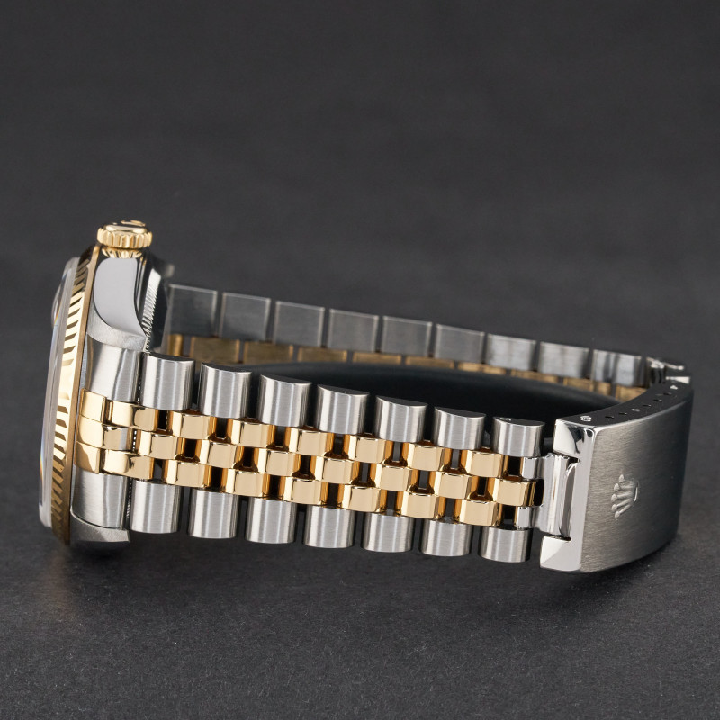 This Rolex Datejust 16233 features a Silver jubilee big diamond dial and is crafted from 18K yellow gold and stainless steel, with a production year of 1996.